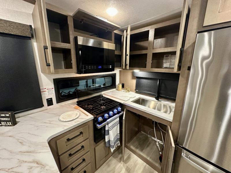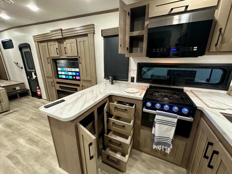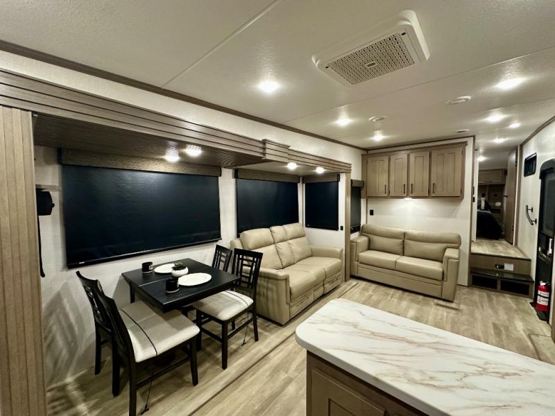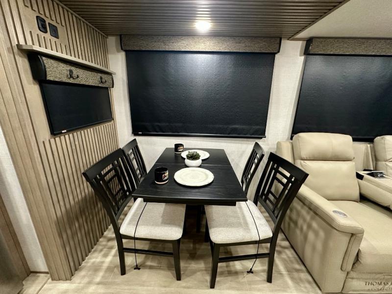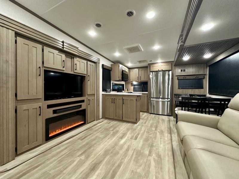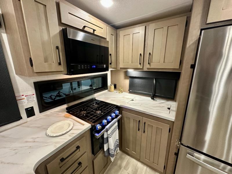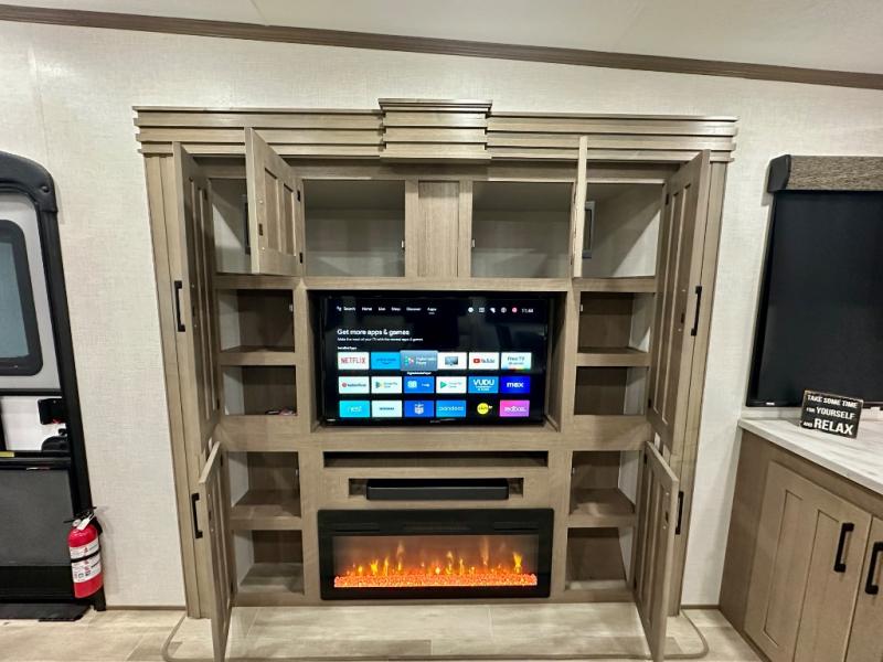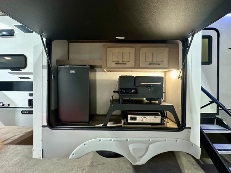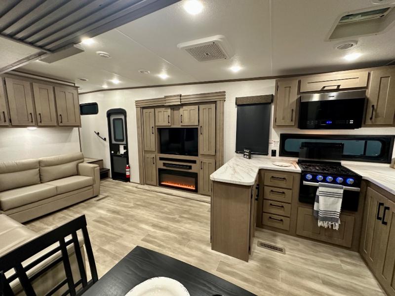 Escape the hustle and bustle of city life for weekends in this cozy fifth wheel. The dual opposing slides in the main living area will create an open floorplan, and you can choose an optional 40" fireplace here for a more at-home feel. There is also an entertainment center and a 43" Smart LED TV for movie night and a legless table, chairs, and a bench to dine at. If the weather is nice, head outdoors to relax under the 14' power awning while the chef of your group cooks on the outside kitchen with a pellet smoker. The rear kitchen inside features tons of counter space, an 18 cu. ft. house refrigerator, a drop-in cooktop, and a 24" microwave. And don't overlook the front private bedroom with its slide out wardrobe, a closet with washer and dryer prep, and a queen bed!