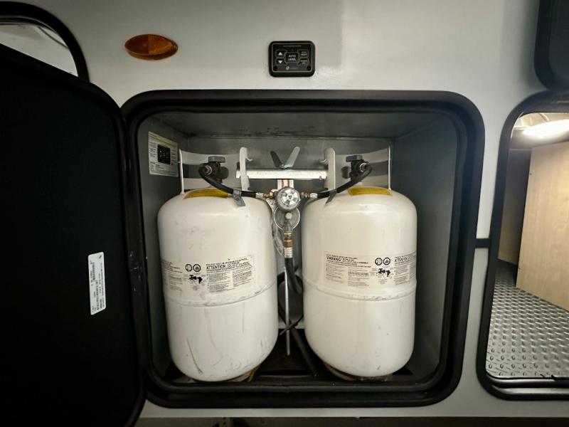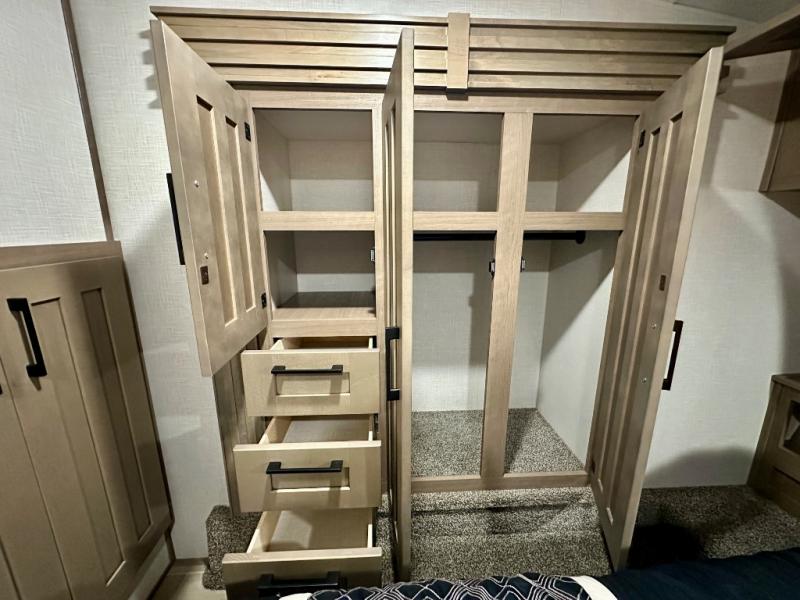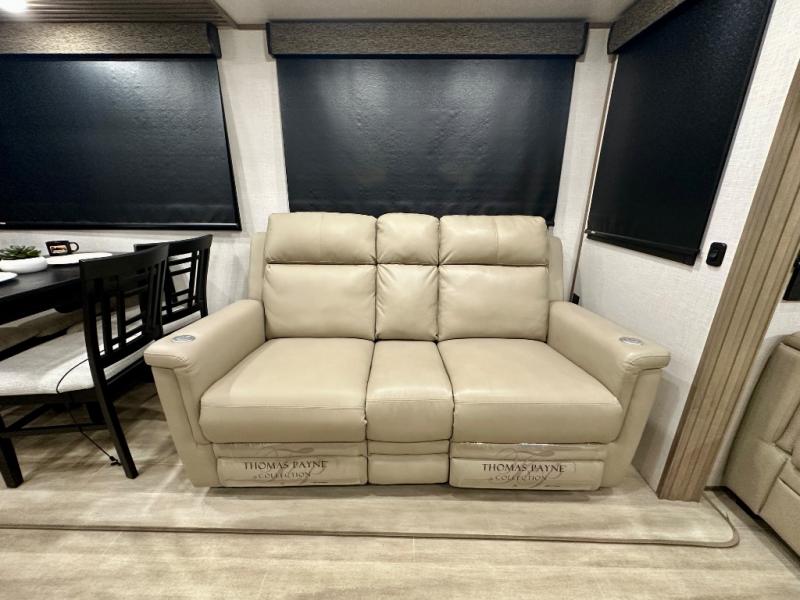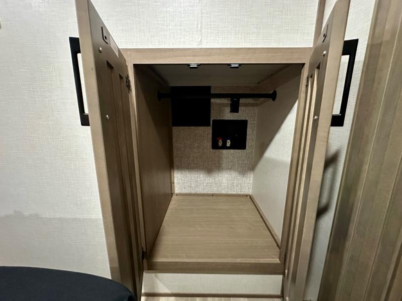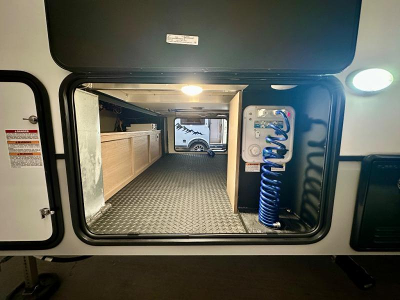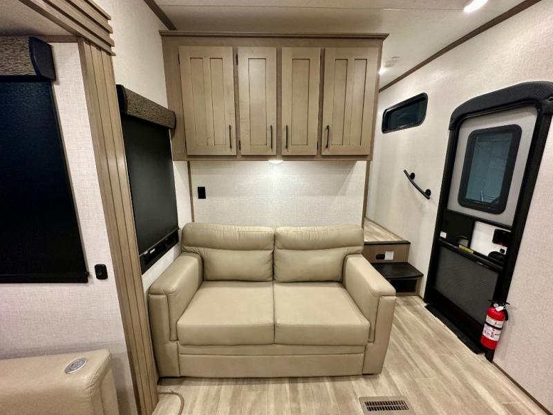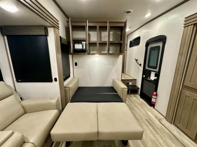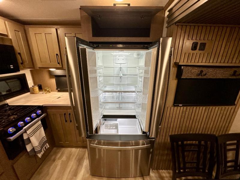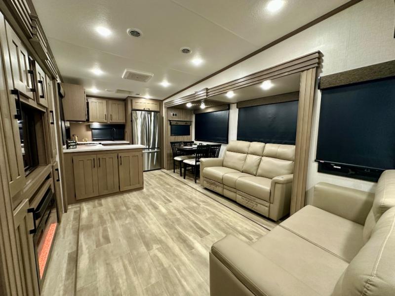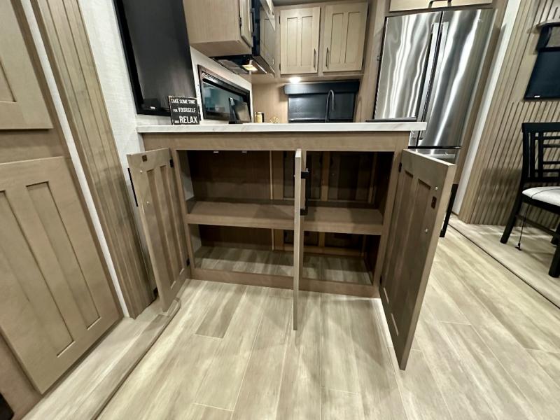Escape the hustle and bustle of city life for weekends in this cozy fifth wheel. The dual opposing slides in the main living area will create an open floorplan, and you can choose an optional 40" fireplace here for a more at-home feel. There is also an entertainment center and a 43" Smart LED TV for movie night and a legless table, chairs, and a bench to dine at. If the weather is nice, head outdoors to relax under the 14' power awning while the chef of your group cooks on the outside kitchen with a pellet smoker. The rear kitchen inside features tons of counter space, an 18 cu. ft. house refrigerator, a drop-in cooktop, and a 24" microwave. And don't overlook the front private bedroom with its slide out wardrobe, a closet with washer and dryer prep, and a queen bed!