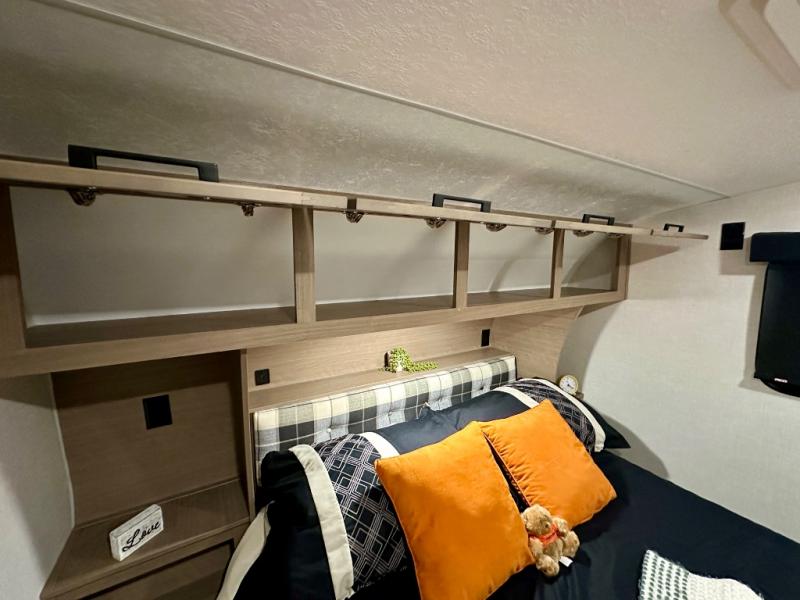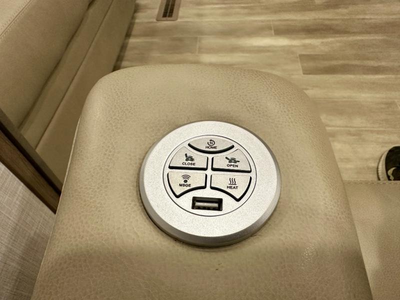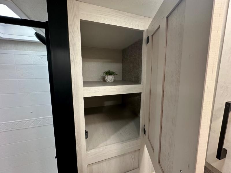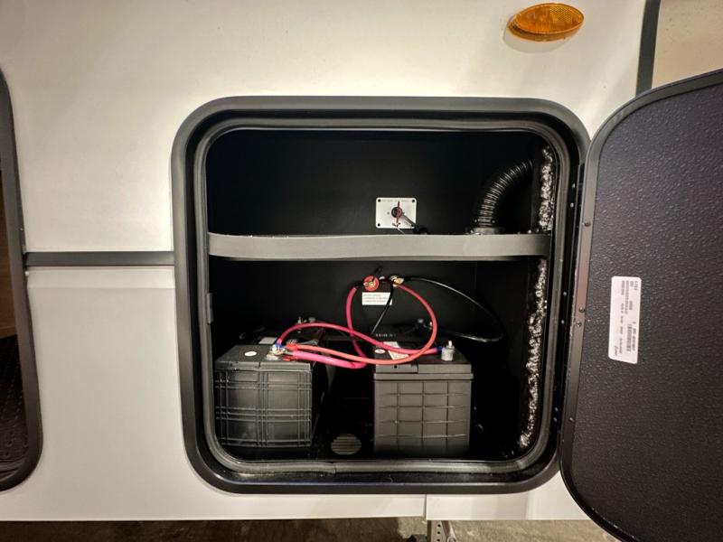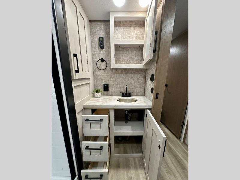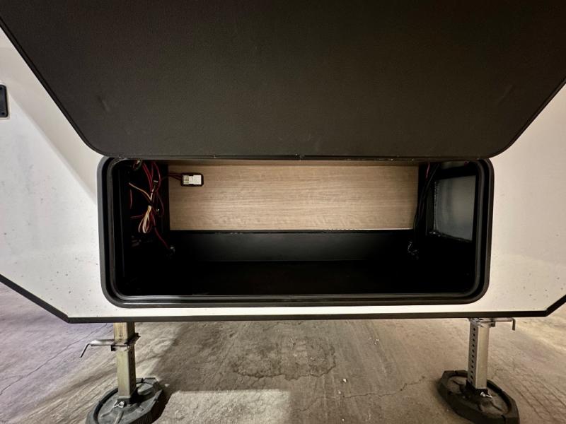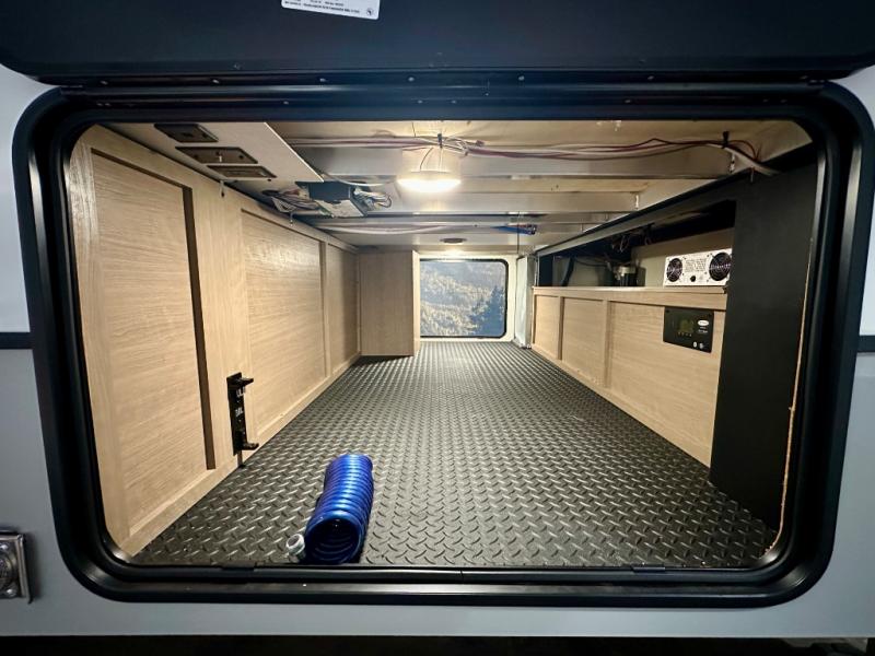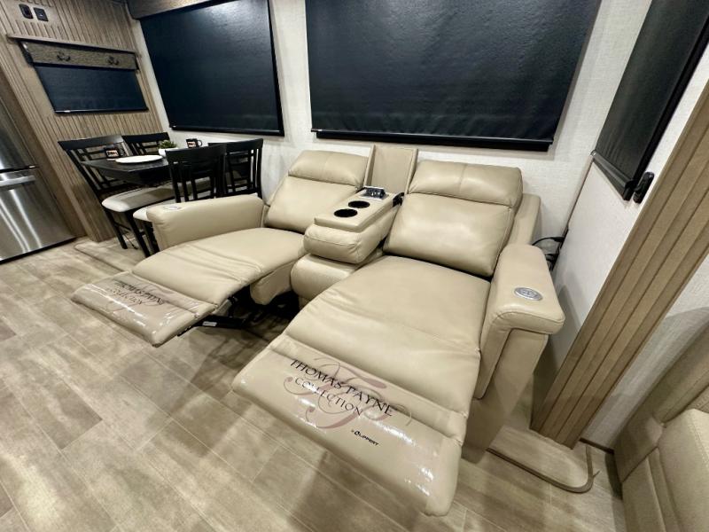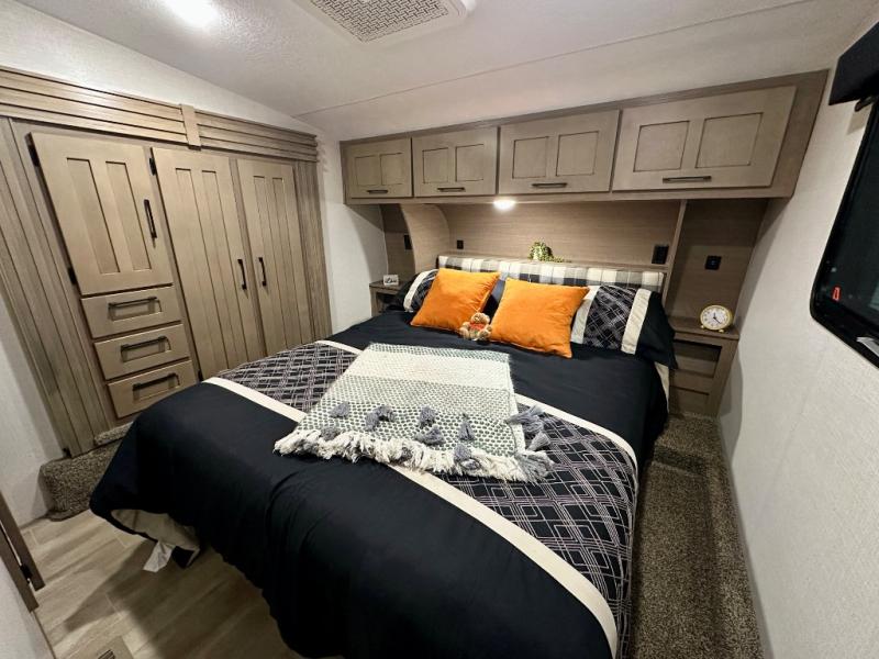Escape the hustle and bustle of city life for weekends in this cozy fifth wheel. The dual opposing slides in the main living area will create an open floorplan, and you can choose an optional 40" fireplace here for a more at-home feel. There is also an entertainment center and a 43" Smart LED TV for movie night and a legless table, chairs, and a bench to dine at. If the weather is nice, head outdoors to relax under the 14' power awning while the chef of your group cooks on the outside kitchen with a pellet smoker. The rear kitchen inside features tons of counter space, an 18 cu. ft. house refrigerator, a drop-in cooktop, and a 24" microwave. And don't overlook the front private bedroom with its slide out wardrobe, a closet with washer and dryer prep, and a queen bed!