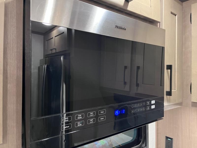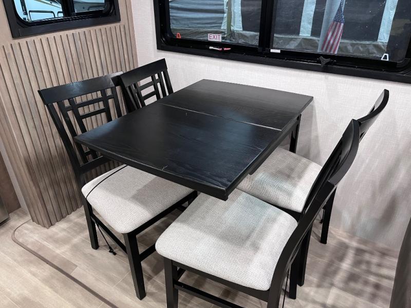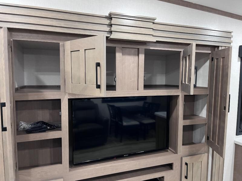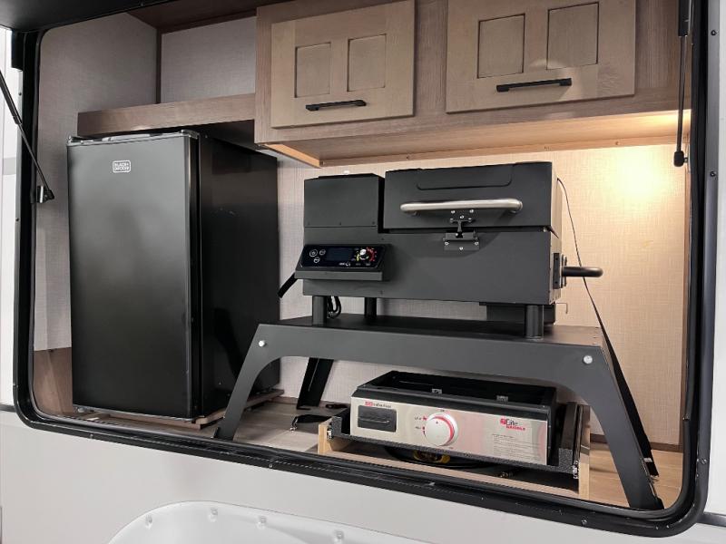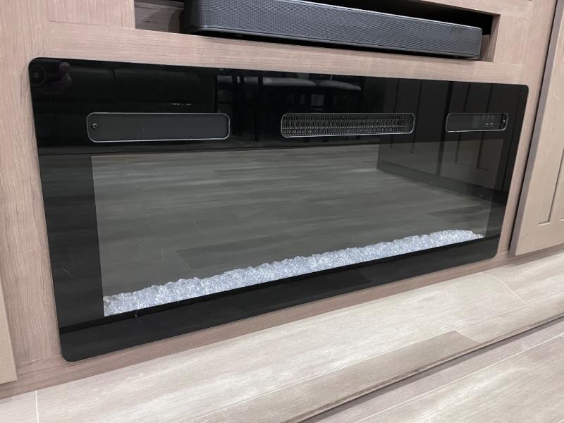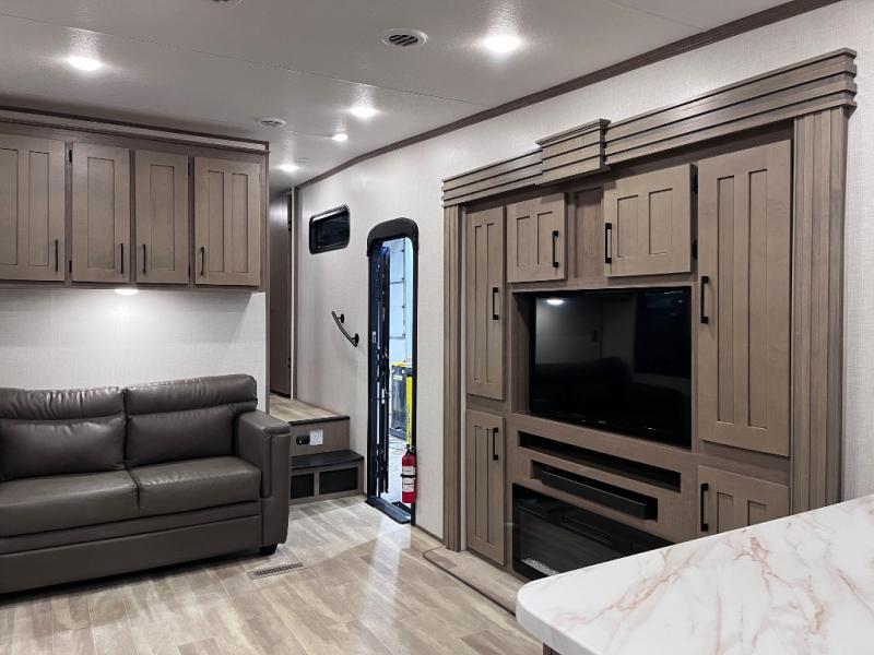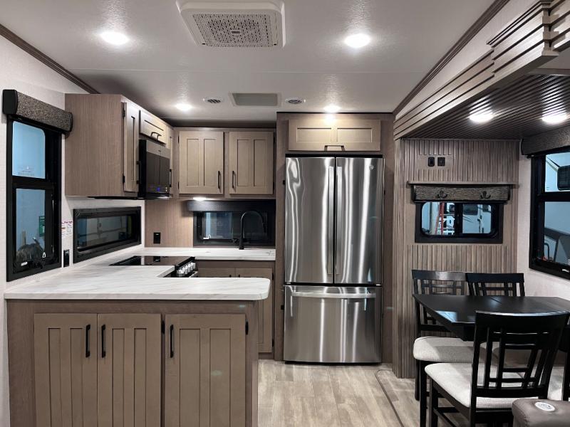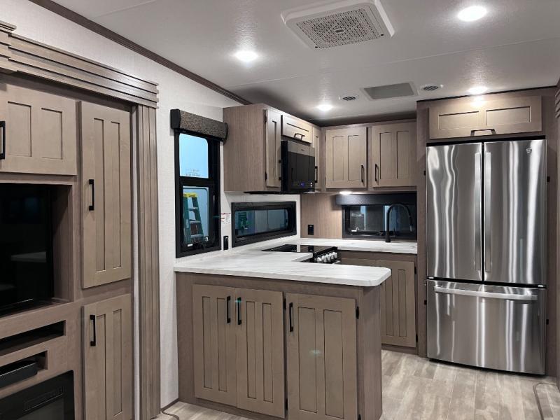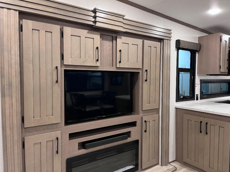 Escape the hustle and bustle of city life for weekends in this cozy fifth wheel. The dual opposing slides in the main living area will create an open floorplan, and you can choose an optional 40" fireplace here for a more at-home feel. There is also an entertainment center and a 43" Smart LED TV for movie night and a legless table, chairs, and a bench to dine at. If the weather is nice, head outdoors to relax under the 14' power awning while the chef of your group cooks on the outside kitchen with a pellet smoker. The rear kitchen inside features tons of counter space, an 18 cu. ft. house refrigerator, a drop-in cooktop, and a 24" microwave. And don't overlook the front private bedroom with its slide out wardrobe, a closet with washer and dryer prep, and a queen bed!
