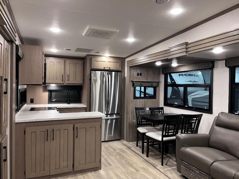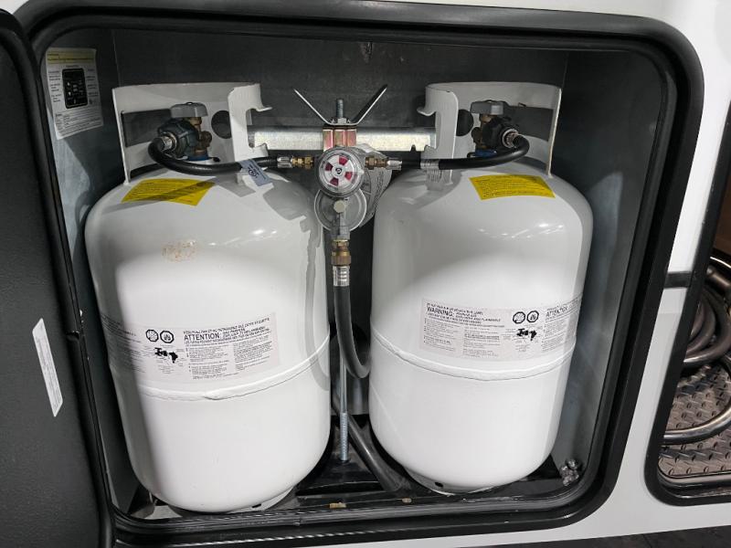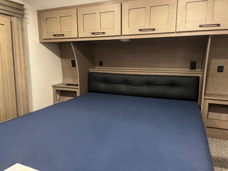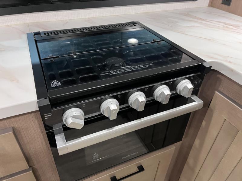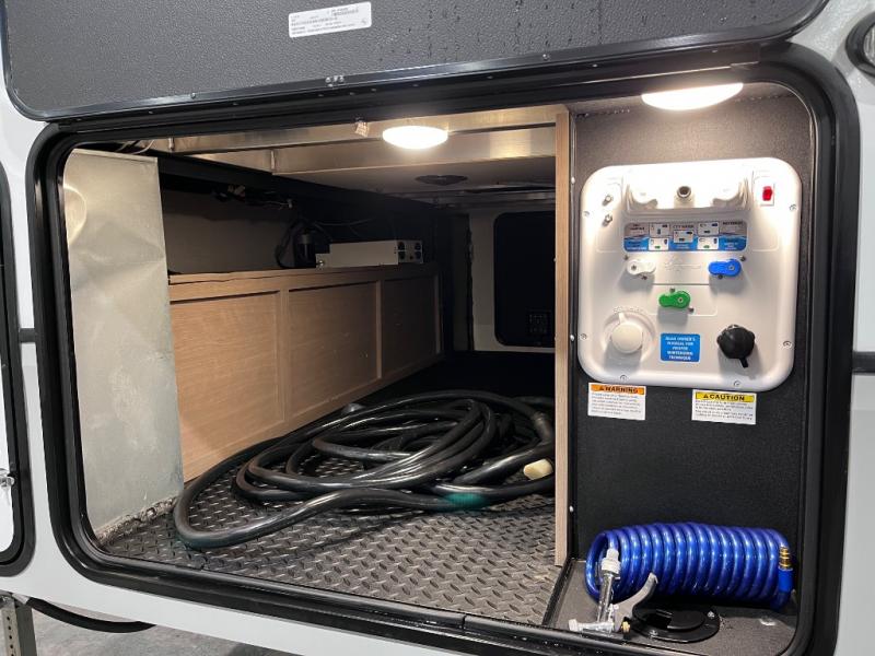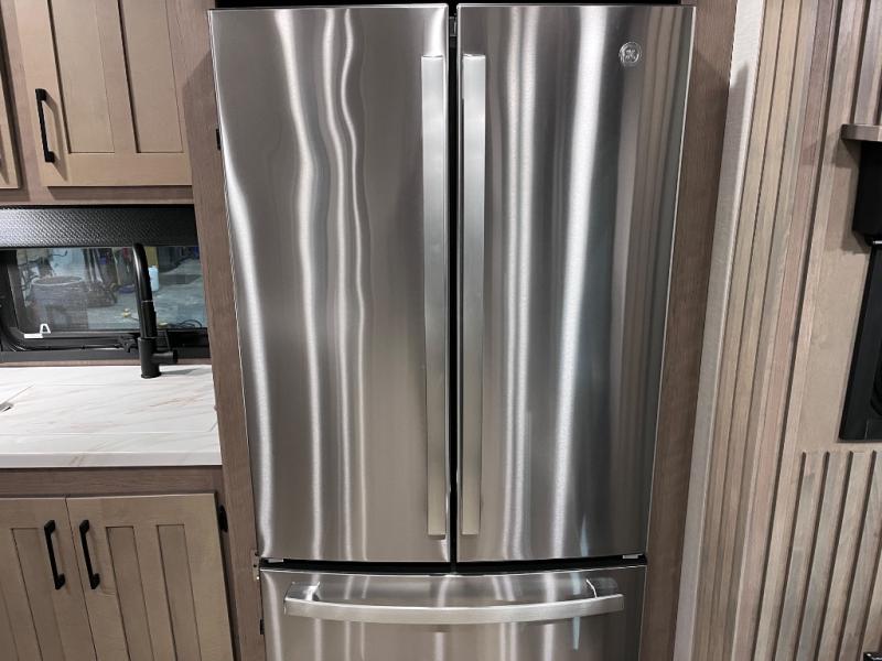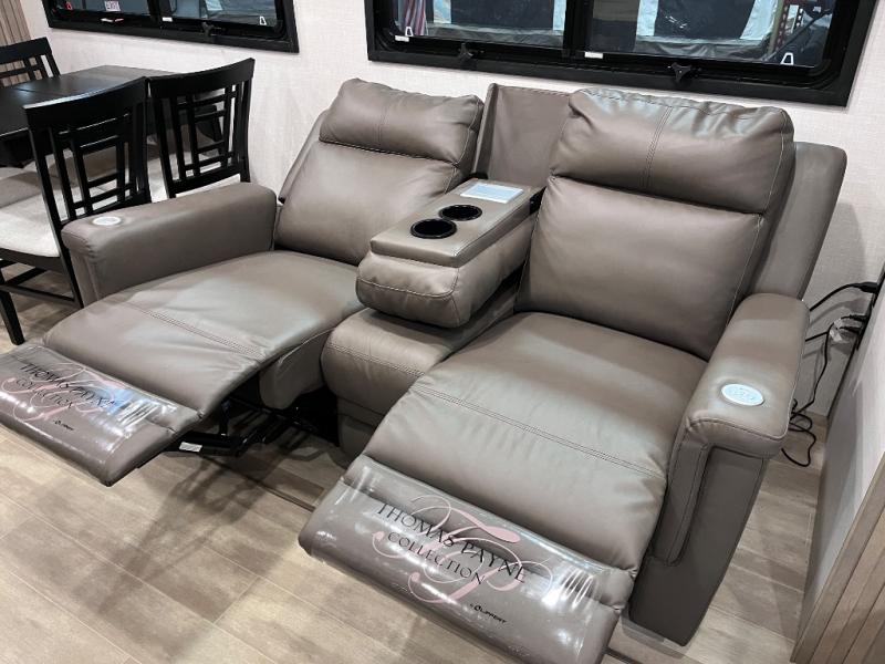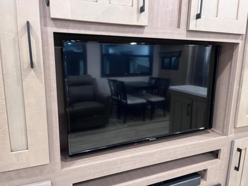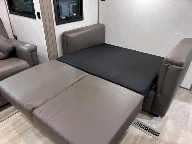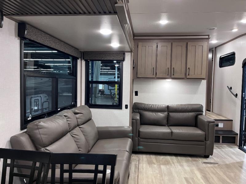 Escape the hustle and bustle of city life for weekends in this cozy fifth wheel. The dual opposing slides in the main living area will create an open floorplan, and you can choose an optional 40" fireplace here for a more at-home feel. There is also an entertainment center and a 43" Smart LED TV for movie night and a legless table, chairs, and a bench to dine at. If the weather is nice, head outdoors to relax under the 14' power awning while the chef of your group cooks on the outside kitchen with a pellet smoker. The rear kitchen inside features tons of counter space, an 18 cu. ft. house refrigerator, a drop-in cooktop, and a 24" microwave. And don't overlook the front private bedroom with its slide out wardrobe, a closet with washer and dryer prep, and a queen bed!