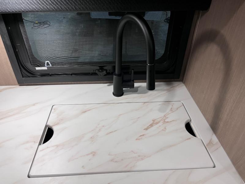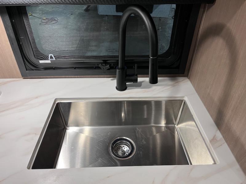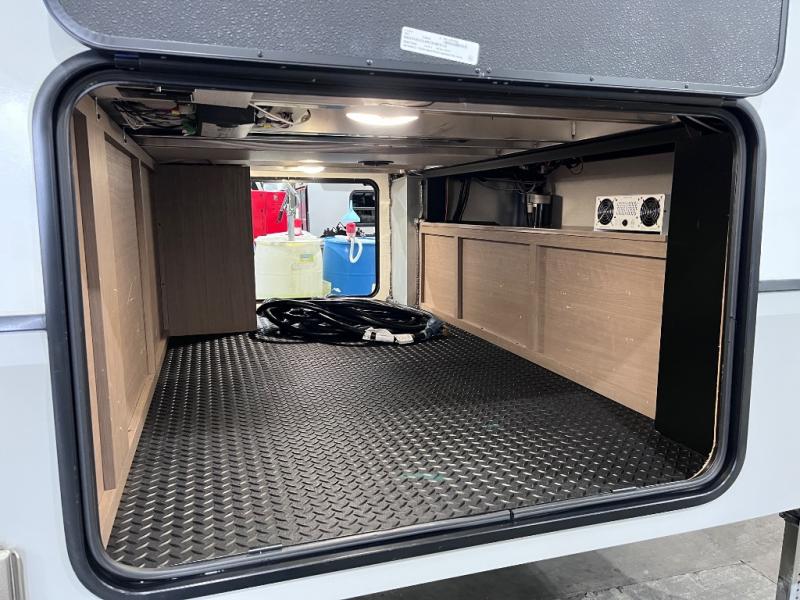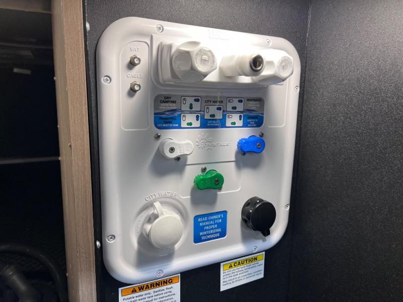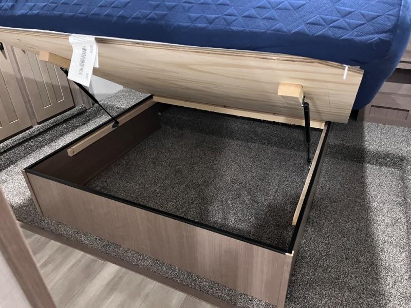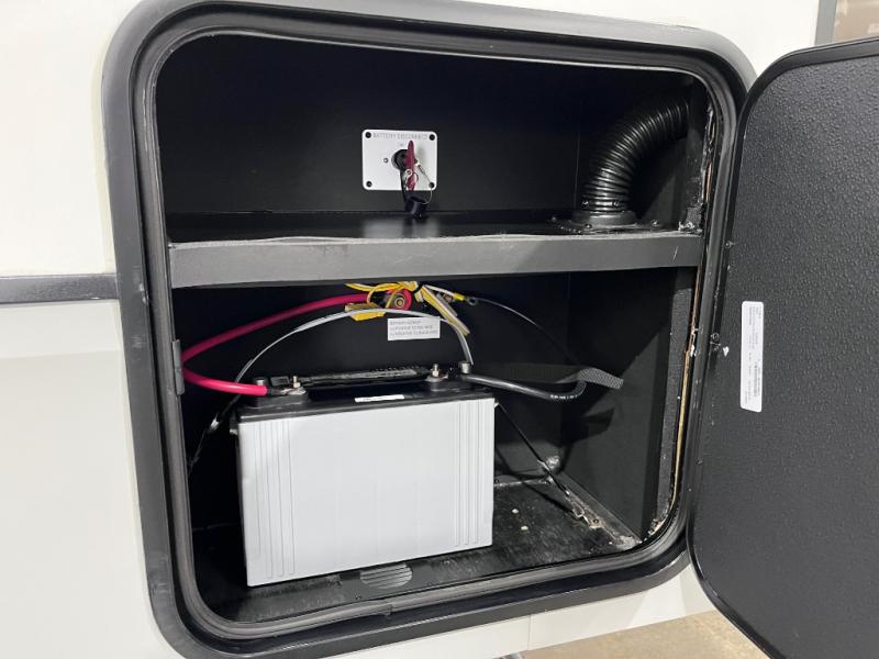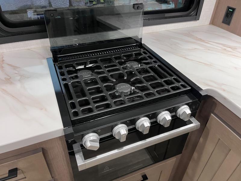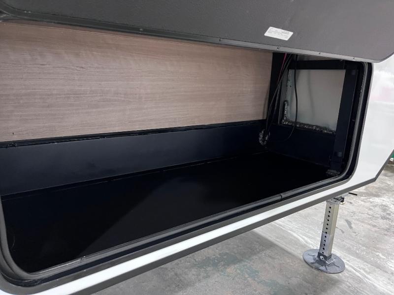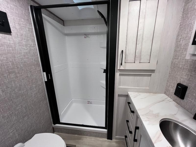 Escape the hustle and bustle of city life for weekends in this cozy fifth wheel. The dual opposing slides in the main living area will create an open floorplan, and you can choose an optional 40" fireplace here for a more at-home feel. There is also an entertainment center and a 43" Smart LED TV for movie night and a legless table, chairs, and a bench to dine at. If the weather is nice, head outdoors to relax under the 14' power awning while the chef of your group cooks on the outside kitchen with a pellet smoker. The rear kitchen inside features tons of counter space, an 18 cu. ft. house refrigerator, a drop-in cooktop, and a 24" microwave. And don't overlook the front private bedroom with its slide out wardrobe, a closet with washer and dryer prep, and a queen bed!