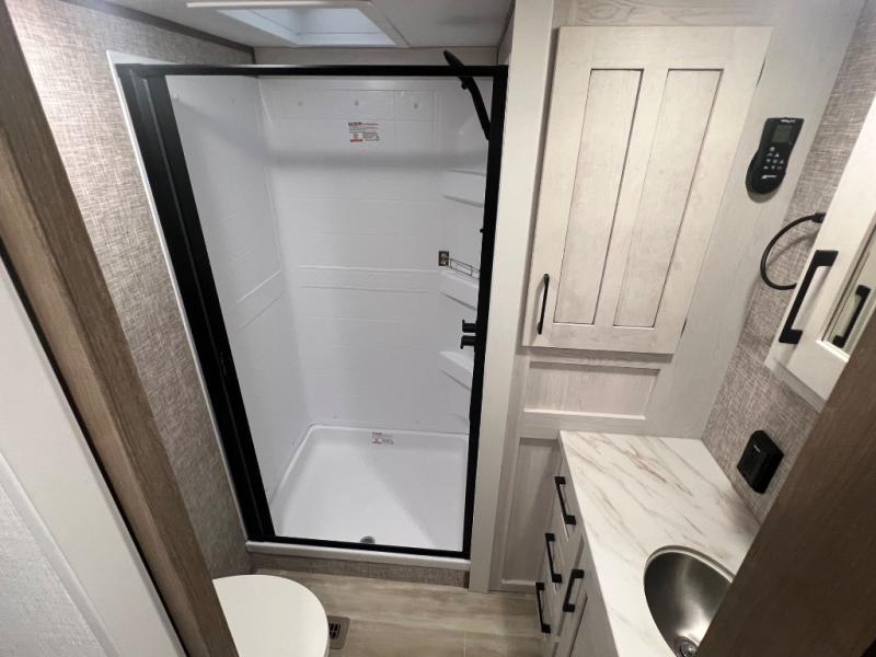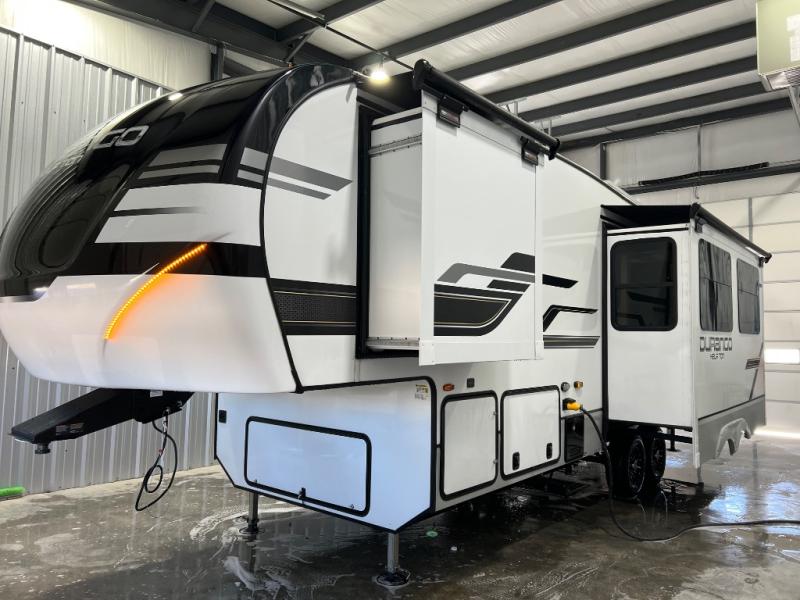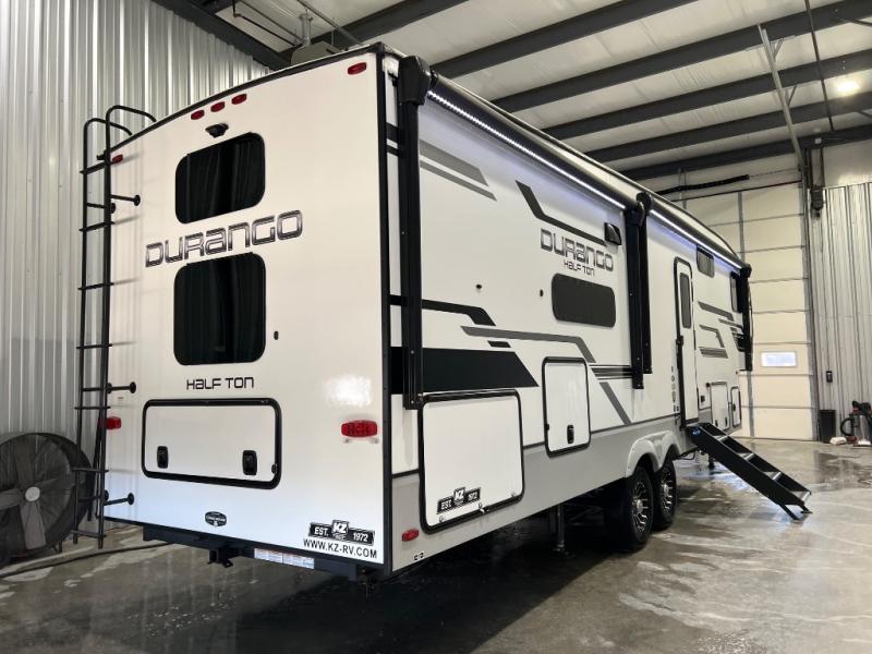Each Durango Half-Ton fifth wheel by KZ provides lightweight towing with interior luxuries galore! Controlling the functions of your unit will be a breeze with the KZ Engage powered by OneControl that includes a 7" touchscreen to control awnings, lights, tanks, and more. There are so many exterior conveniences to make each trip enjoyable, like the Durango Towing Package, metal latches on the baggage doors, heated water convenience center, and the flip-up main entry steps! Durable construction includes Tufflex PVC roofing, laminated Azdel composite panels, and a reinforced heavy-duty fiberglass front cap. The interior will feel more like a residential home with new Blancher Cherry cabinets, seamless countertops, a spacious shower, a redesigned front bedroom, and smart storage spaces! You can also customize your fifth wheel to fit your needs with available options, such as, generator prep, backup camera prep, a full-timers desk in place of the dinette table, and so much more!