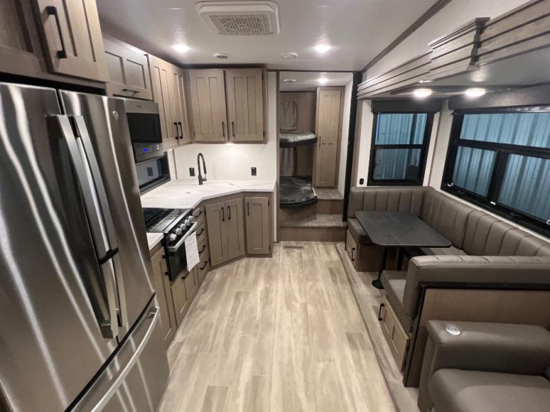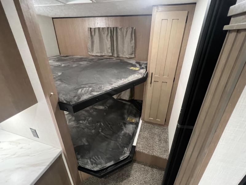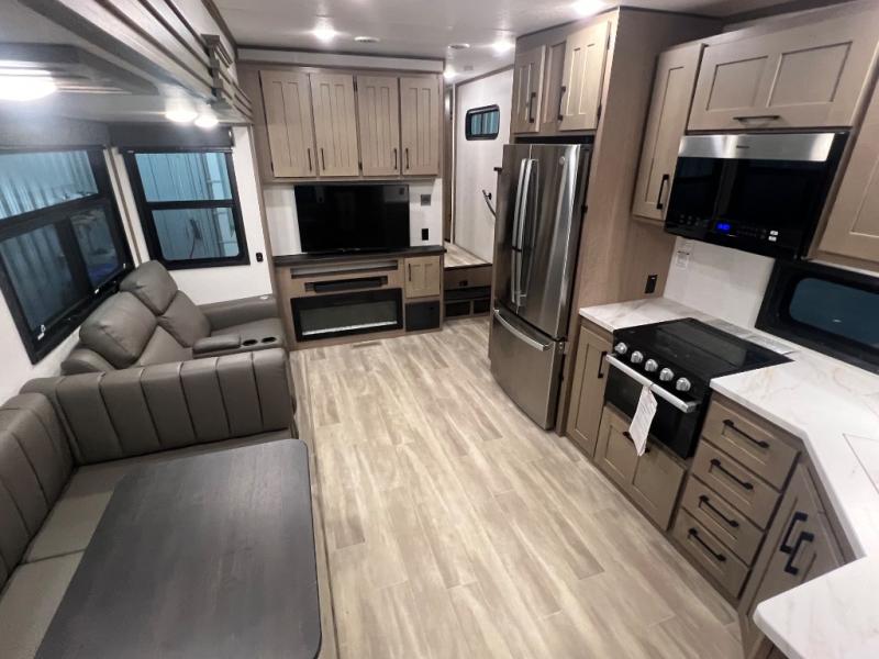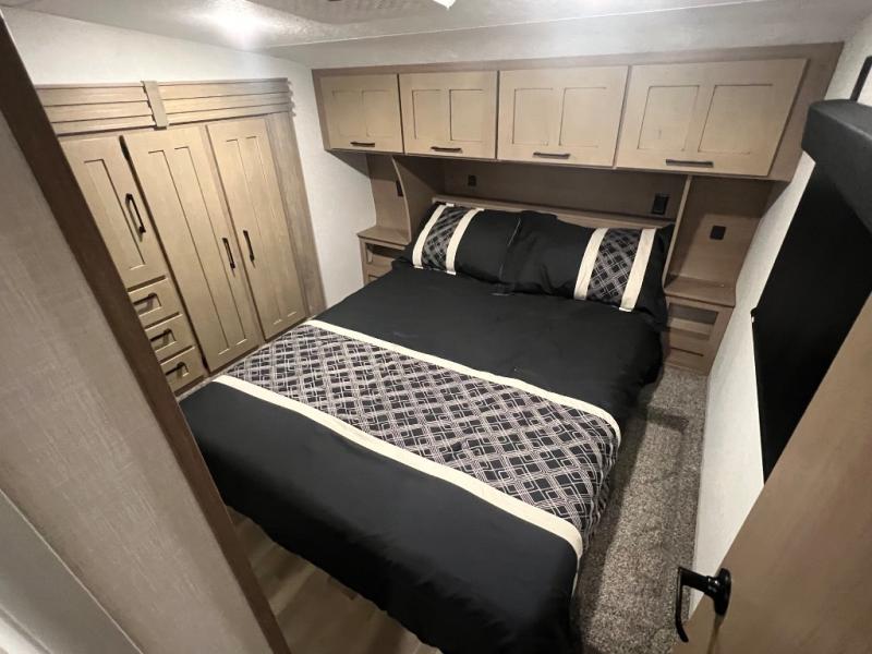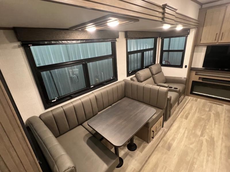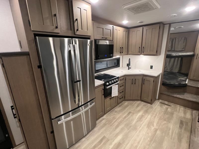This fifth wheel is perfect for camping with a large group or family since it can sleep ten people each night! There are queen-size bunks, a U-shaped dinette, a hide-a-bed sofa, plus a queen bed in the front private bedroom. And if you'd rather have theater seating in place of the sofa, you can choose that option! The chef will have their choice to cook indoors on the three burner drop-in cooktop or outdoors on the outside griddle, plus there are two power awnings here for maximum shade. Don't let this fifth wheel slip away!