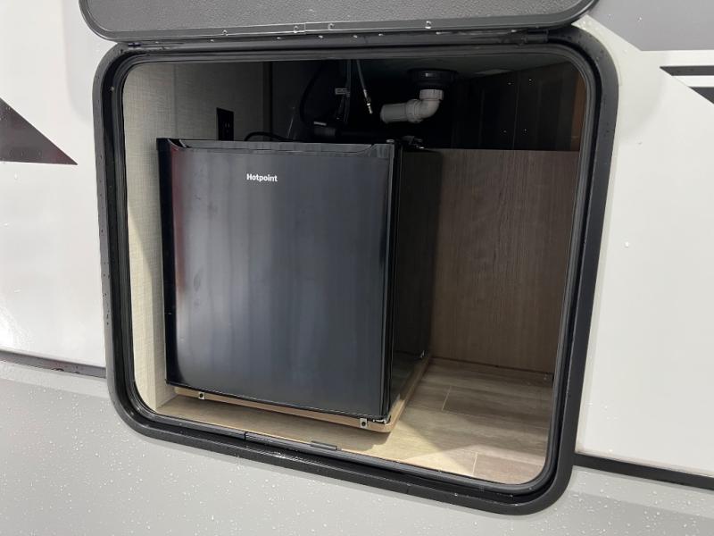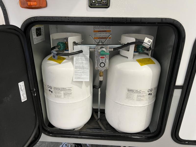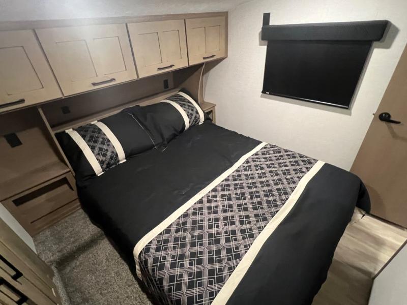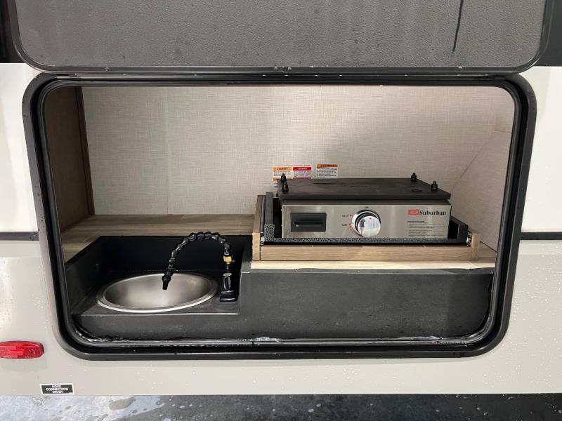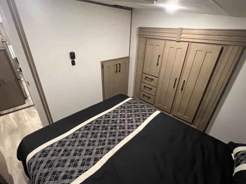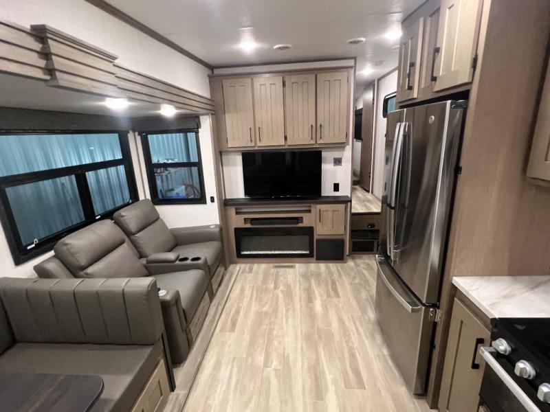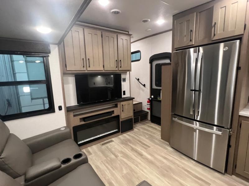 This fifth wheel is perfect for camping with a large group or family since it can sleep ten people each night! There are queen-size bunks, a U-shaped dinette, a hide-a-bed sofa, plus a queen bed in the front private bedroom. And if you'd rather have theater seating in place of the sofa, you can choose that option! The chef will have their choice to cook indoors on the three burner drop-in cooktop or outdoors on the outside griddle, plus there are two power awnings here for maximum shade. Don't let this fifth wheel slip away!