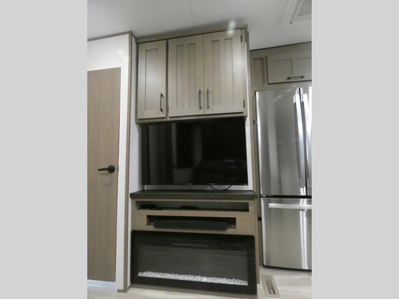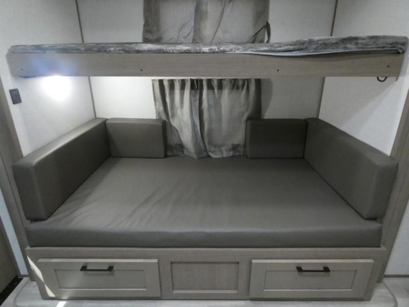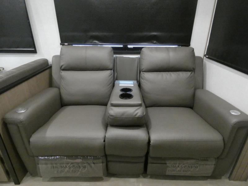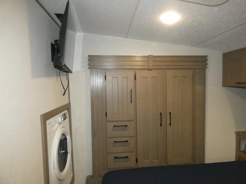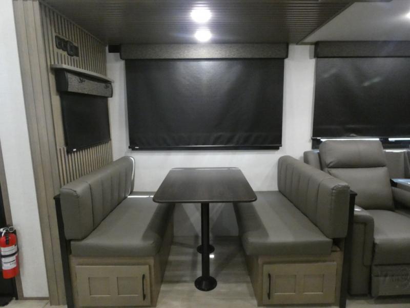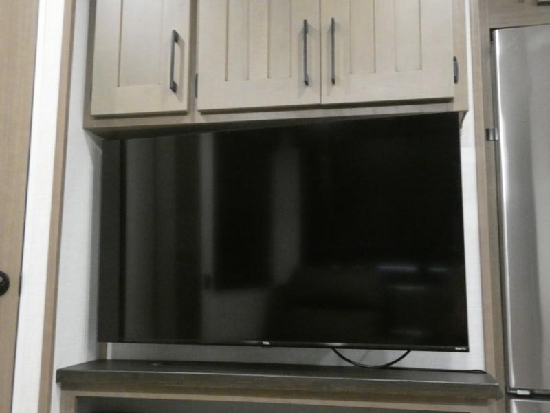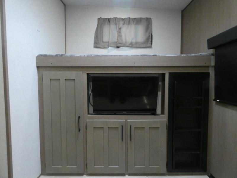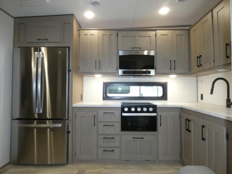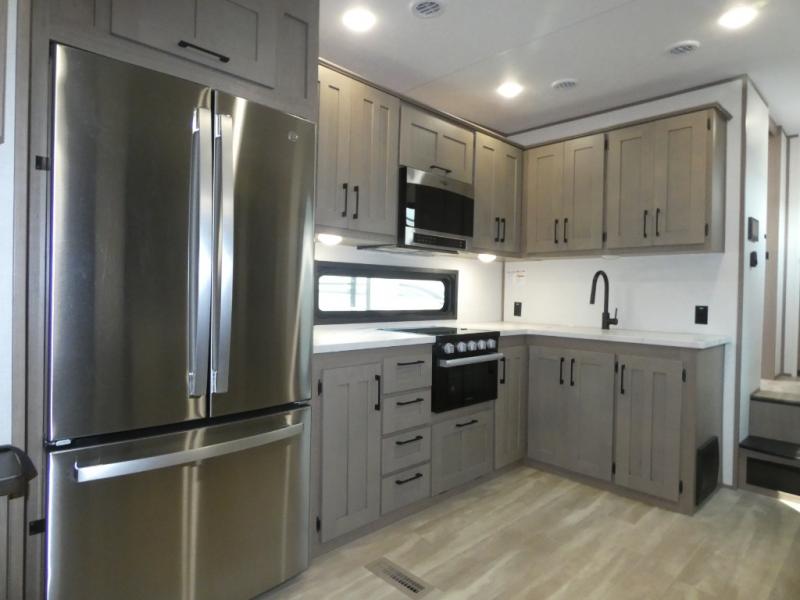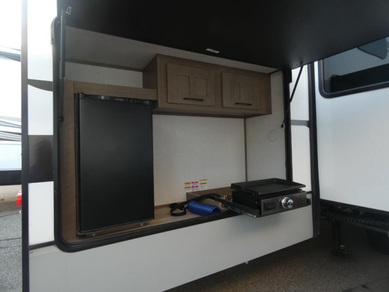 Your guests will feel right at home when they go camping with you since they will have their own bunkhouse suite with a half bath! There are three bunks here, plus an entertainment center. The spacious full bath is up by the front private bedroom, and here you'll enjoy a queen bed, a slide out wardrobe, plus a closet with washer and dryer prep. Everyone can meet in the main living area at the booth dinette, or on the theater seating, plus this area includes a 43" Smart LED TV. Head outdoors to cook on the outside kitchen that includes a pellet smoker, a griddle, a sink, plus a refrigerator.
