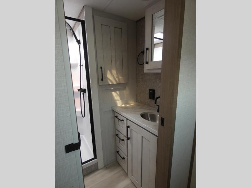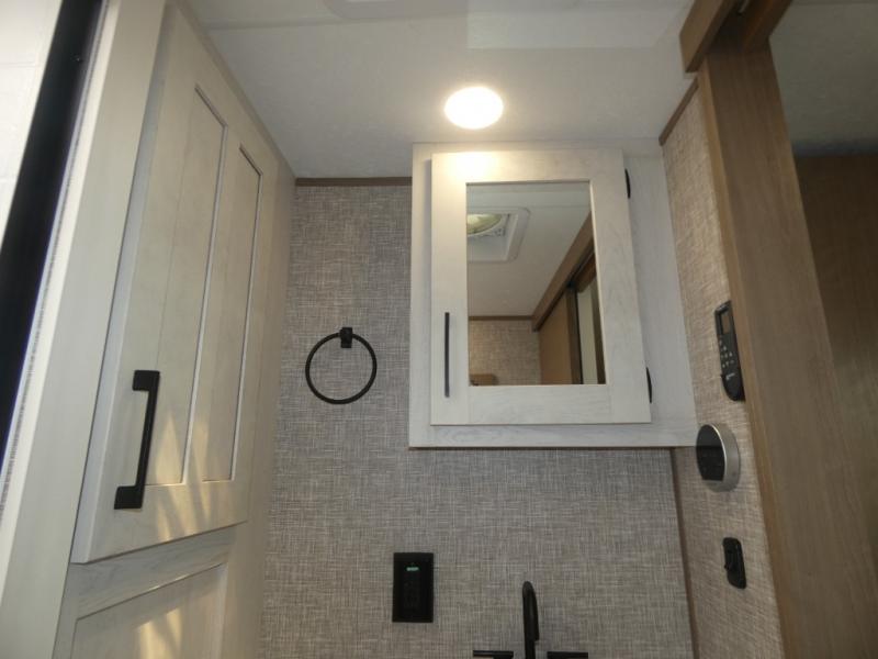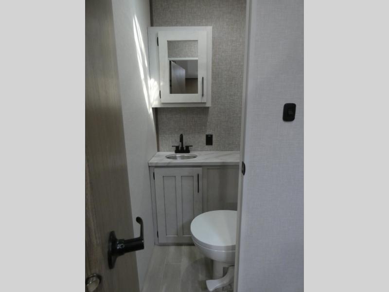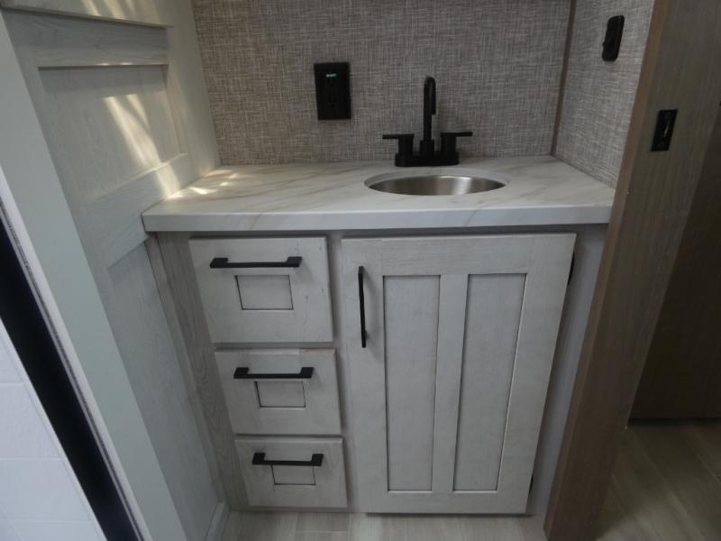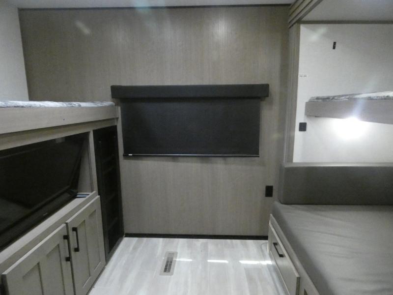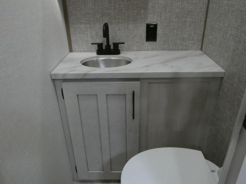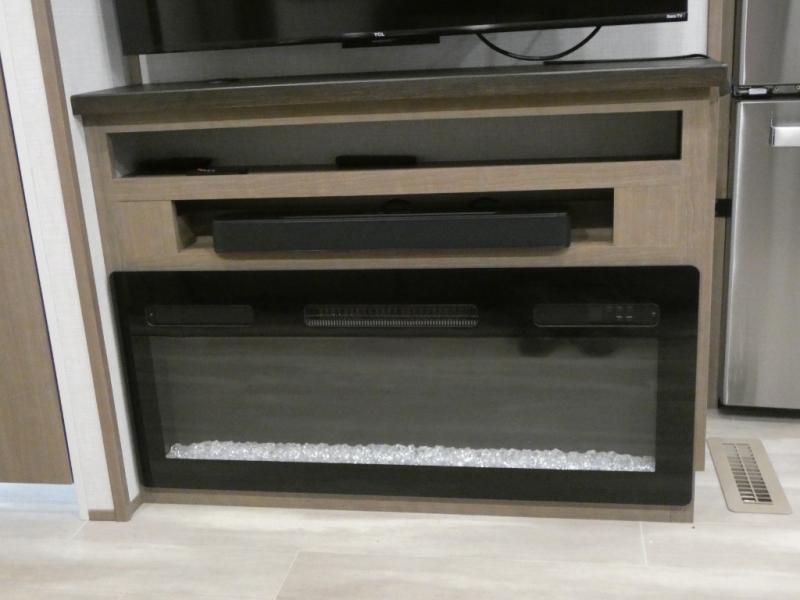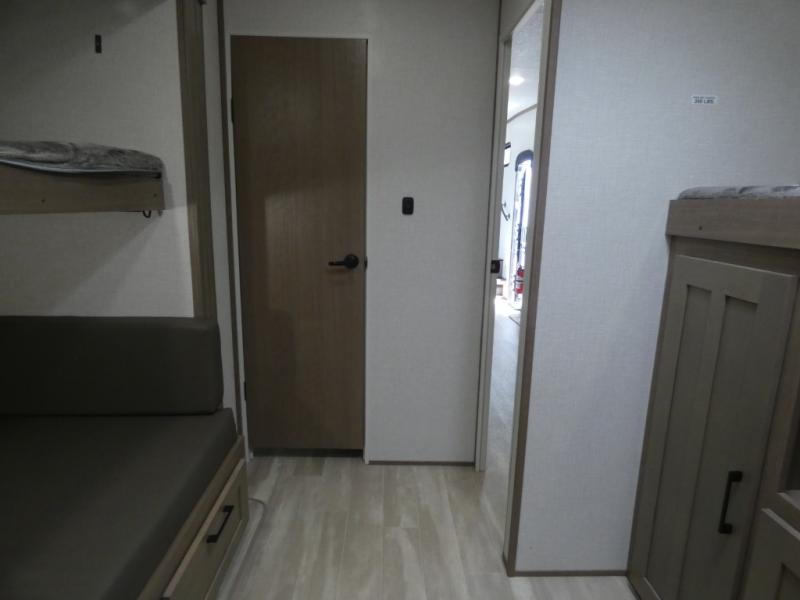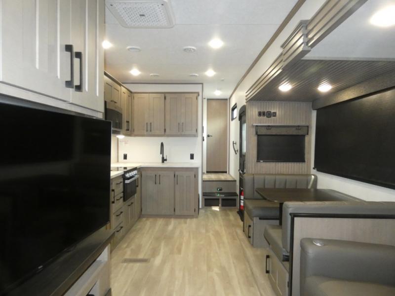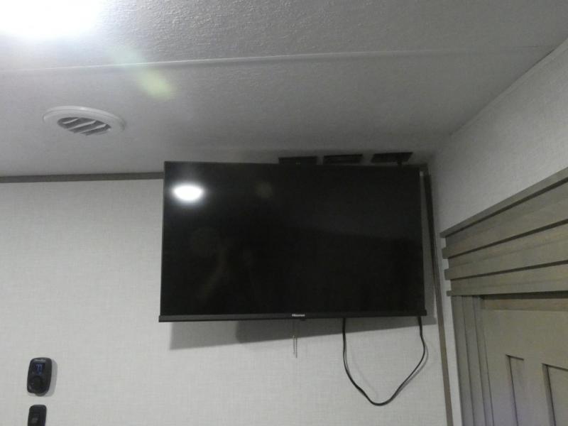 Your guests will feel right at home when they go camping with you since they will have their own bunkhouse suite with a half bath! There are three bunks here, plus an entertainment center. The spacious full bath is up by the front private bedroom, and here you'll enjoy a queen bed, a slide out wardrobe, plus a closet with washer and dryer prep. Everyone can meet in the main living area at the booth dinette, or on the theater seating, plus this area includes a 43" Smart LED TV. Head outdoors to cook on the outside kitchen that includes a pellet smoker, a griddle, a sink, plus a refrigerator.