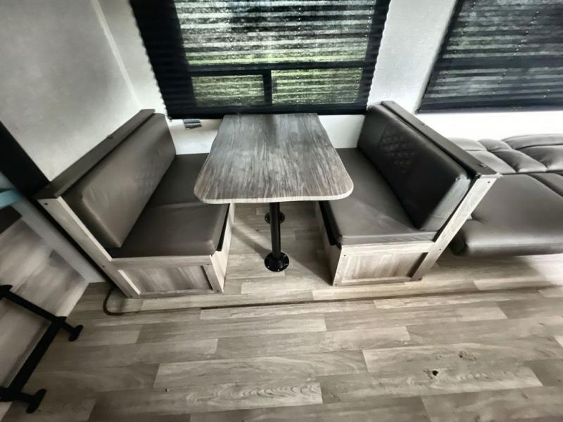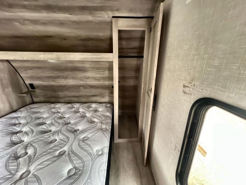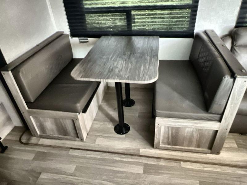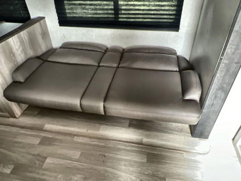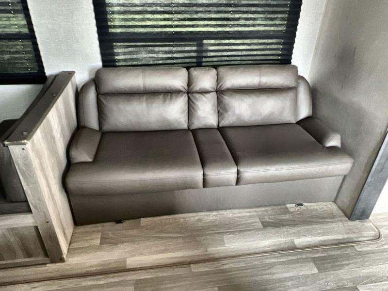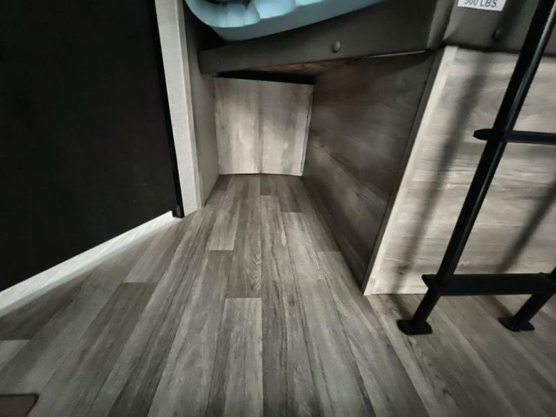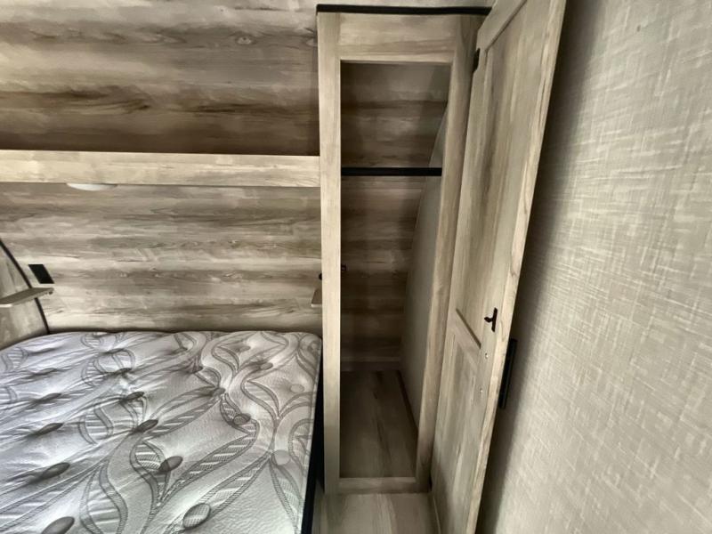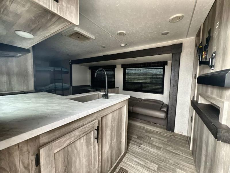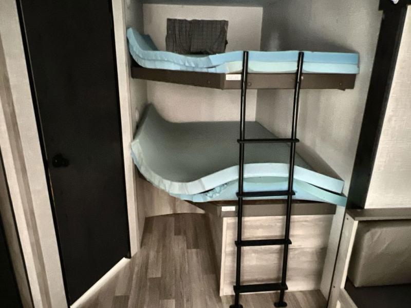 This bunkhouse model is perfect for your whole crew! Your guests or little ones will love the double-size bunk, while you take the queen bed in the front private bedroom. The large slide out will create an open living area, and here you'll find the 70" jackknife sofa and 41" booth dinette, both of which can also convert to extra sleeping space. The full bath has its own exterior entry door for convenience, and the second entry door opens up to the main living area. There is plenty of storage space in this model, including a wardrobe/pantry in the kitchen, dual wardrobes in the bedroom, an exterior pass-through storage, and even an exterior trunk door under the bunks to easily fit in all your gear!