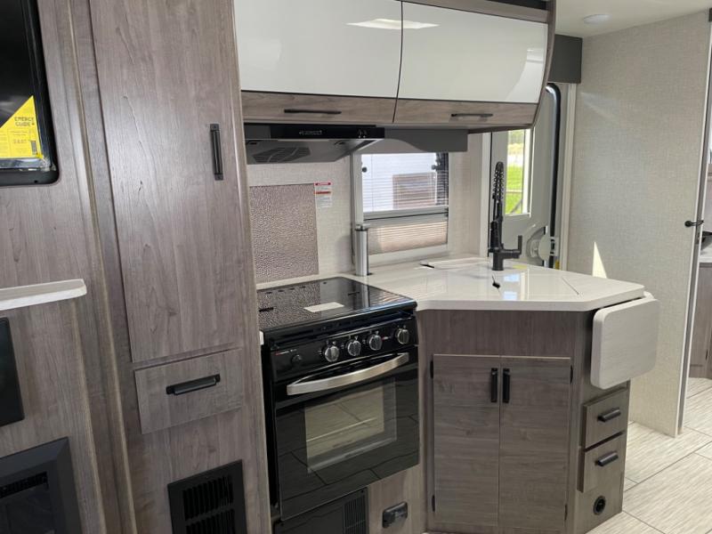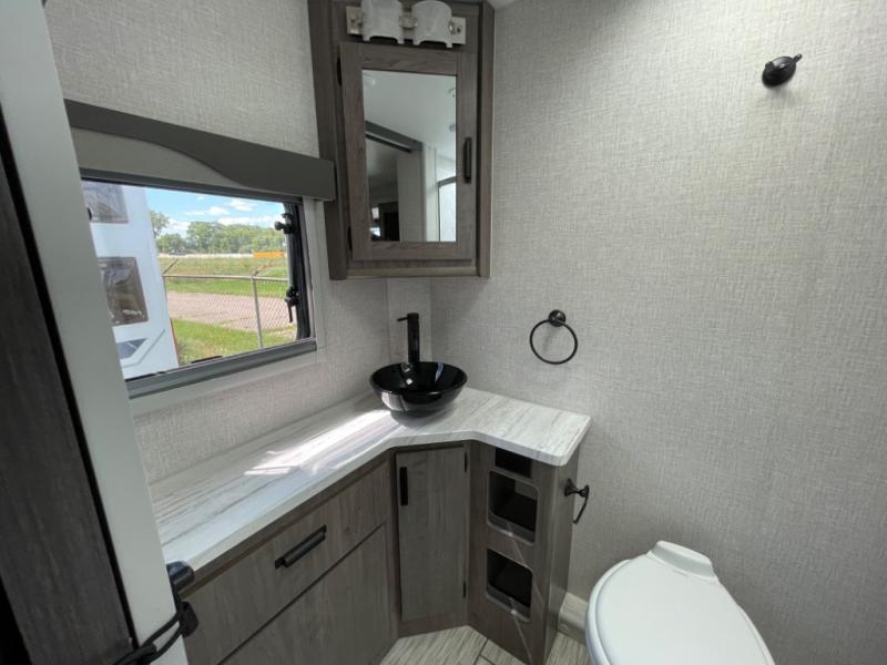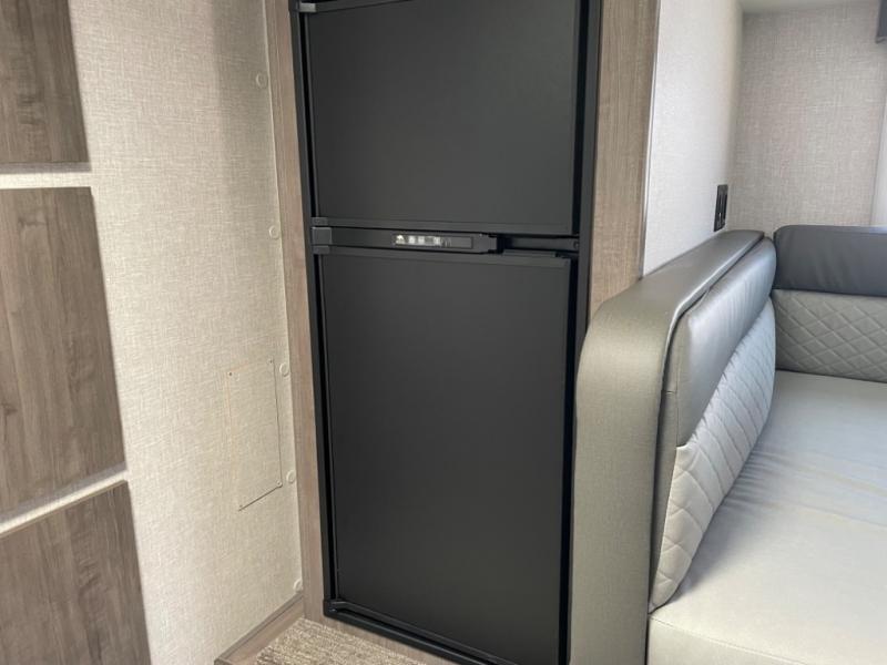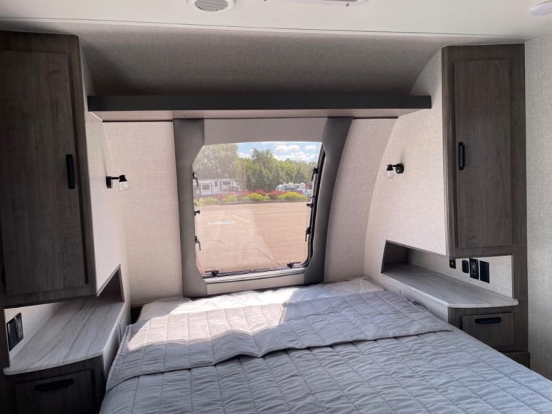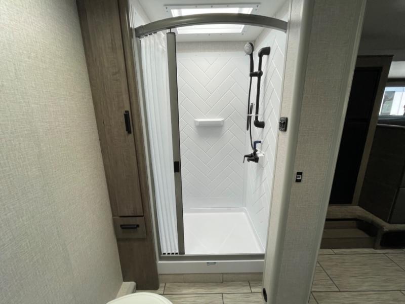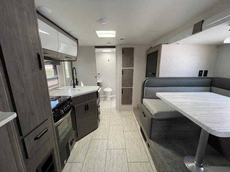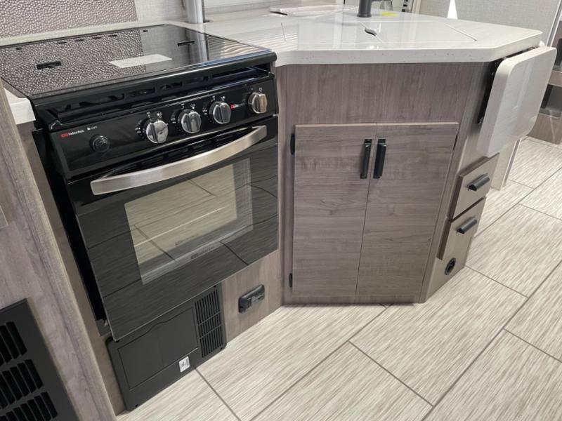This spacious travel trailer is the perfect companion for all your adventures. The front bedroom includes a deluxe queen innerspring mattress with a pillow top, dual bedroom wardrobes, and a floor-to-ceiling walk-in closet to keep your clothes tidy. The stainless steel three burner cooktop will let you prepare meals each day and the double door refrigerator will keep food fresh. A U-shaped dinette provides a place to dine, play games, and let guests sleep over, and the slide out here gives you more floor space to move about. This model also has a full rear bath with tons of counter space, a large walk-in shower, and more!
