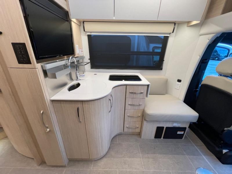 Each Unity Class B+ diesel motorhome by Leisure Travel sits on a durable Mercedes-Benz Sprinter 3500 dual rear wheel chassis with a 2.0-L Turbocharged I-4 diesel engine to power your adventures. The powder coated steel undercarriage support structure and vacuum-bonded construction provide a coach that will last for years, and there are eight sleek exterior paint options to make the coach your own. You'll love driving the Unity with its electronic stability control, adaptive cruise control, 9-speed automatic transmission with quieter noise levels and more comfort. There is even a digital mirror with sharp high-resolution that can be switched between convectional display and digital display for convenience. The luxurious interior includes Ultraleather furniture, a contoured solid surface Corian countertop in the kitchen, new decor options, plus many more comforts. And all of your power need will be met with dual 100 ah, 12V Lithium coach batteries with an internal heating system, plus a 2000W pure sine inverter and a 30 Amp power cord.