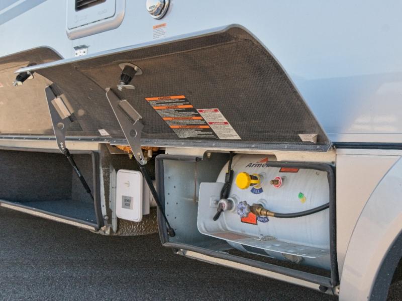 - Gourmet Galley: Includes a convection microwave, flush-mount LP cooktop with glass cover, flip-down counter extension, garbage can, and pull-out pantry for easy meal prep.