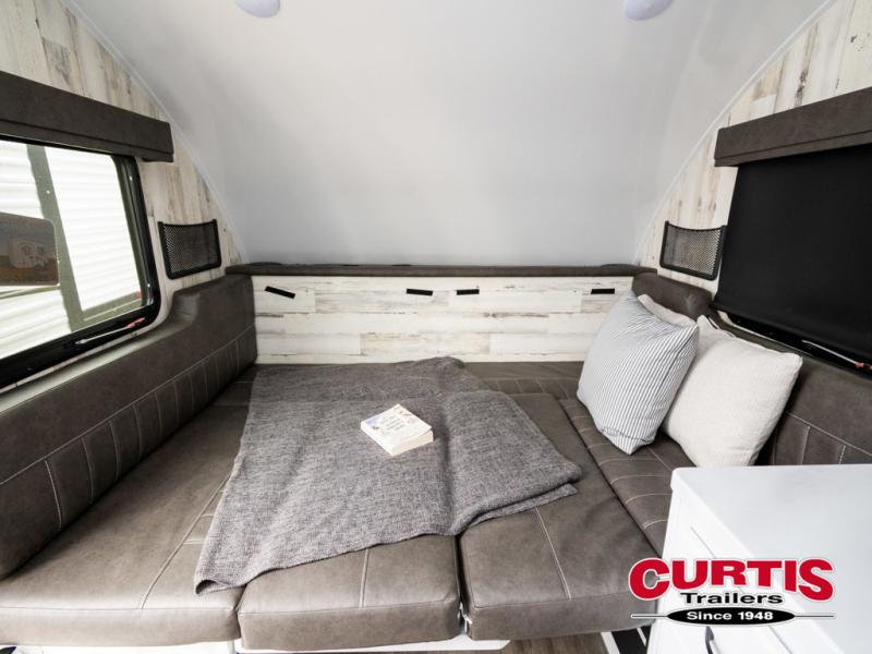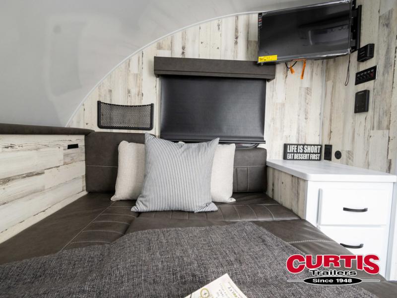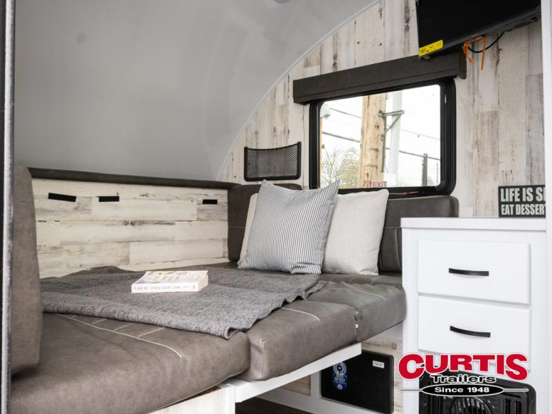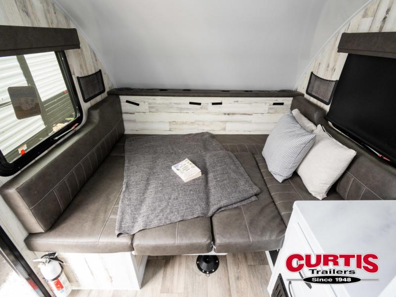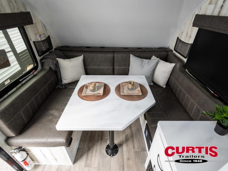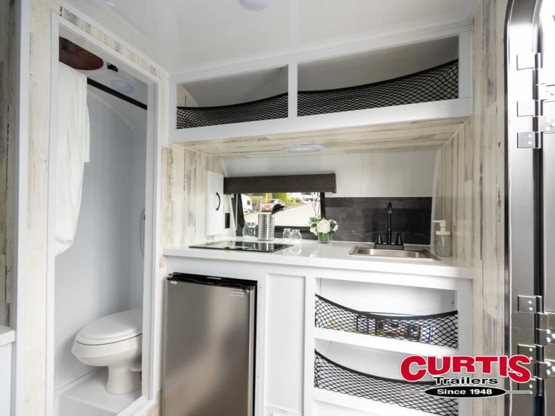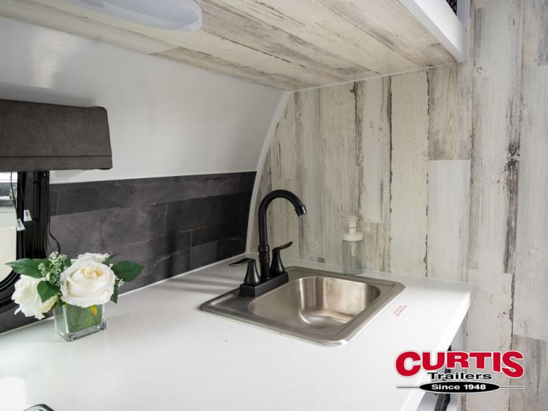 Bring the conveniences of your home with you to the campground in this teardrop trailer! The thoughtfully designed kitchen includes a pull out drawer for spices, a solid surface Corion countertop with backsplash, a water proof paper towel holder, a solid surface sink with faucet for easy clean up, and an Ever Chill Fridge to enjoy cold beverages. You will get a good night's rest on the comfy 6" memory foam mattress that also converts into a dining room table with seating. The bathroom has a Dometic toilet, a shower, and a two way vent fan to eliminate the steam. Plus, you have an outside shower/spray port to rinse the mud off your feet before entering inside. Store all of your gear in the 36" x 14" exterior baggage door with nylon organizer pockets, and you will also appreciate the waterproof storage organizer!