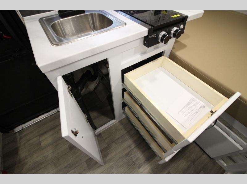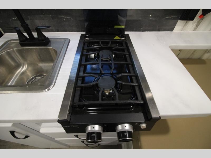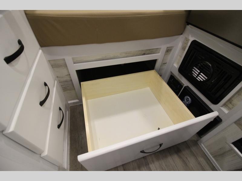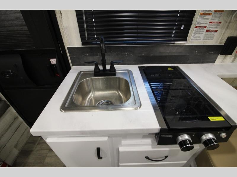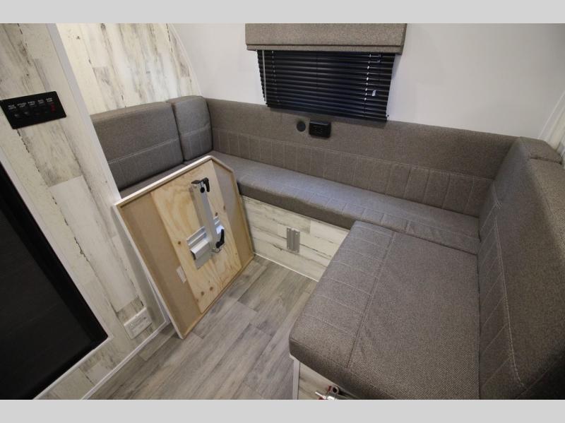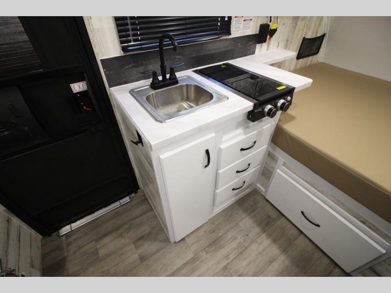 If you're looking for a teardrop trailer with a little more space, check out this Big Buggy BB14! There is a front U-shaped dinette that can convert to cozy sleeping space, a Recpro two burner stove, plus a large refrigerator. You can clean up each day in the wet bath that includes a two way bath vent fan plus a Dometic toilet. The exterior baggage door will keep all your gear secure, and the torsion axle will provide smooth towing from home to campground. There are also a variety of exterior graphics packages you can choose from that best fit your style!