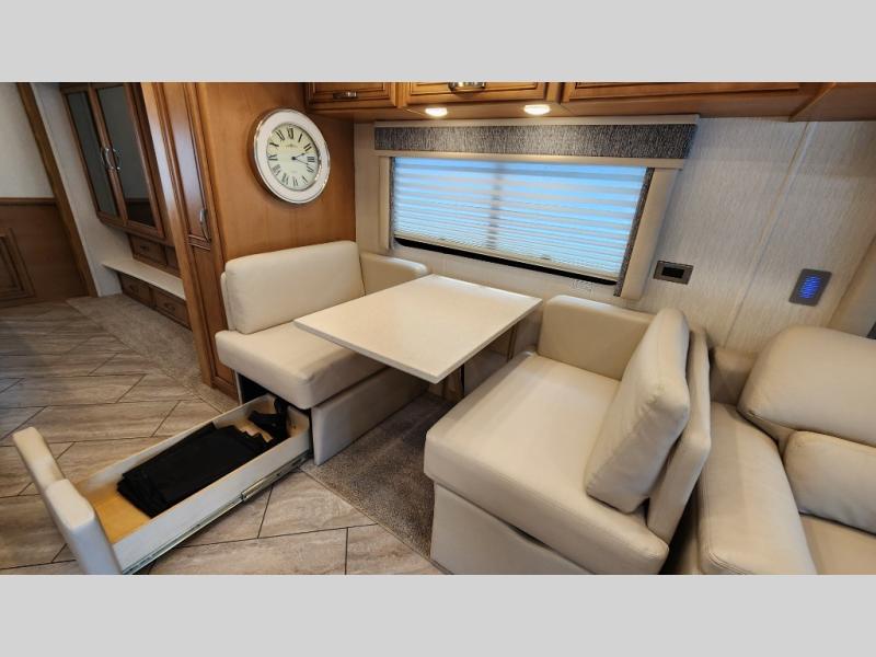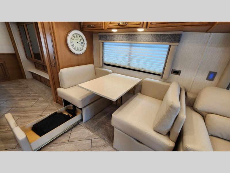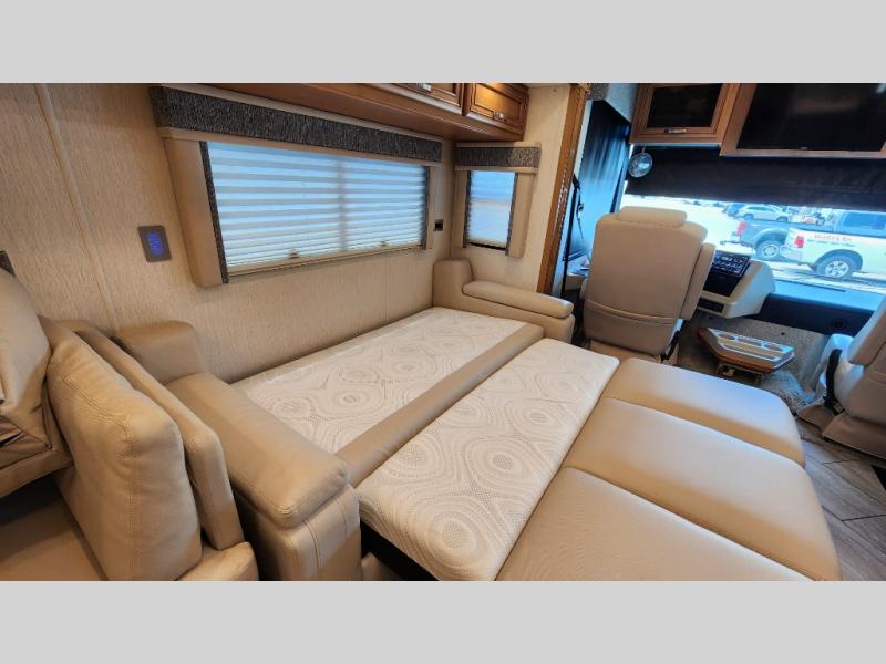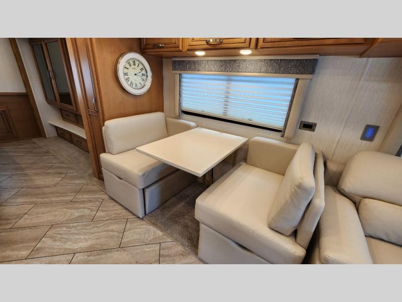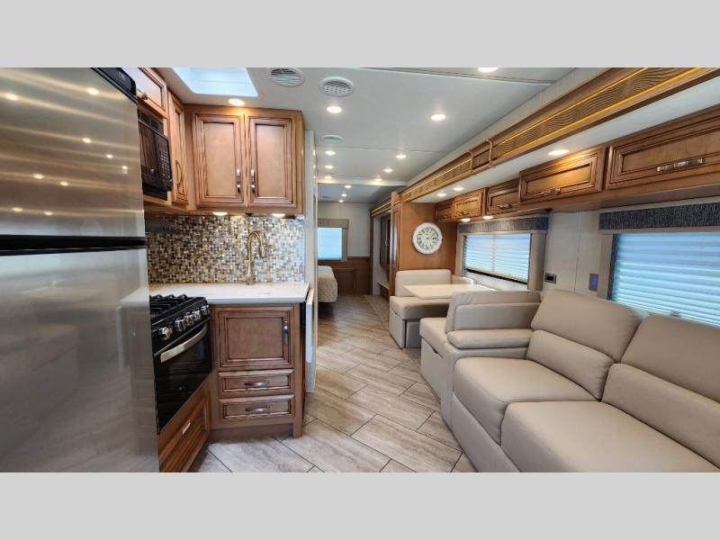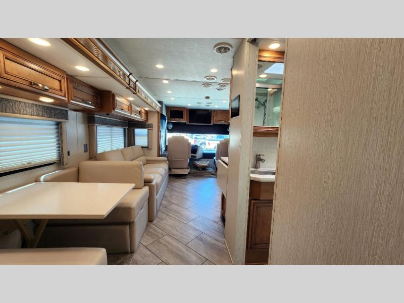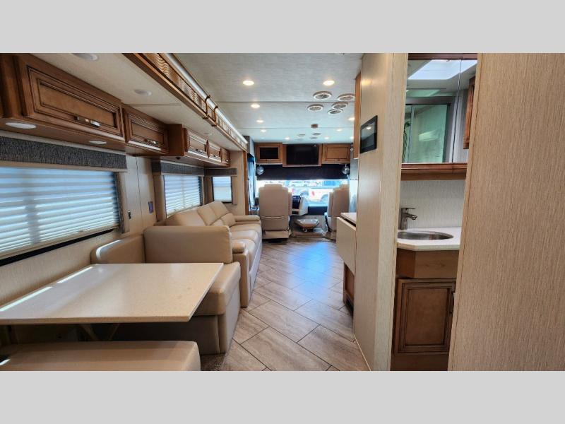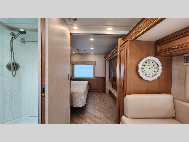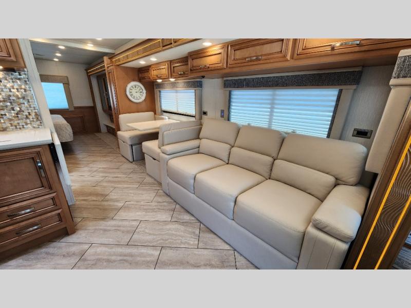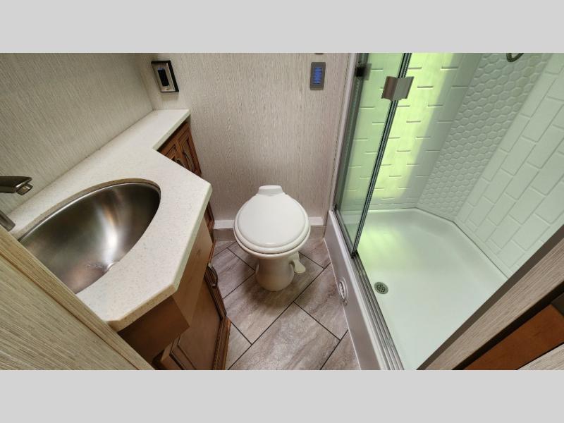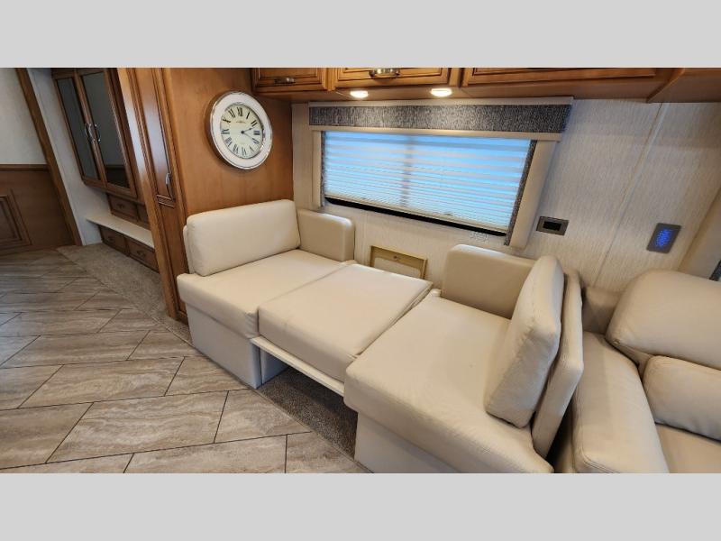 You're going to love how much space you have in this coach thanks to the full-wall slide and the king bed slide out. Your crew can get comfortable on the sofa comfort lounge or dine at the booth dinette, plus there is an overhead TV to watch your favorite shows. The chef of your group can whip up a hearty lunch on the three burner cooktop, or use the microwave oven to heat up leftovers. You'll find plenty of storage space throughout for all your things, including overhead cabinets, a shirt wardrobe in the bedroom, plus a mid-coach linen/pantry that can be used for food, towels, or bath necessities!