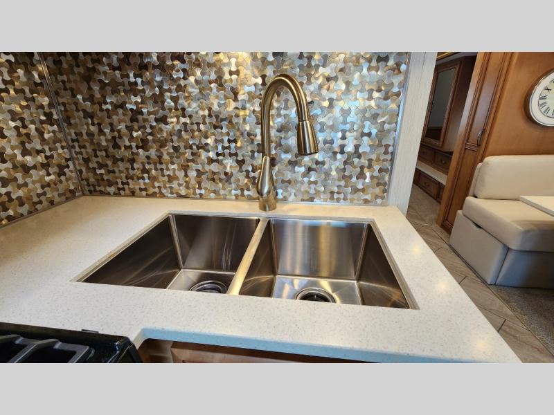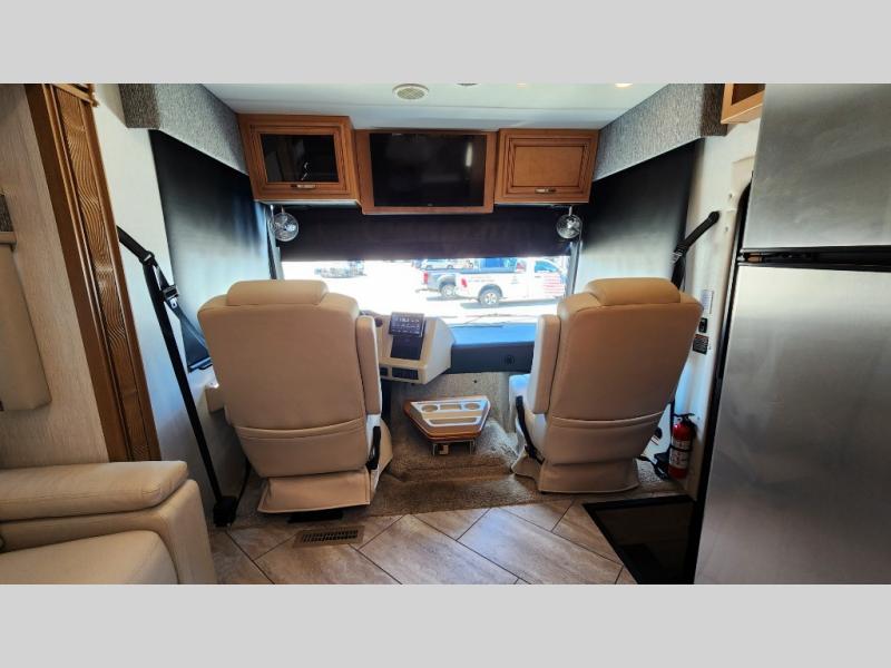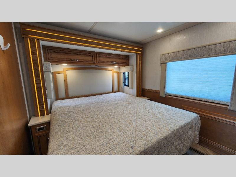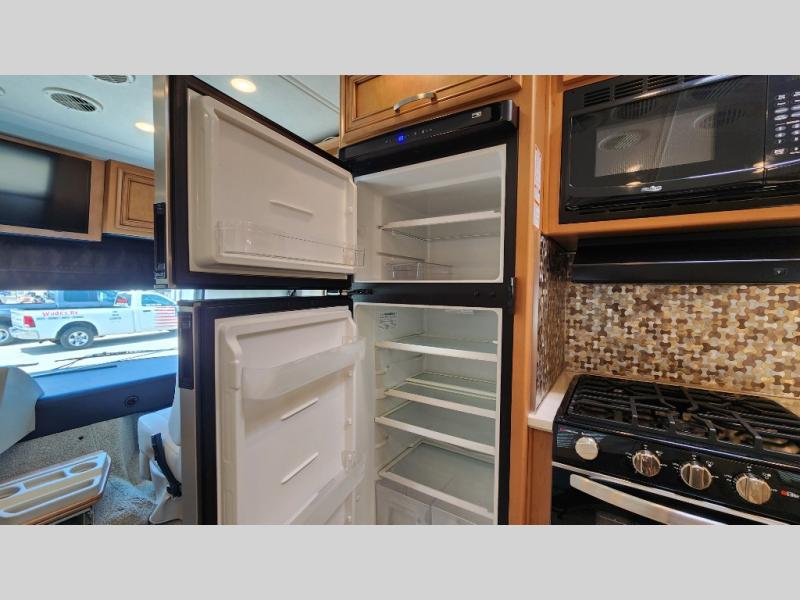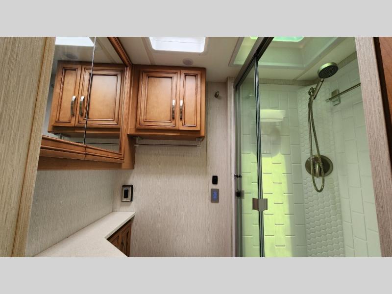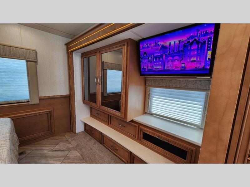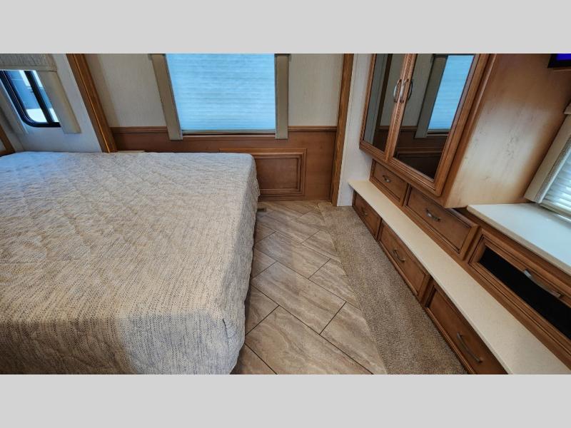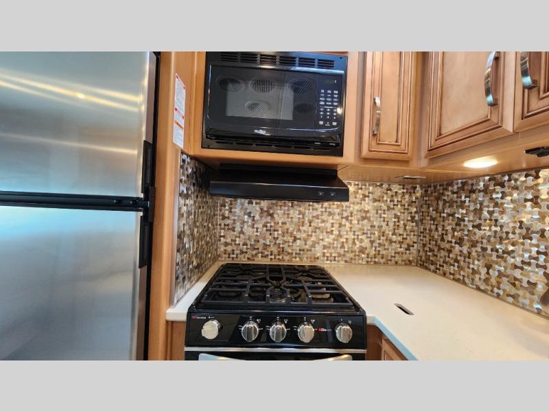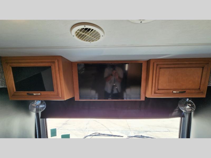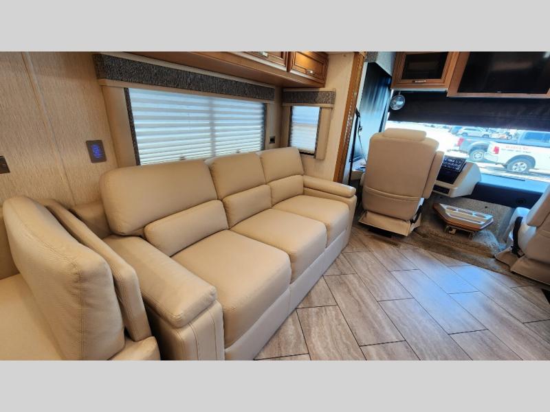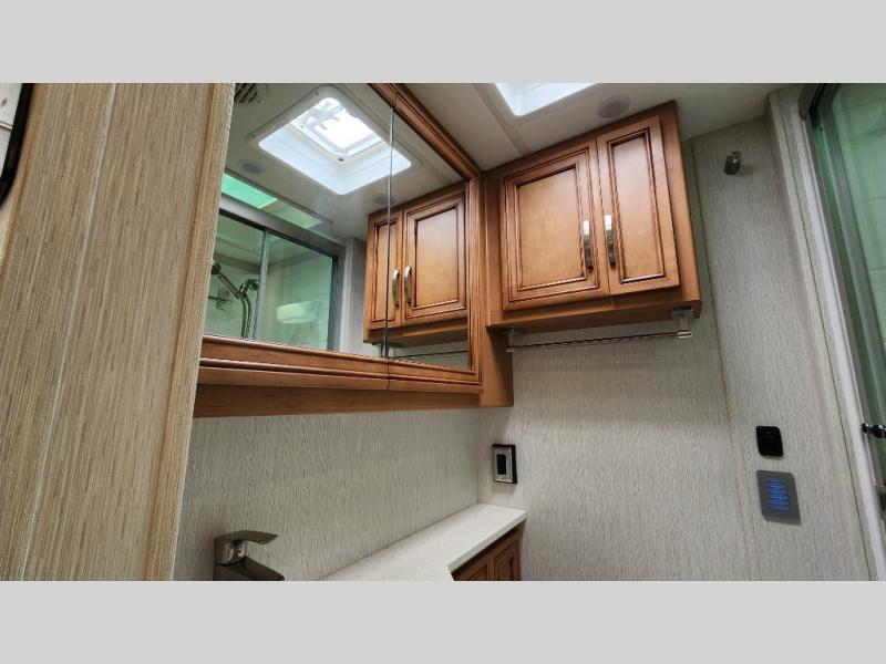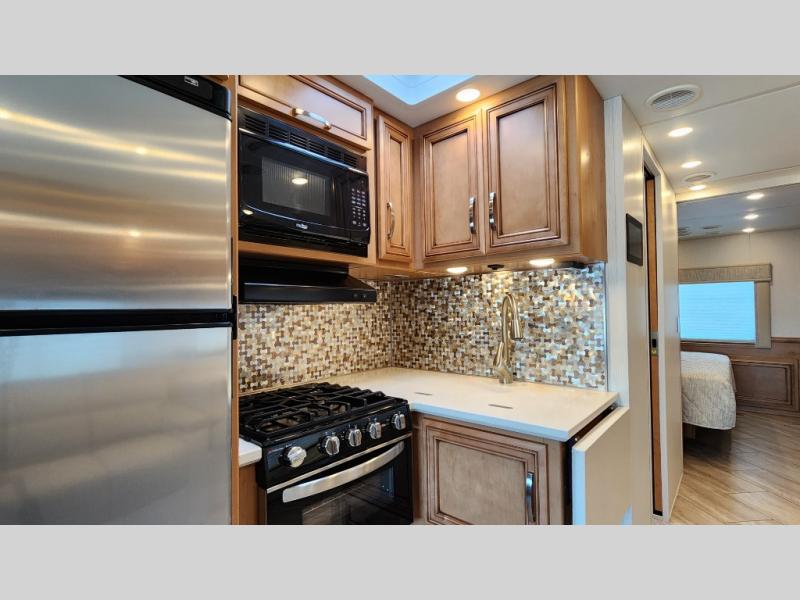 You're going to love how much space you have in this coach thanks to the full-wall slide and the king bed slide out. Your crew can get comfortable on the sofa comfort lounge or dine at the booth dinette, plus there is an overhead TV to watch your favorite shows. The chef of your group can whip up a hearty lunch on the three burner cooktop, or use the microwave oven to heat up leftovers. You'll find plenty of storage space throughout for all your things, including overhead cabinets, a shirt wardrobe in the bedroom, plus a mid-coach linen/pantry that can be used for food, towels, or bath necessities!