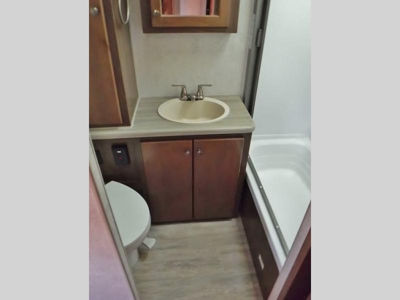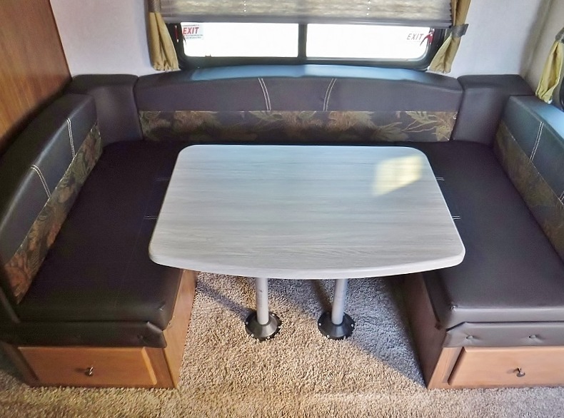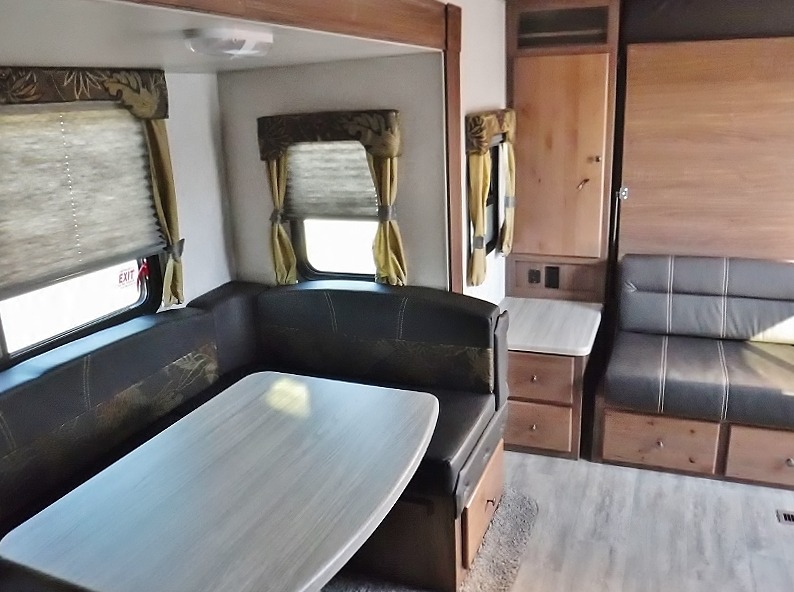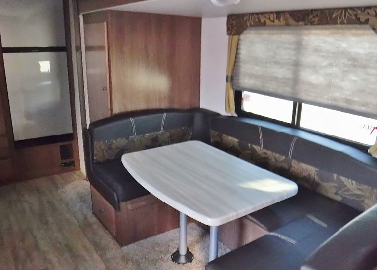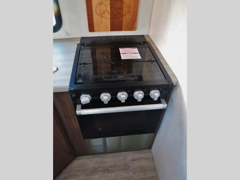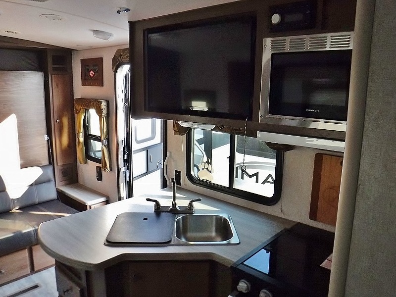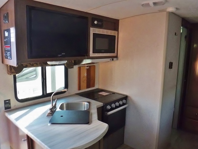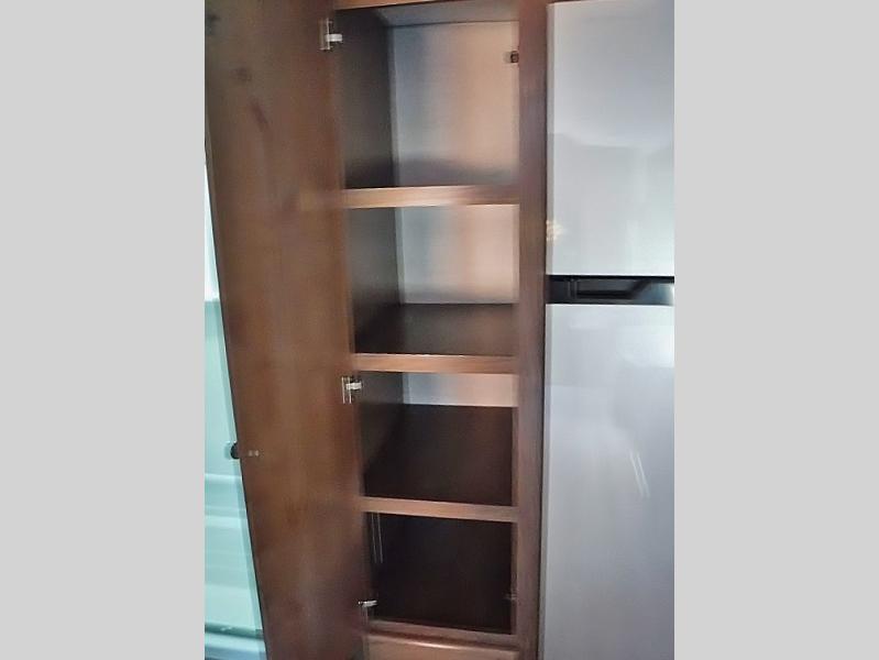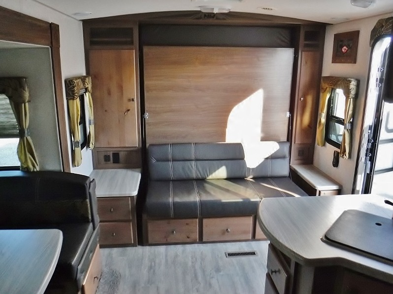 A family of three or four will love camping in this trailer with the versatile front roll over sofa and 60" x 74.5" Murphy bed, and the slide out with a U-shaped dinette and wardrobe. The dinette converts to 45" x 85" sleeping area for your child or smaller children at night making it versatile for your needs. You will find three wardrobes for your clothing, a pantry for your dry goods, and exterior storage for your outdoor gear. The full bathroom will let you freshen up before bedtime, and the kitchen offers a three burner range plus a 10 cu. ft. 12V refrigerator to keep cold items fresh!