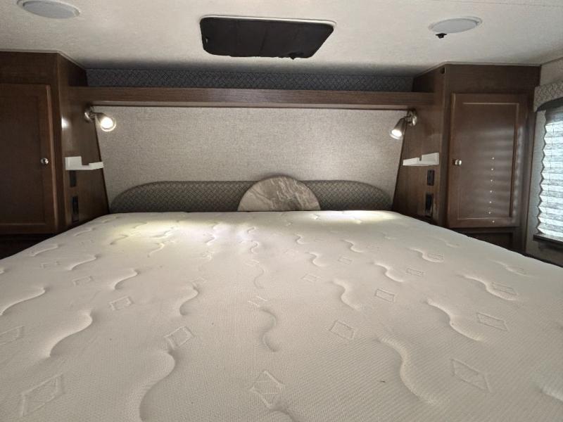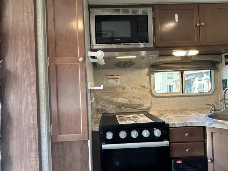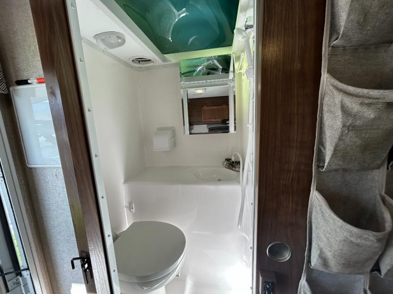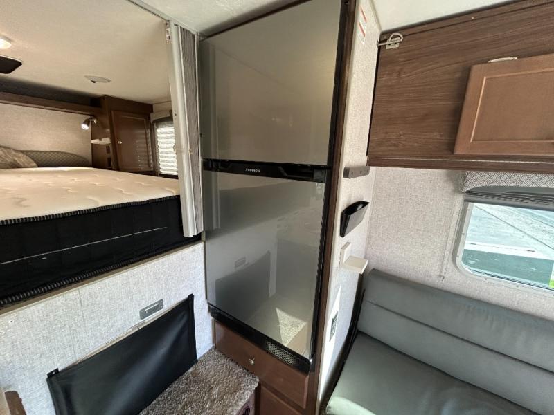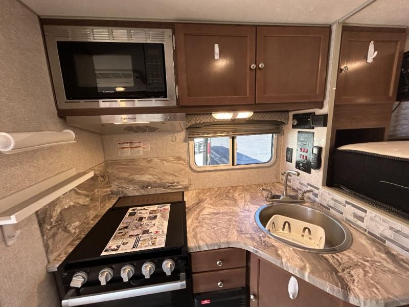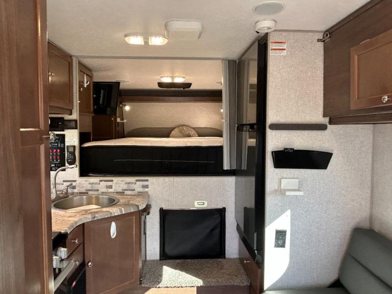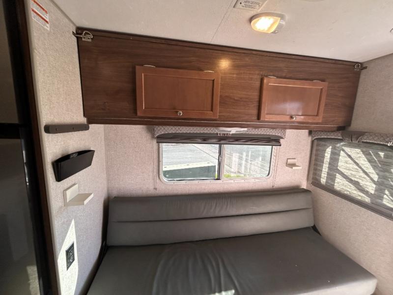 Head across the states in this comfortable truck camper for four. Once you find a campground to park for the night, start lunch on the three burner cooktop, or use the microwave for a quick meal. The U-shaped dinette will be the perfect place to dine at, or you can choose the optional roll-over sofa here. The dinette converts to a 38" x 77" sleeping area, plus there is an overhead bunk. You will enjoy the front 58" x 80" queen bed that includes three wardrobes and a nightstand for your things, and don't forget to add the optional 19" 12V LED TV for movies in bed.