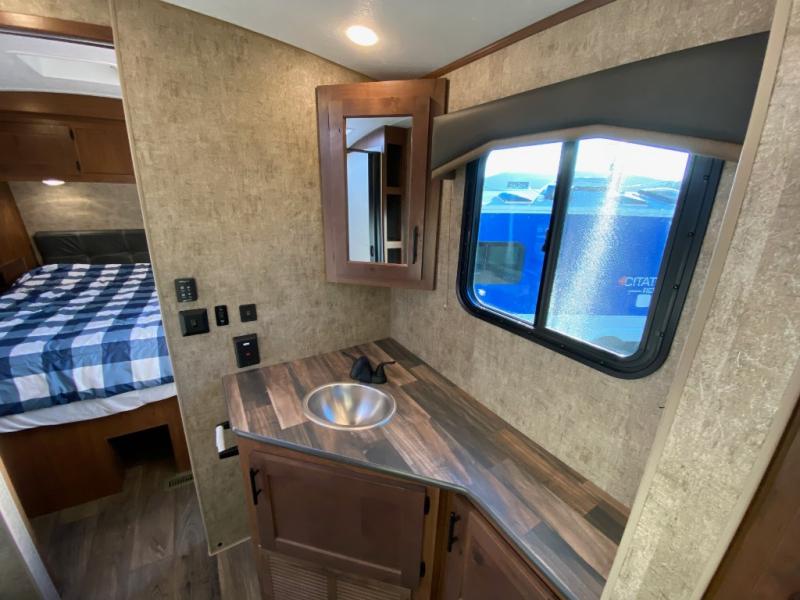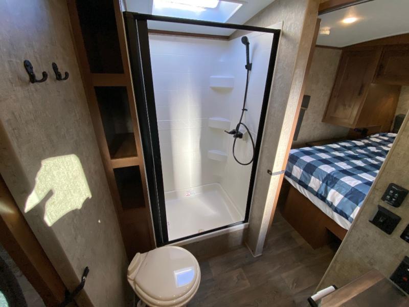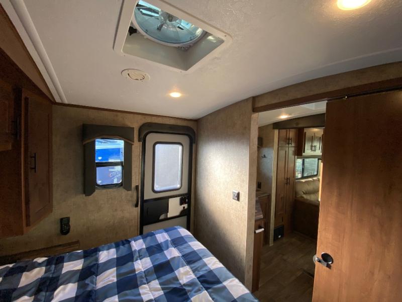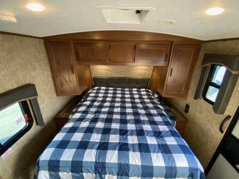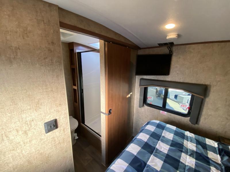 Pack your bags and escape the city life for weekend camping trips in this dual entry travel trailer. When you arrive at the campsite, take a hike to stretch your legs, then come back to prepare lunch on the three burner cooktop. You'll find plenty of counter space in the kitchen, plus a refrigerator for cold drinks and perishables. The dual lounge chairs will have you feeling right at home, or you can choose the optional sofa with built-in recliners, or the optional sleeper sofa if you need more sleeping space. This model includes a walk-through bath that is both spacious and convenient since it leads to to the front master bedroom. You can't beat a queen bed, dual bedroom wardrobes, and your own exterior entry door!