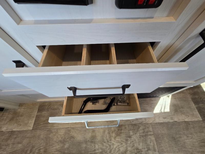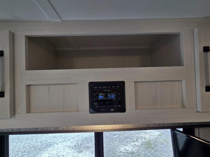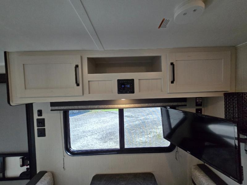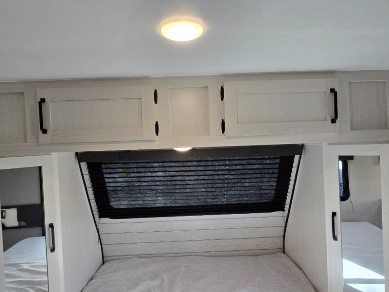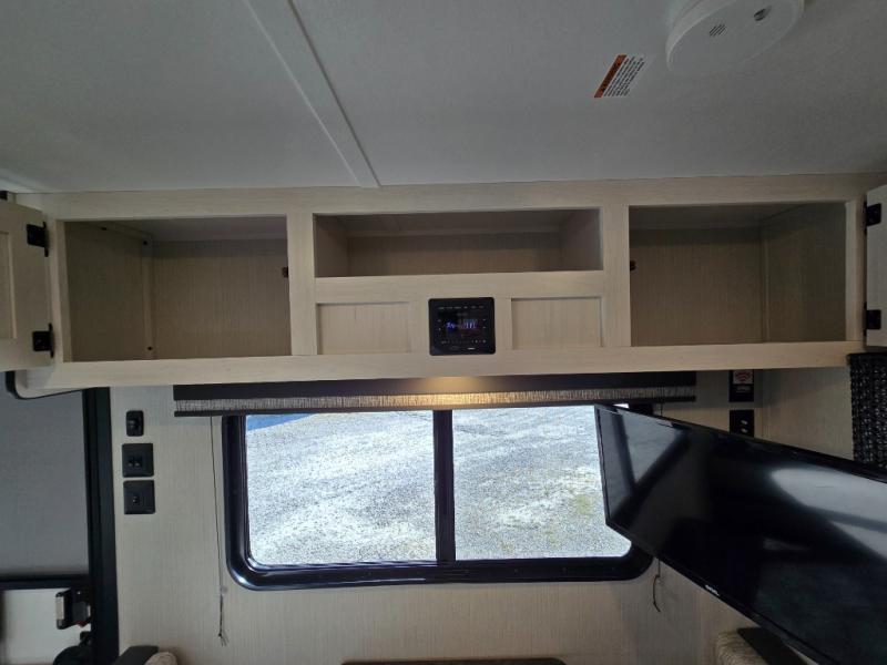 The front walk-around RV queen bed ensures a comfortable night’s sleep. There’s plenty of storage on each side of the bed for your clothing and other personal items, and overhead storage is available for things like blankets and extra bedding.