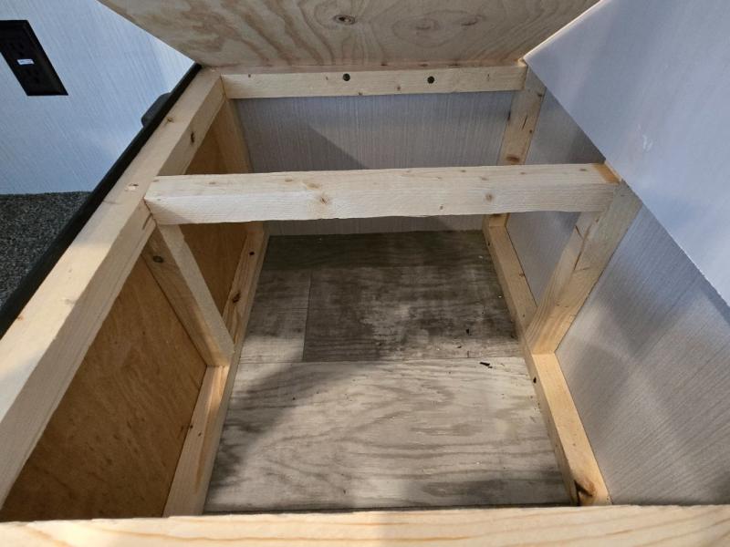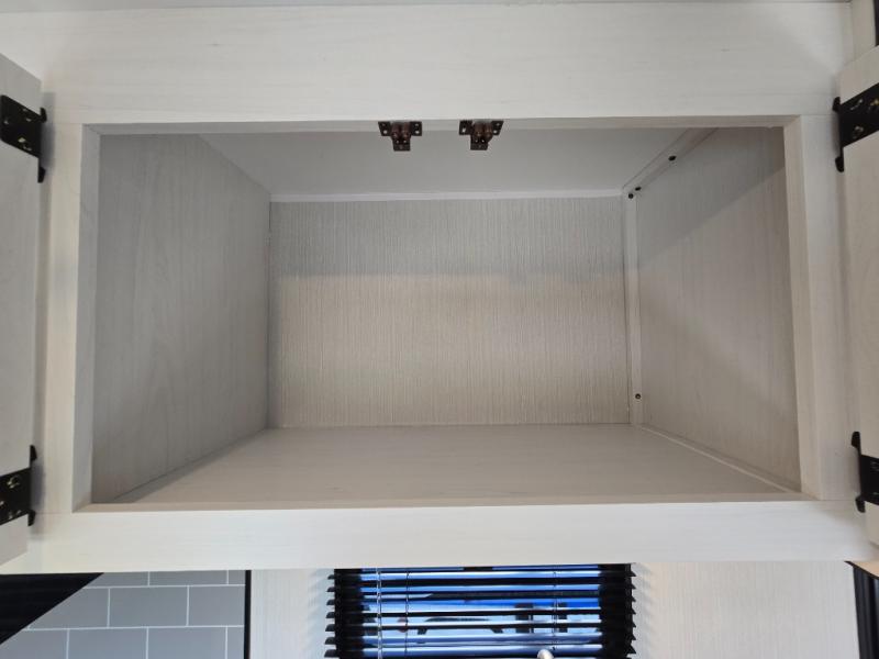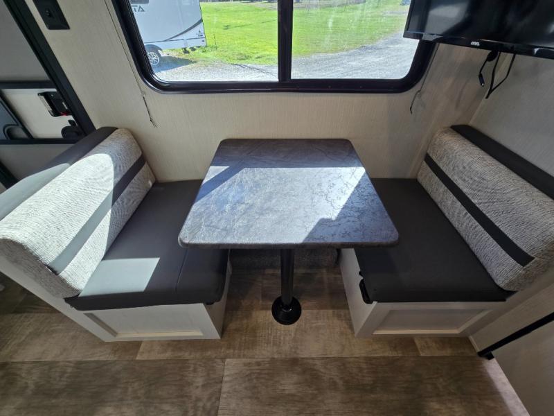 The booth dinette is perfect for meals or relaxation, designed for two. It also comes with overhead storage, ideal for stowing dry goods, plates, and games, making it easy to keep your living space organized.