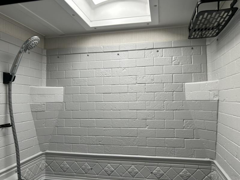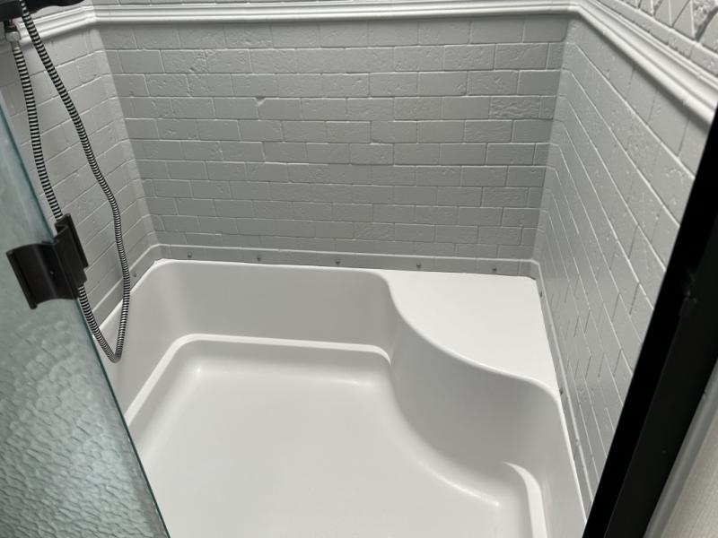 Full rear bathroom with roomy shower and built-in seat for comfort and convenience