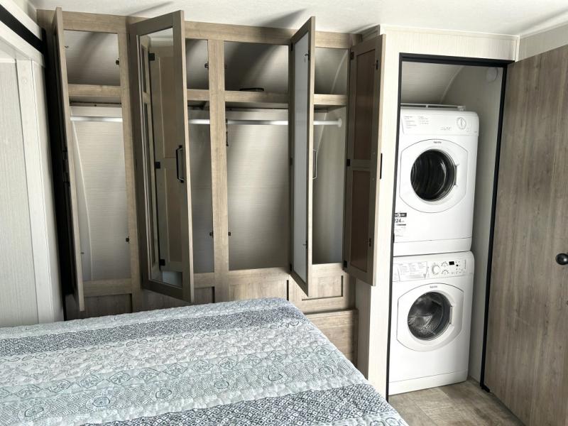 Private front bedroom with queen bed slide, large wardrobe, washer/dryer prep, and its own entrance