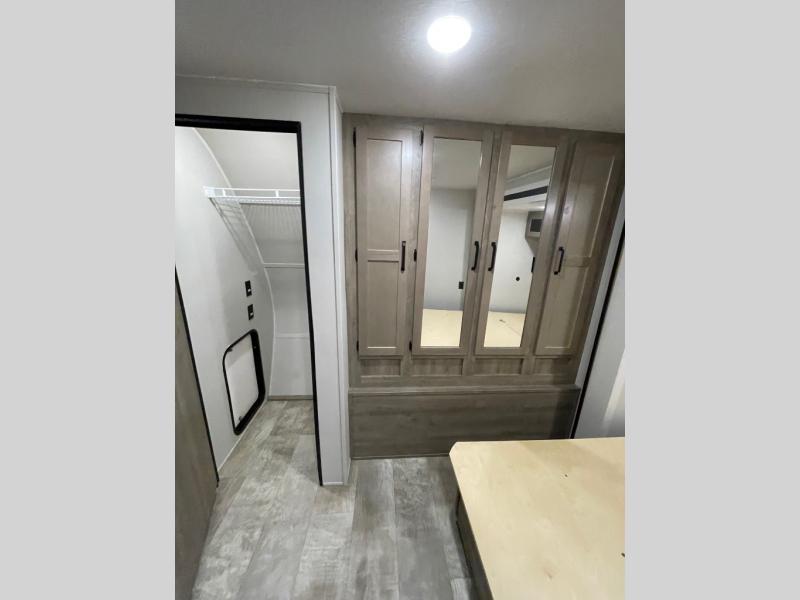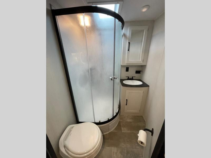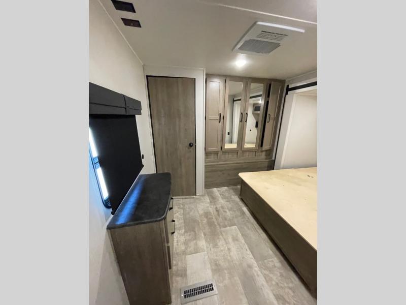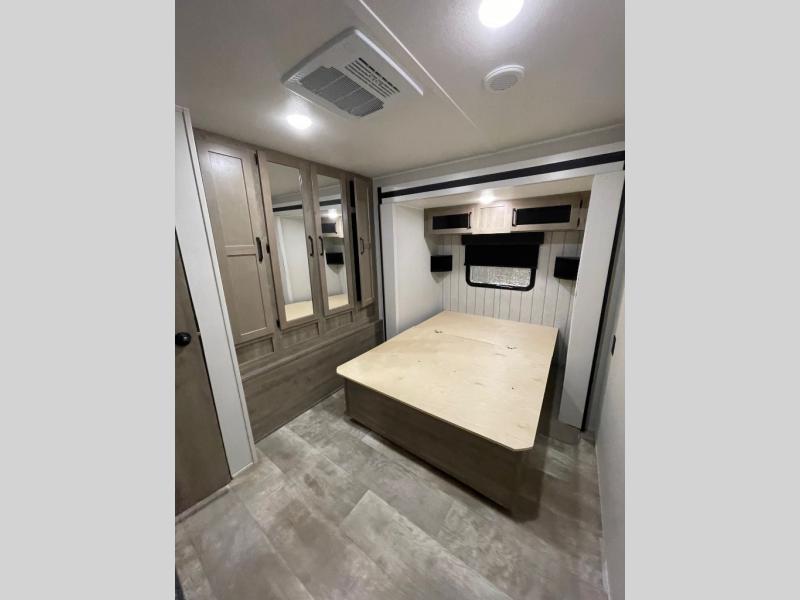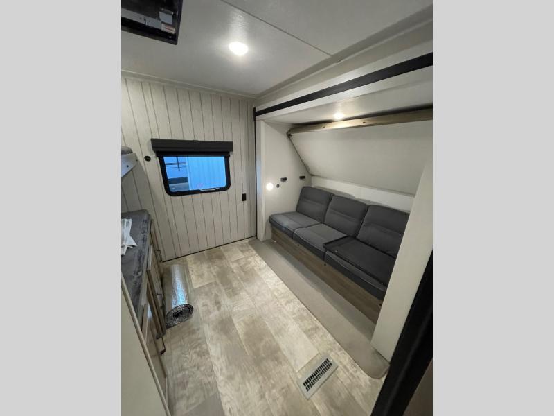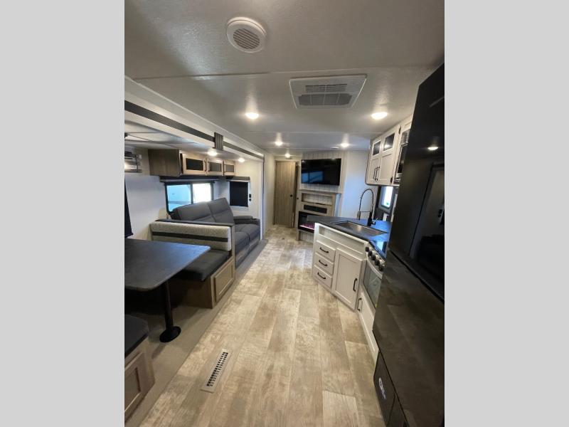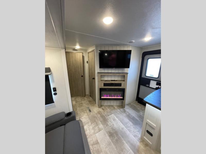 With dual entry doors and a bath and a half, you will have the ultimate in convenience with this travel trailer! The bedroom also has a front closet to keep your clothes looking their best and a queen bed slide for you to sleep your best. Everyone can freshen up in the full bathroom with the 34" x 34" radius shower and fill their bellies with scrambled eggs cooked on the three burner cooktop. Enjoy your meals, play games, and even sleep at the booth dinette or relax on the sofa while watching a movie with the entertainment center and fireplace. And your guests will love the rear private bunkhouse with three bunks, a jiffy sofa, and a slide out for more space! This model also includes an optional outside mini kitchen with a griddle!