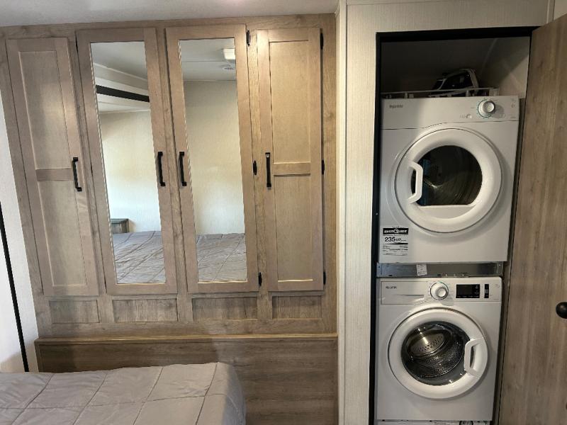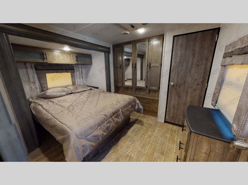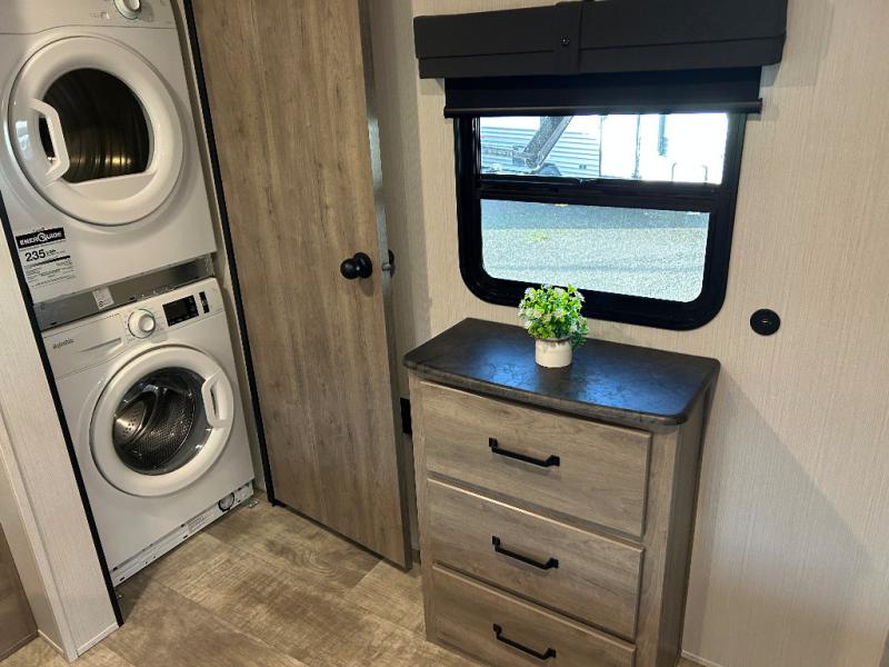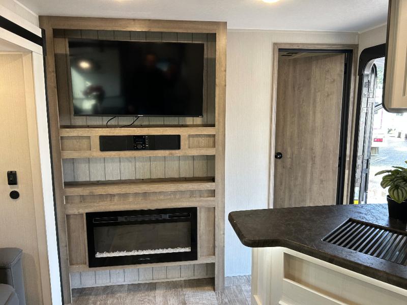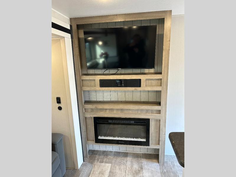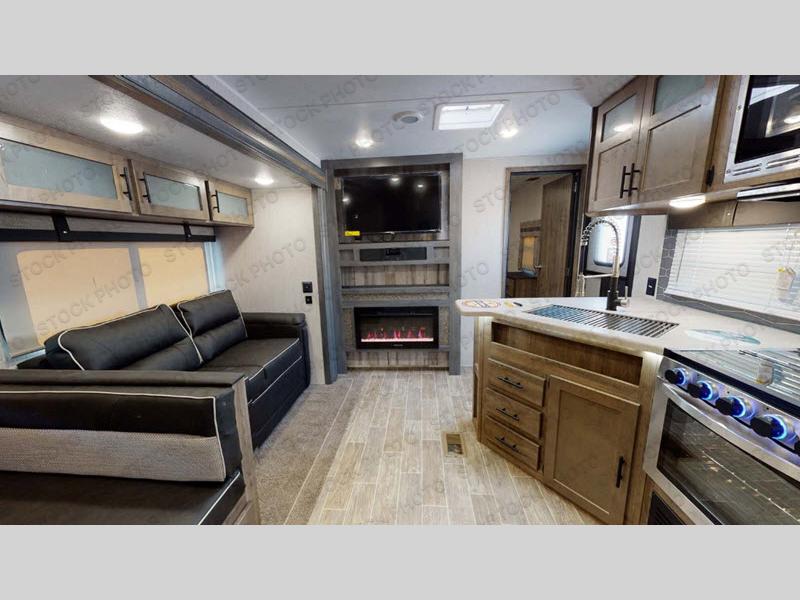 Enjoy your own privacy with two bedrooms in this travel trailer! The front private bedroom has a queen bed slide across from a dresser and a front closet with another closet with washer and dryer prep. The rear private bedroom has a 60" x 74" queen bed slide, a dresser, and a closet. Everyone can stay clean in the full bathroom with the 34" x 34" radius shower and their bellies full with a three burner cooktop. Enjoy your meals at the U-shaped dinette then relax on the sofa while watching your favorite movies with the entertainment center and fireplace.