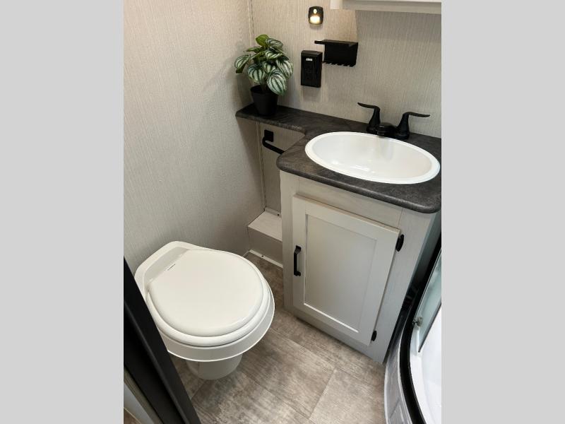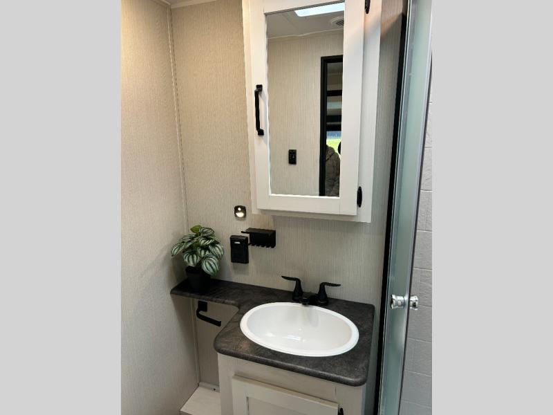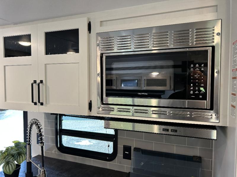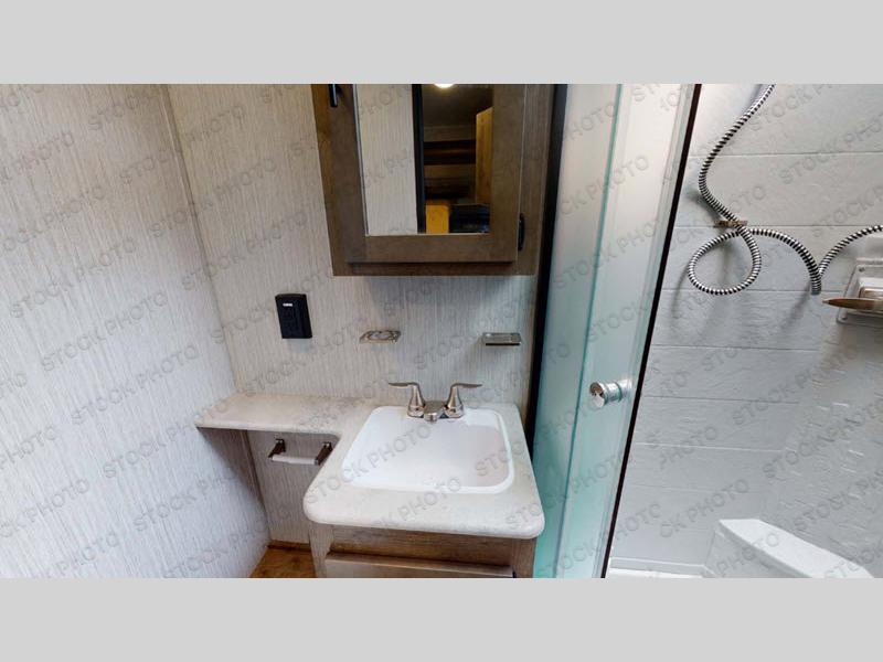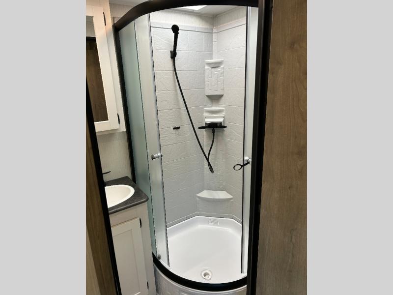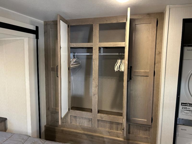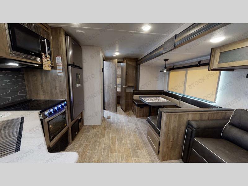 Enjoy your own privacy with two bedrooms in this travel trailer! The front private bedroom has a queen bed slide across from a dresser and a front closet with another closet with washer and dryer prep. The rear private bedroom has a 60" x 74" queen bed slide, a dresser, and a closet. Everyone can stay clean in the full bathroom with the 34" x 34" radius shower and their bellies full with a three burner cooktop. Enjoy your meals at the U-shaped dinette then relax on the sofa while watching your favorite movies with the entertainment center and fireplace.