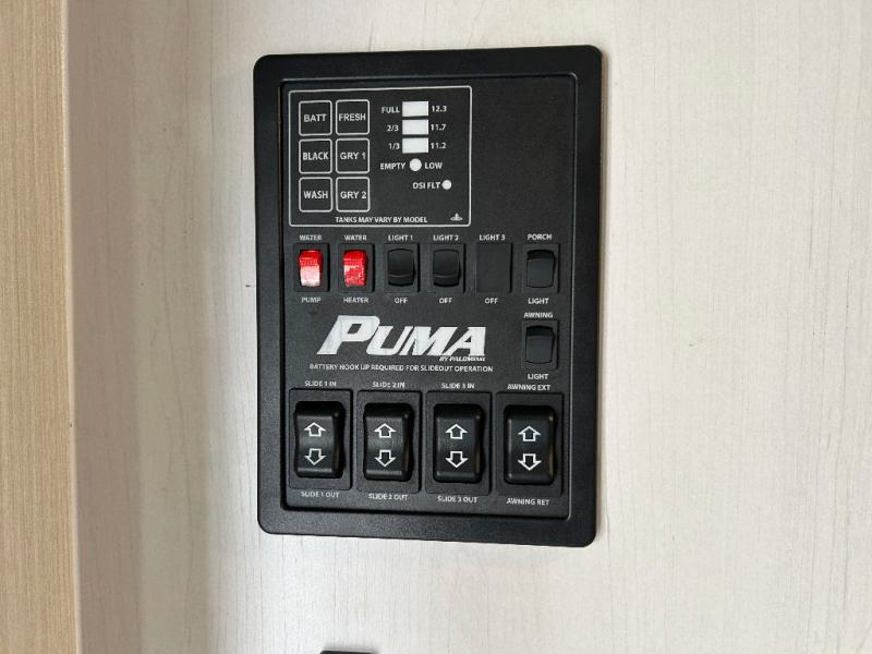 If you're looking for family-fun adventure then you need one of these Palomino Puma fifth wheels and travel trailers! They are built rugged, easy to tow, and jam packed with features. The Darco wrapped underbelly will protect your units vitals through every season and the AlphaPly roofing membrane covers it. They also have super lube axles and a powder coated frame. Their luxurious interiors feature a spice rack and built-in knife rack in the kitchen, USB charging ports to keep your electronics at 100%, and high density foam mattresses for a good night's rest. The required Advantage package comes with night roller shades for privacy at night, two outside speakers to crank up the tunes while you play cornhole, and an outside shower to keep the dirt outside where it belongs, plus so much more!