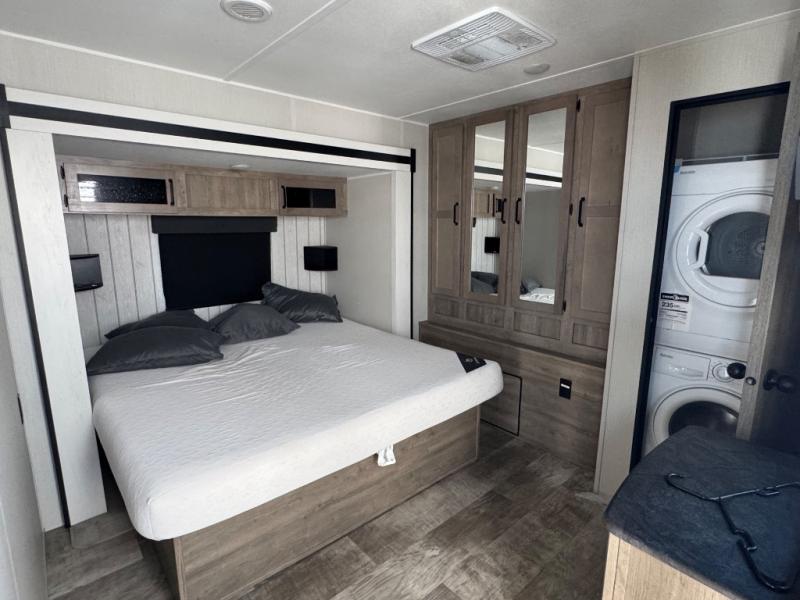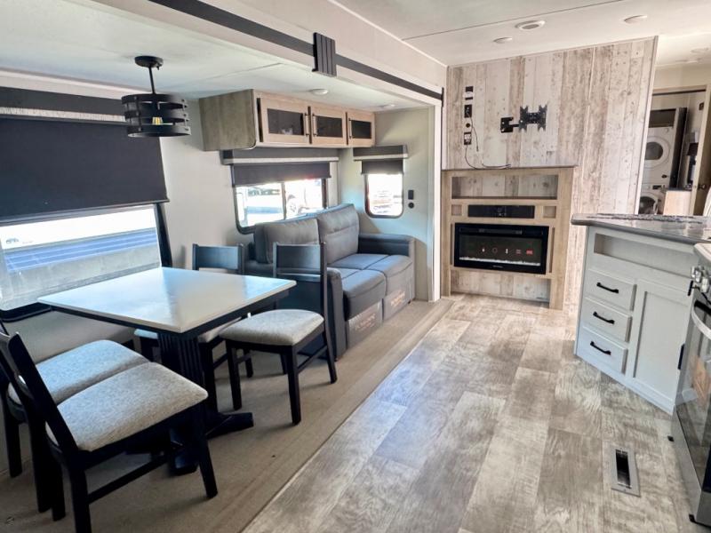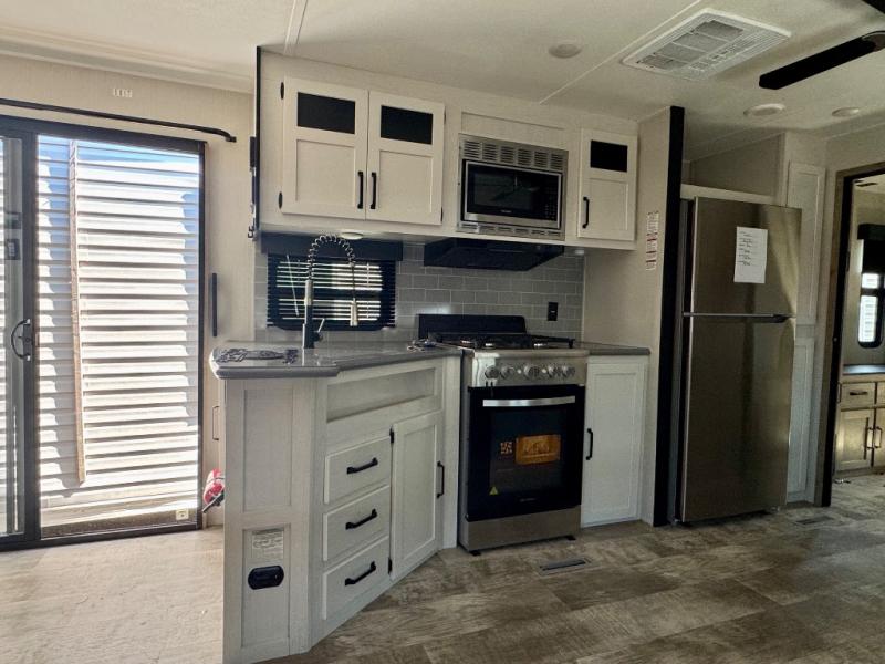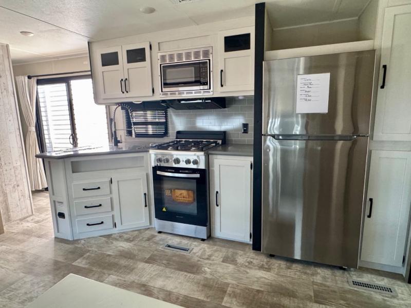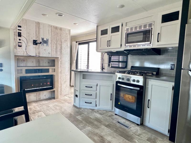 Get out of town and start enjoying the beautiful weather and scenery where you have chosen to place this Puma Destination. This spacious trailer has three slide outs for lots of interior floor space, plus two entries for convenience. The front bedroom offers a king bed slide, two closets, and a dresser. The rear bedroom suite includes a full bathroom and a queen bed slide, a vanity and a wardrobe. In between you can relax in the combined living and kitchen area on the sofa or booth dinette while visiting with the cook with full amenities.