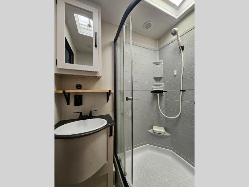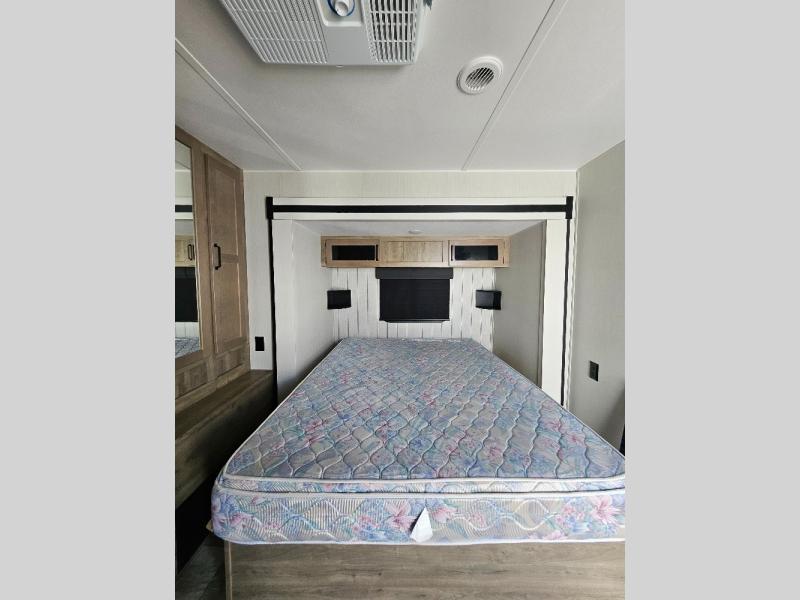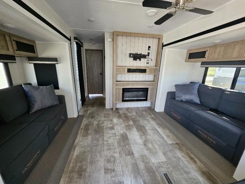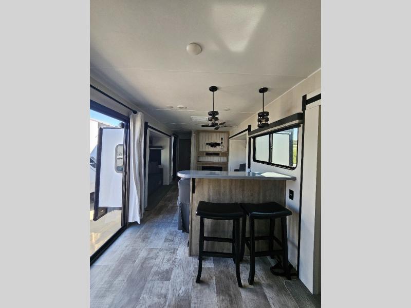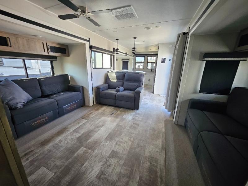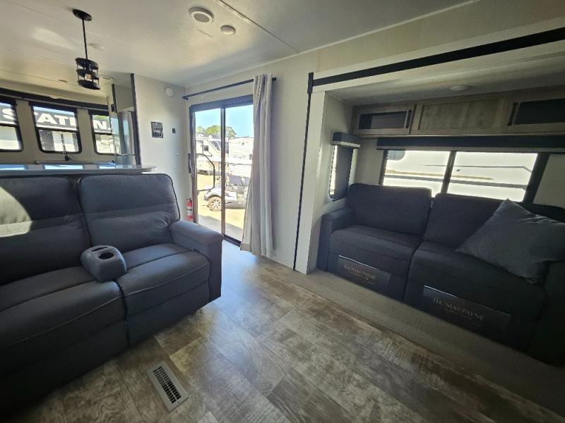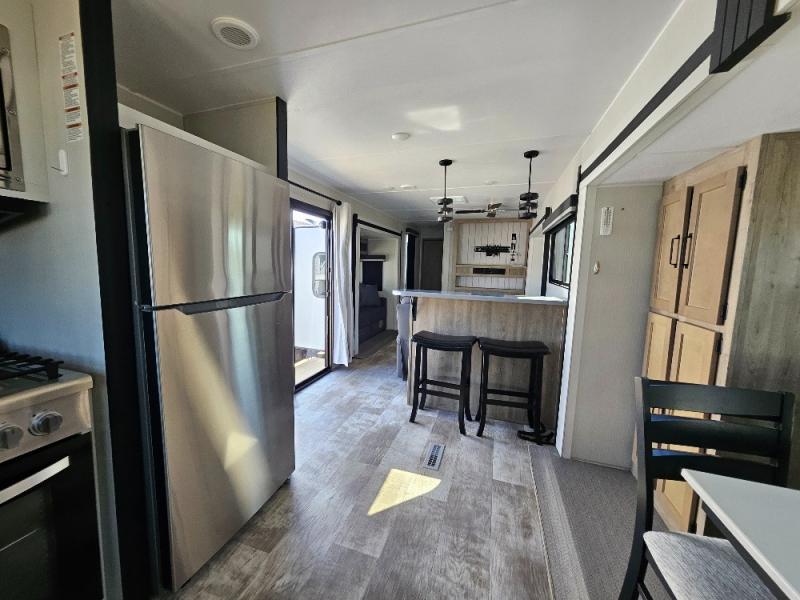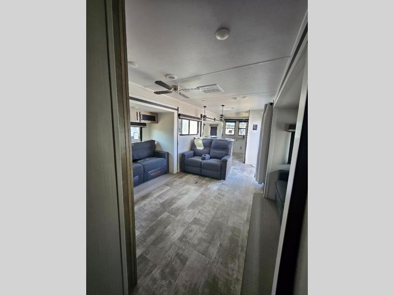 If you are looking for your own space in your next destination trailer, you have found it! With a front separate kitchen, a middle separate living area, a full bathroom and a rear bedroom, you can call one of these spaces your own. The cook will love the front counter space and appliances, and you can dine at the booth dinette or the breakfast nook. Someone can be visiting with friends and family while sitting on the two sofa slides or the two recliners, while another is getting ready in the full bathroom. You will sleep soundly on the king bed slide out, and the closet with washer and dryer prep will make full-time RV living easier than ever.