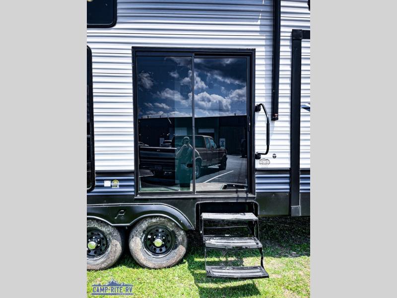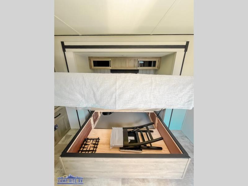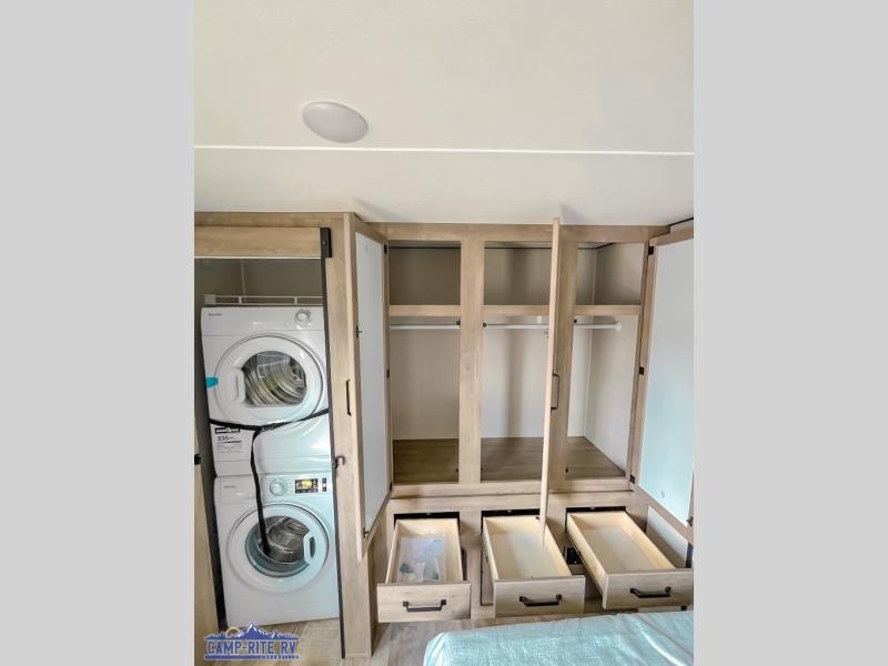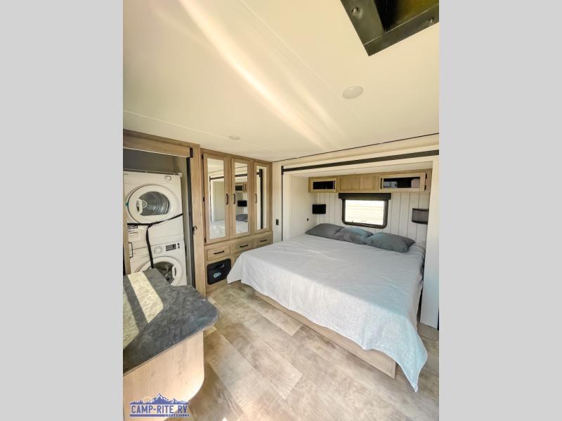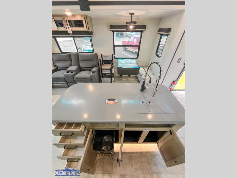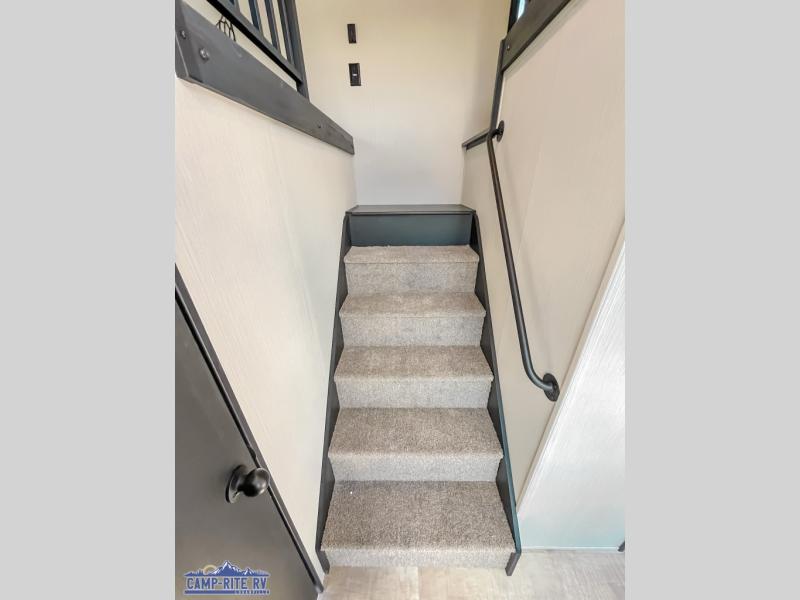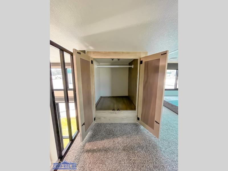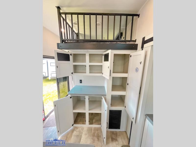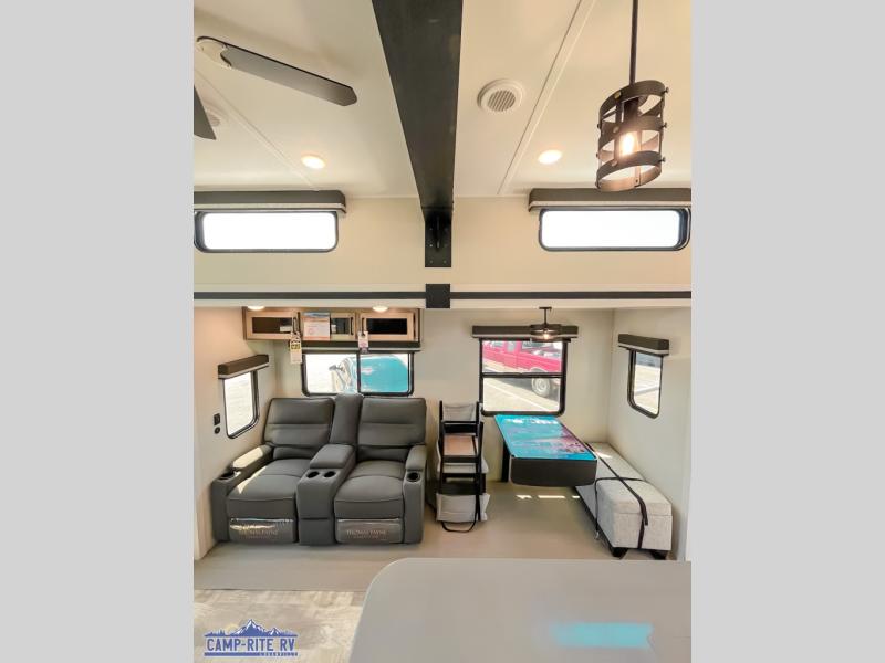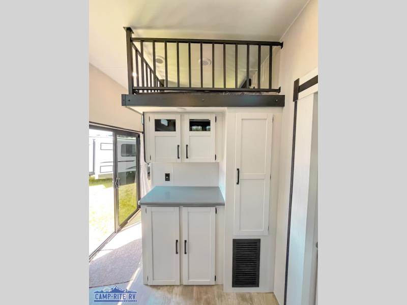 This loft model is the perfect destination trailer for a family of six or more! The upper loft is over the rear bedroom and mid-coach bath featuring two 32" x 69" beds and a 58" x 58" bed over the bath portion with cabinets and a wardrobe/closet for your things. On the lower level in back, a private bedroom with private entry/exit includes a king bed slide, plenty of closet space with one featuring a washer/dryer prep option. The full bath offers a 32" x 40" shower, double linen cabinets, plus a toilet and vanity. In the combined kitchen and living area, the dual opposing slides really open up the space. Here you will find a kitchen island with a large sink, a free standing table with one bench and two chairs, plus two recliners along the curb side slide. Opposite, your kitchen appliances and entertainment center with a residential style refrigerator for your perishables. The very front of the unit features a sofa, and there are plenty of storage spaces between overhead cabinets, pantry/linen and wardrobe storage, plus outside compartments for your things as well.