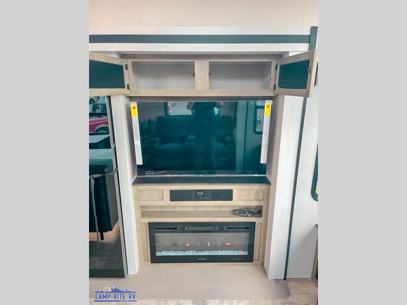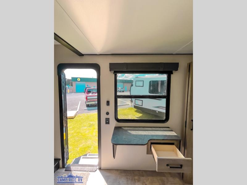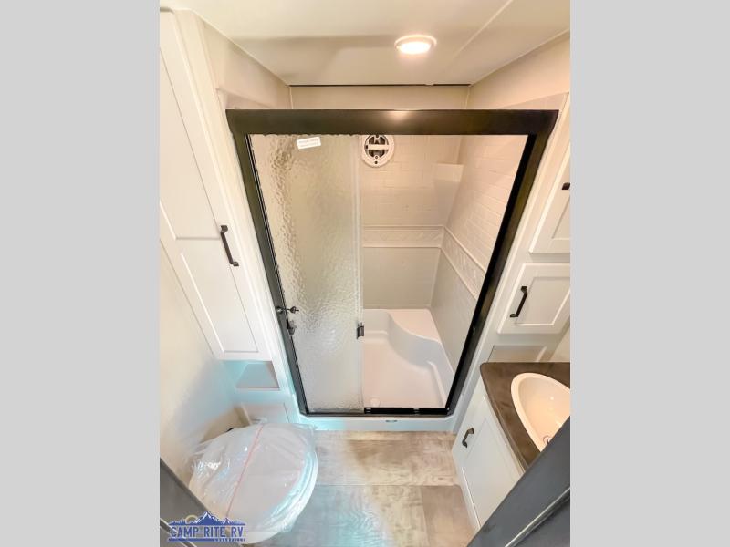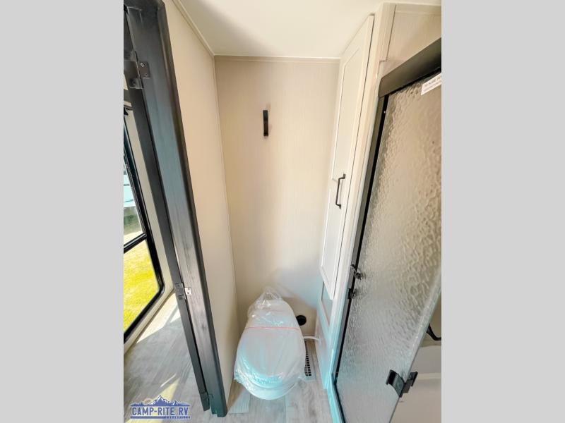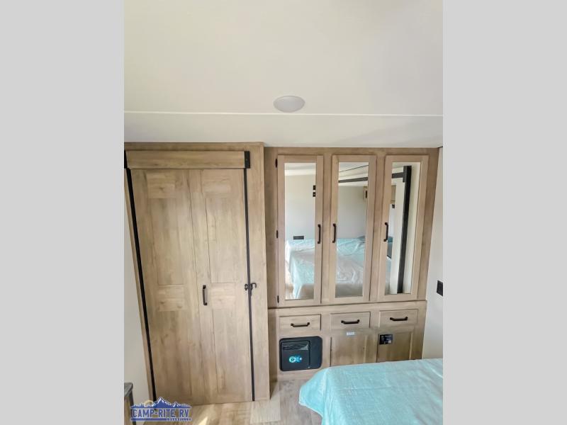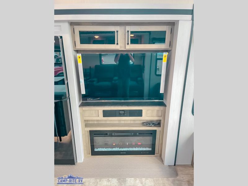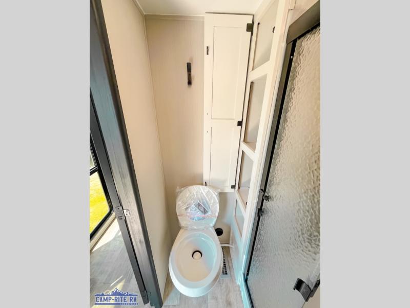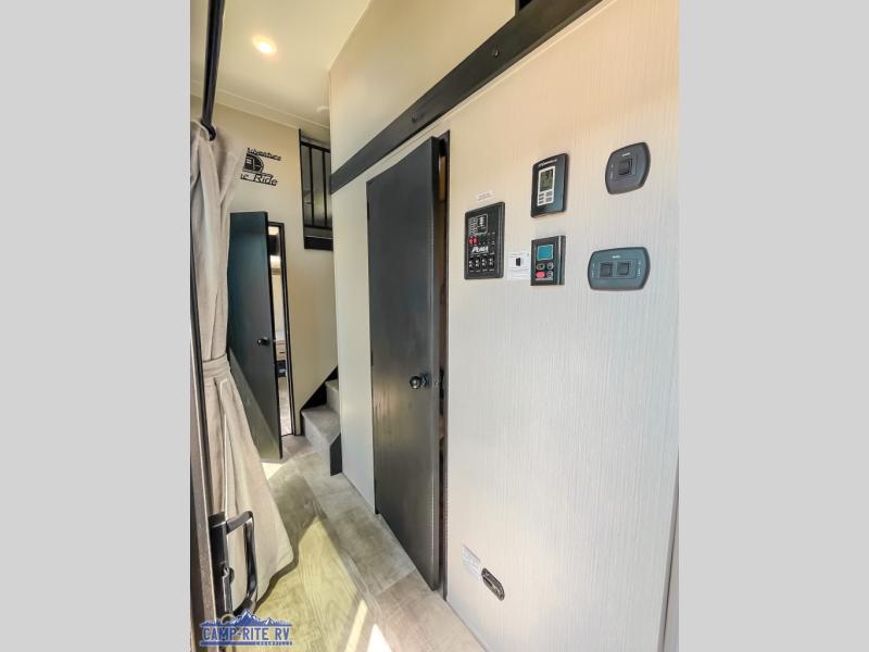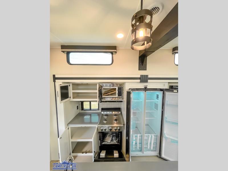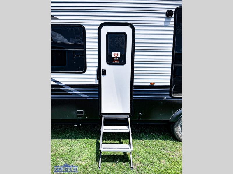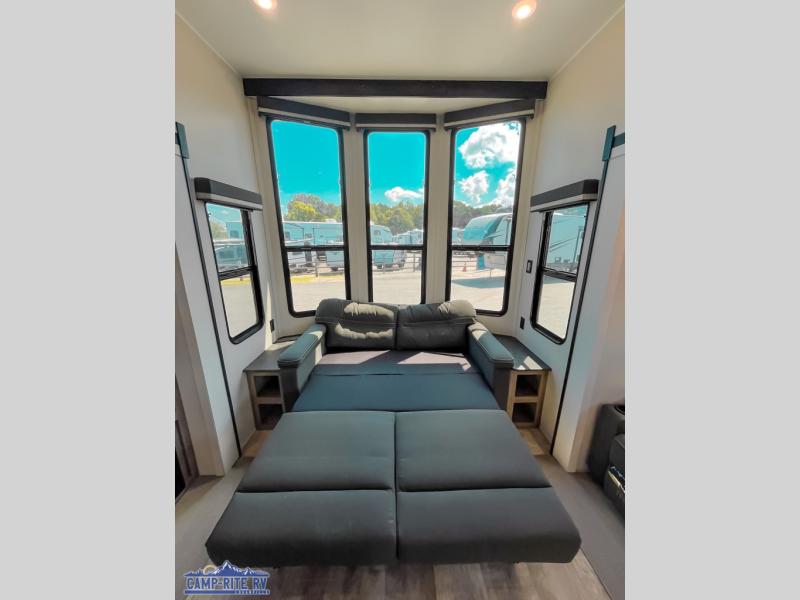 This loft model is the perfect destination trailer for a family of six or more! The upper loft is over the rear bedroom and mid-coach bath featuring two 32" x 69" beds and a 58" x 58" bed over the bath portion with cabinets and a wardrobe/closet for your things. On the lower level in back, a private bedroom with private entry/exit includes a king bed slide, plenty of closet space with one featuring a washer/dryer prep option. The full bath offers a 32" x 40" shower, double linen cabinets, plus a toilet and vanity. In the combined kitchen and living area, the dual opposing slides really open up the space. Here you will find a kitchen island with a large sink, a free standing table with one bench and two chairs, plus two recliners along the curb side slide. Opposite, your kitchen appliances and entertainment center with a residential style refrigerator for your perishables. The very front of the unit features a sofa, and there are plenty of storage spaces between overhead cabinets, pantry/linen and wardrobe storage, plus outside compartments for your things as well.