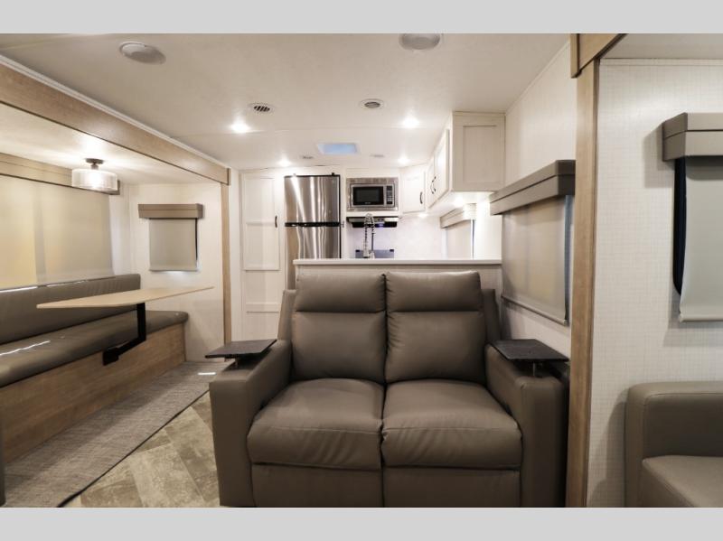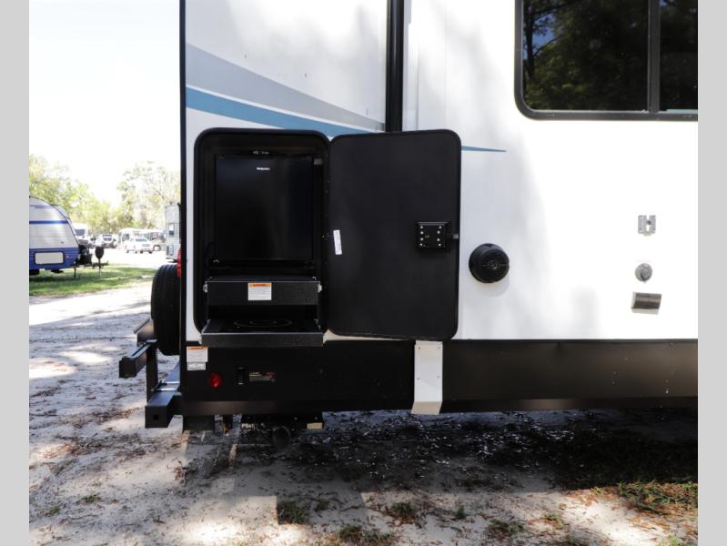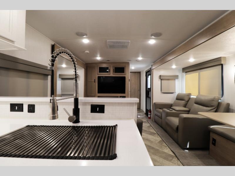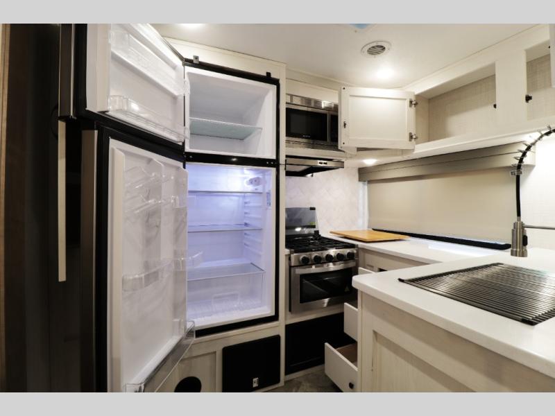 Step inside and you’ll immediately notice the spacious rear kitchen layout—perfect for extended stays, entertaining guests, or family travel. The large U-shaped countertop provides exceptional prep space, while the oversized 11 cu. ft. refrigerator and pantry storage make it easy to stock up for long trips or full-time RV living.