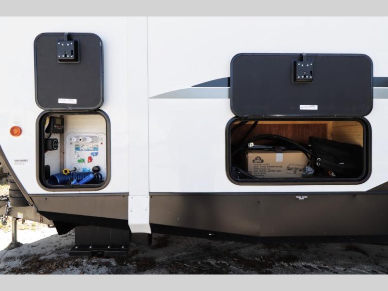 • Fresh water 42 gallons, gray 106 gallons, black 38 gallons—ideal for longer trips and off-grid capability