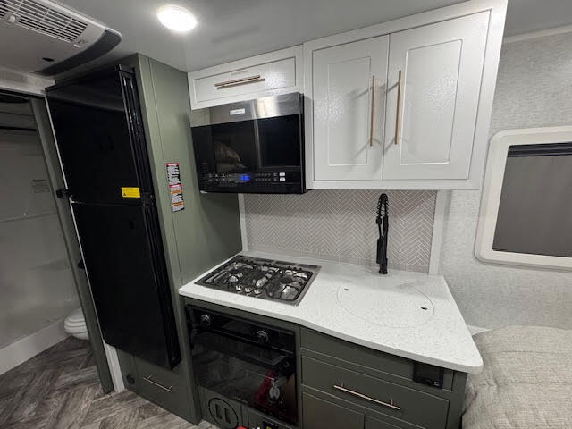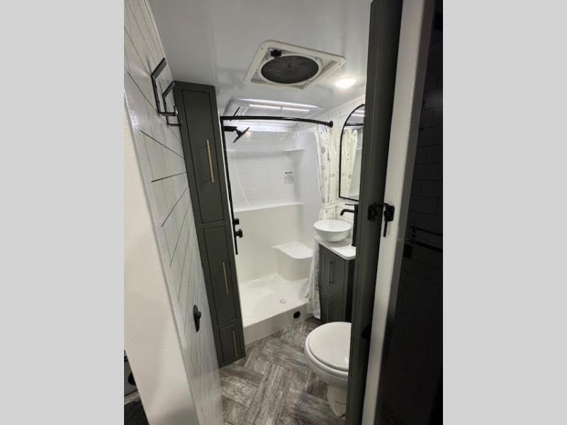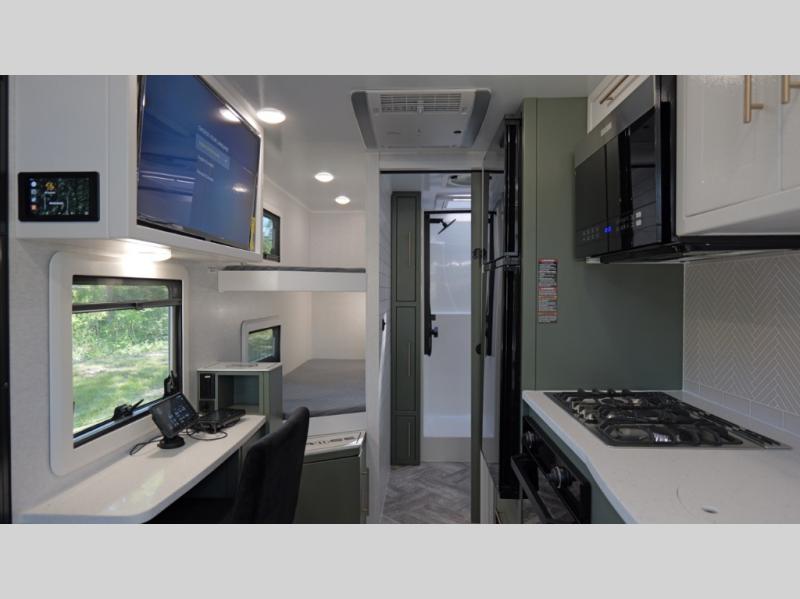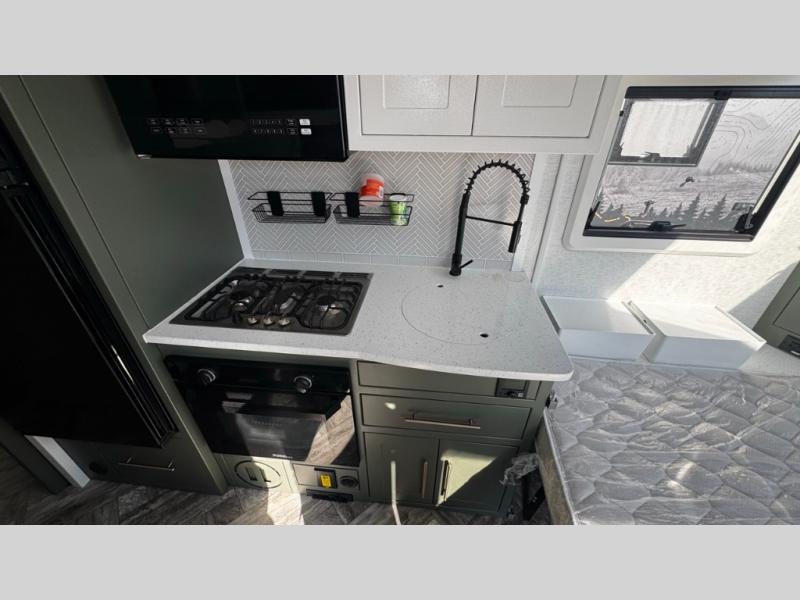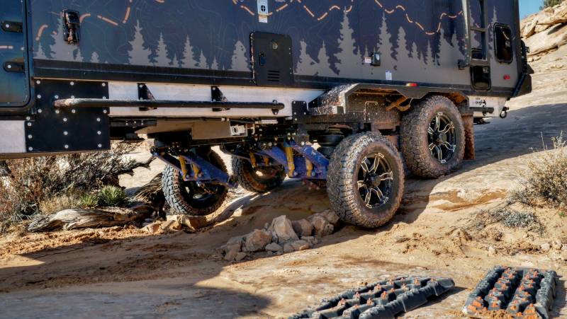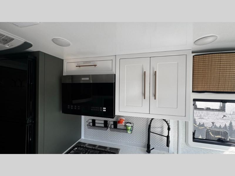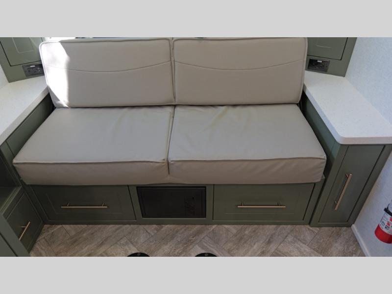 The Pause XC21.4 boasts impressive exterior features that enhance both durability and convenience. The all-composite walls, floor, and walls provide exceptional strength and longevity. A drop-down bar adds versatility to your outdoor space, while the extended slide kitchen offers a convenient area for cooking and food preparation. The Morryde huck rivet frame ensures robust construction, and the puncture-resistant underbelly provides added protection for your journeys. With a dual independent air suspension by Morryde, featuring 12 inches of travel and 25 inches of ground clearance, this trailer is equipped to handle even the most challenging terrains. Harness the power of the sun with up to 1200 watts of solar capability and an impressive 1080 amp hours of lithium Battle Born battery capacity that works hand in hand with a state-of-the-art Victron electronic management system.
