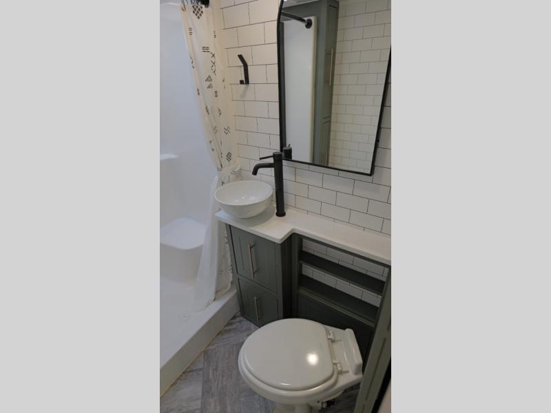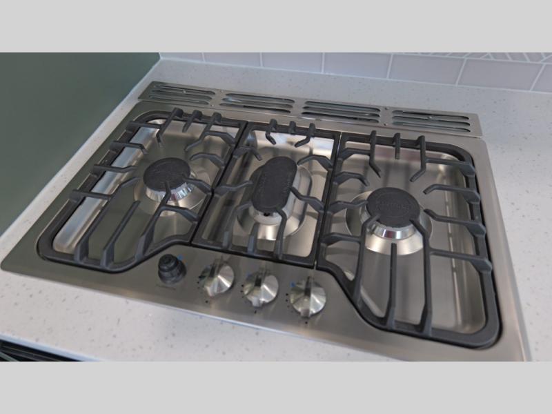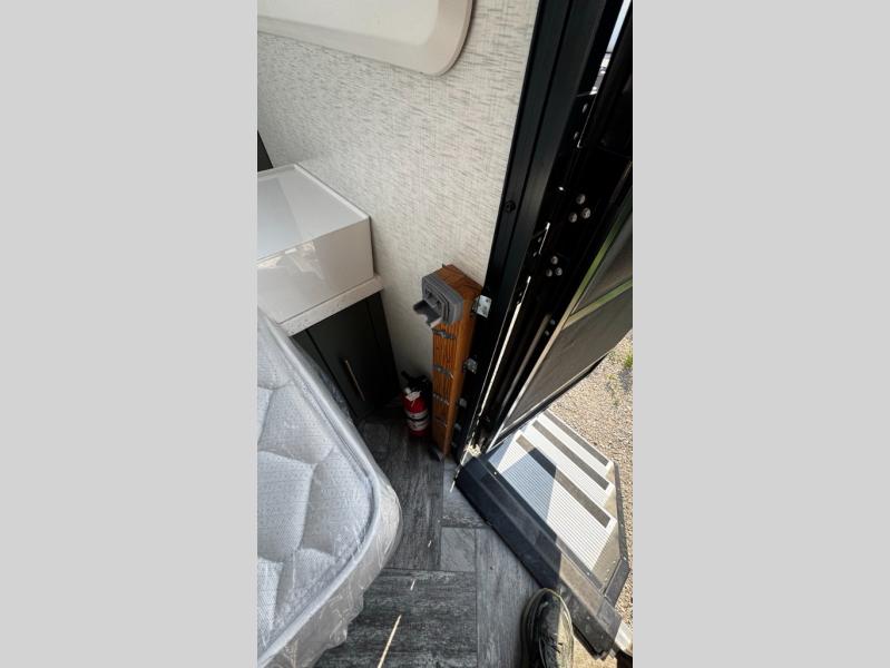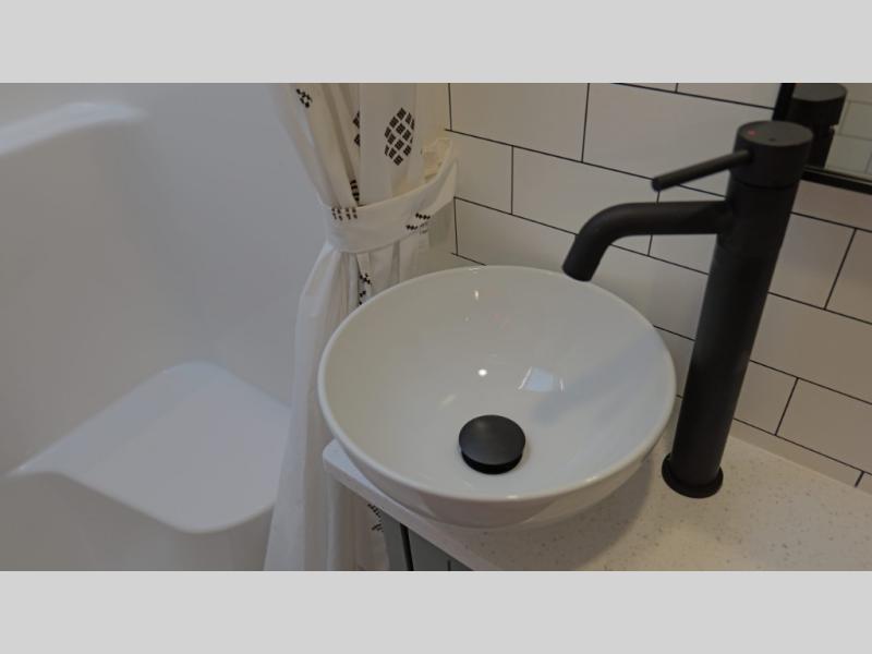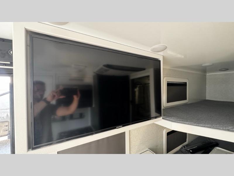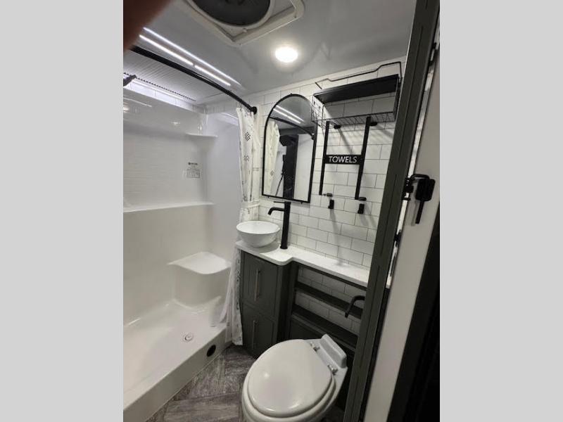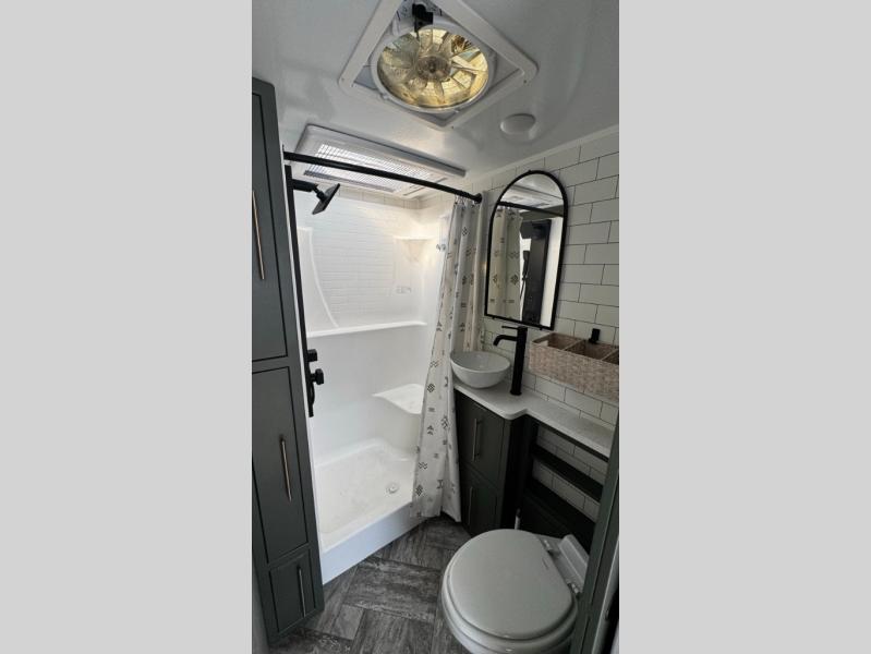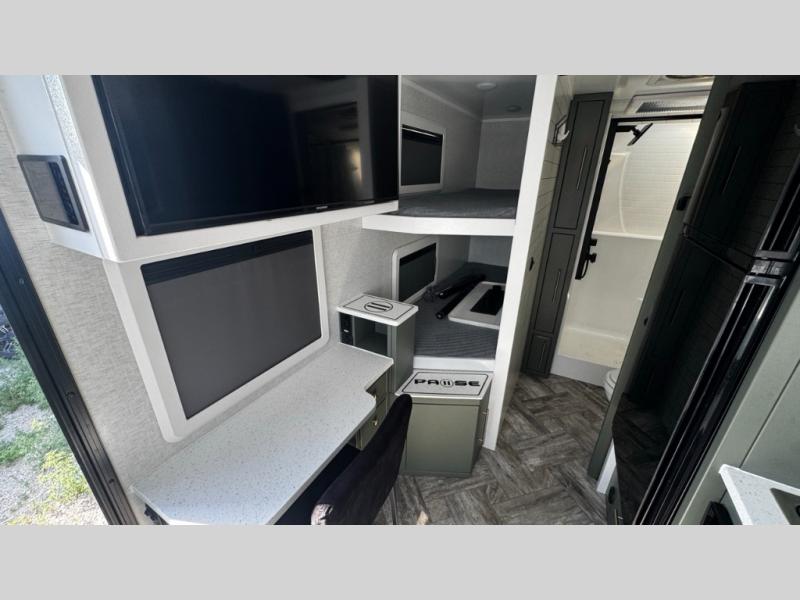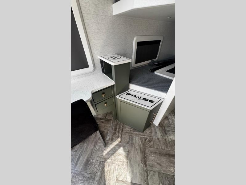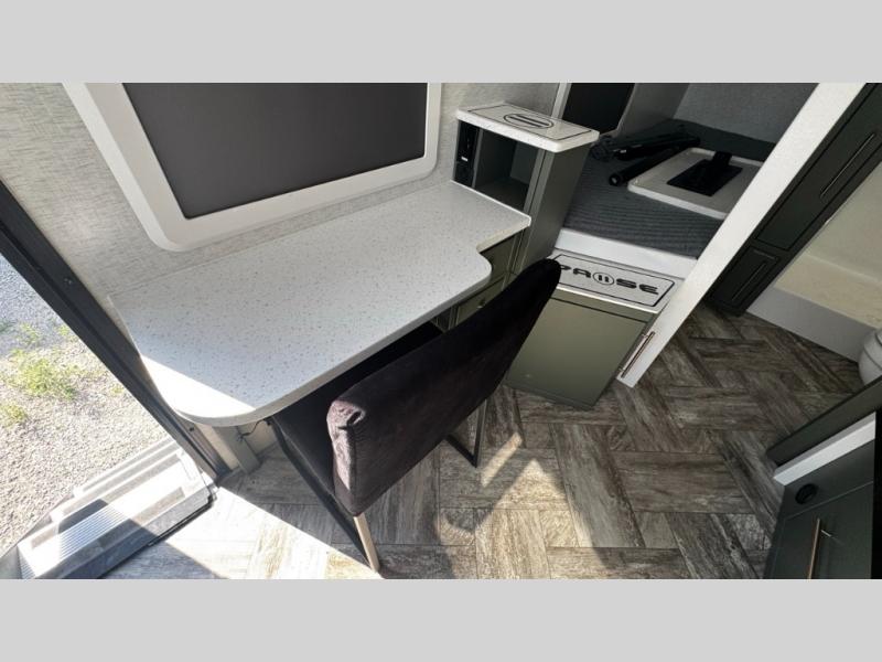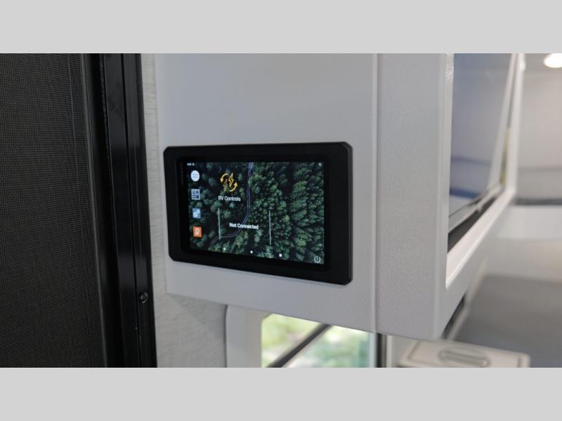 Enjoy comfortable seating with rollover seating options that adapt to your needs. The Garmin control system puts essential functions at your fingertips, providing intuitive control over various trailer features. The 3D-printed walls, crafted seamlessly, add a touch of elegance and modernity to the interior. Indulge in a luxurious shower experience with the full fiberglass shower. For remote work enthusiasts, a dedicated computer desk and chair offer a convenient space to stay productive on the go. Stay cozy with the Truma tankless water heater providing recirculating hot water, along with the Truma furnace and air conditioning system.