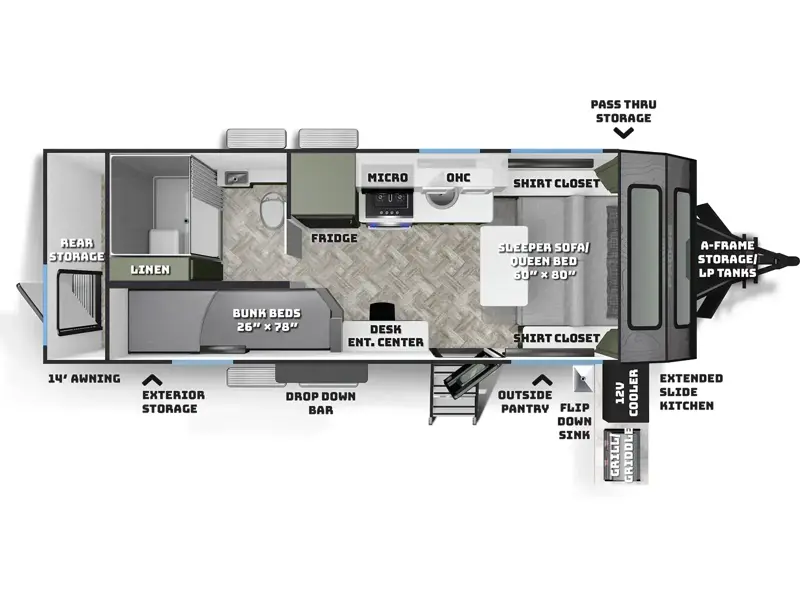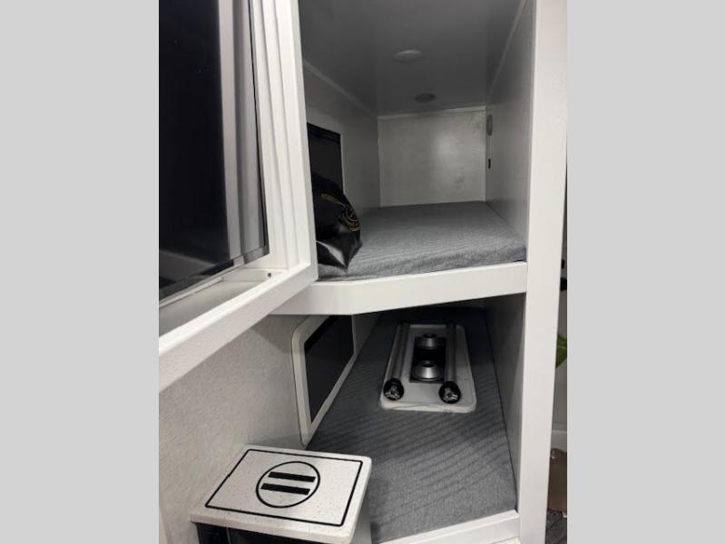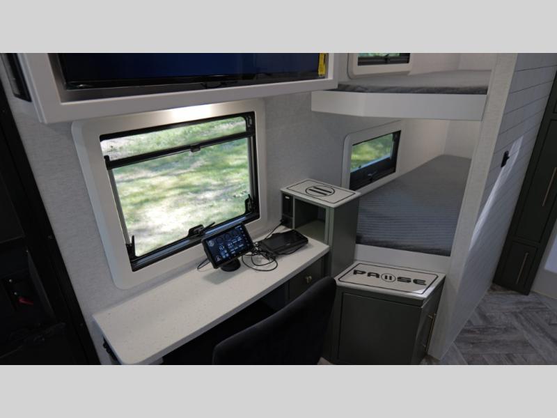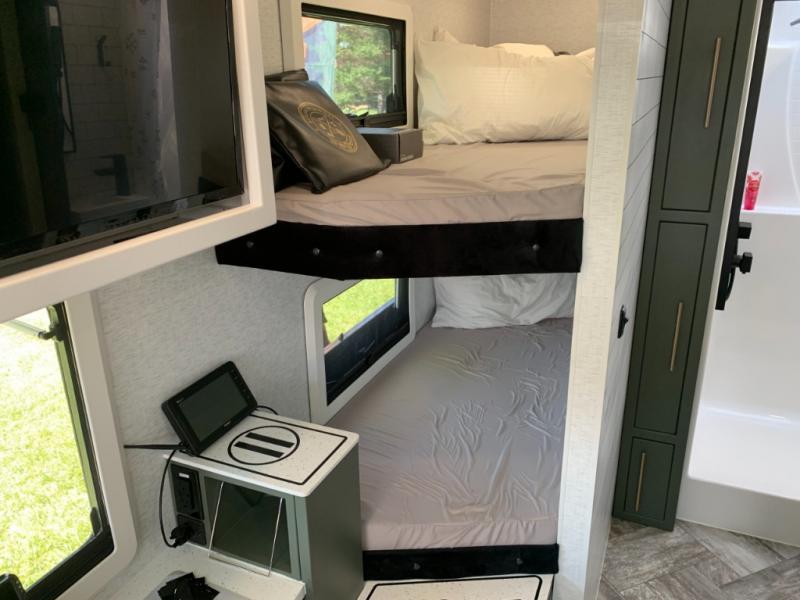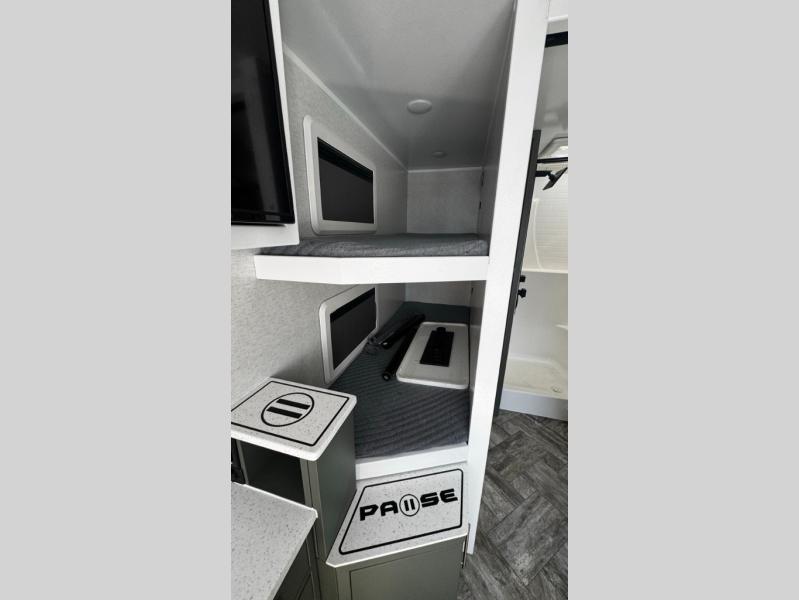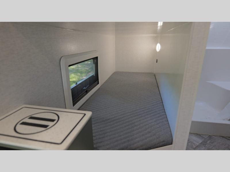 Step inside the Pause XC21.4 and be greeted by a thoughtfully designed interior that maximizes comfort and convenience. The bedroom features a spacious 60x80 bed, offering a cozy retreat after a day of exploration. The trailer also includes two 26x78 bunks, perfect for accommodating additional guests or family members.