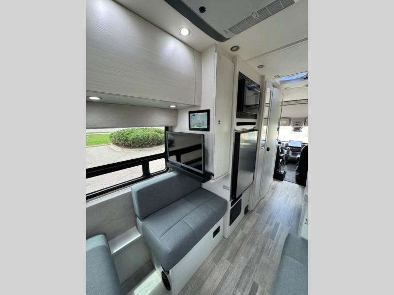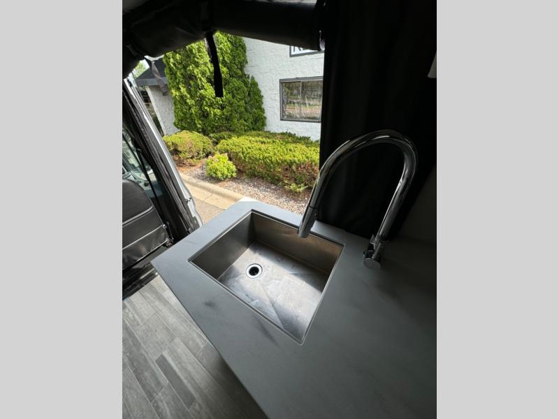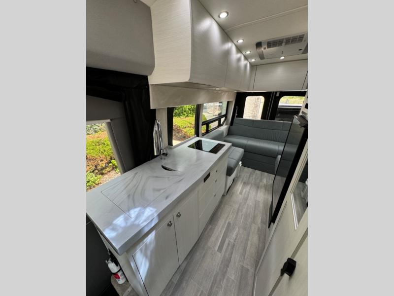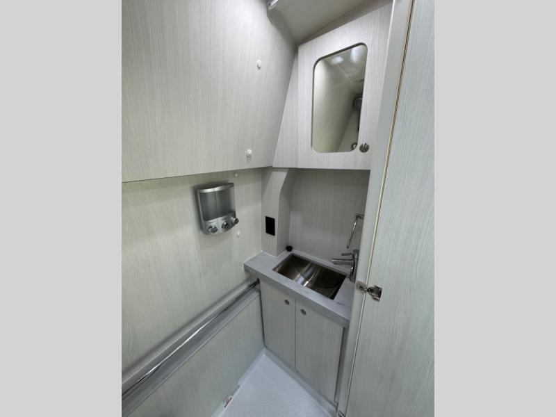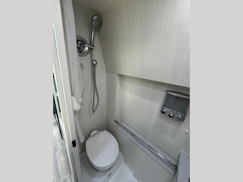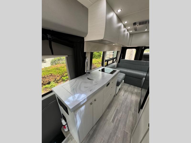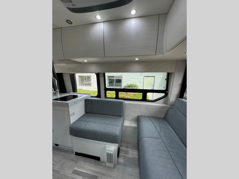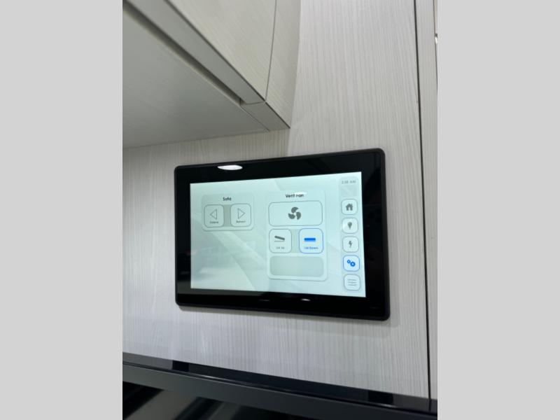 This 2.2 Ontour model is similar to model 2.0, but with a larger refrigerator, and more storage space in the bath. The rear power sofa converts to a 68" x 76" queen-sized bed with memory foam cushions for all-around comfort and the wet bath allows you to clean up each day. There is also a vanity with storage, a sink, and a Corian countertop in the bath for added convenience. Prepare meals either on the one burner induction stove top or in the microwave oven and clean up will be a breeze with a stainless steel sink that includes a high-arc faucet.