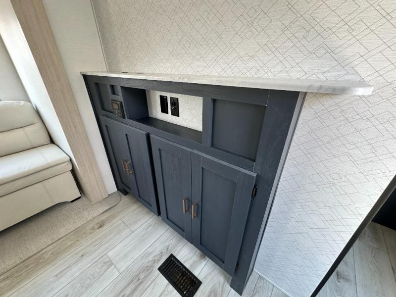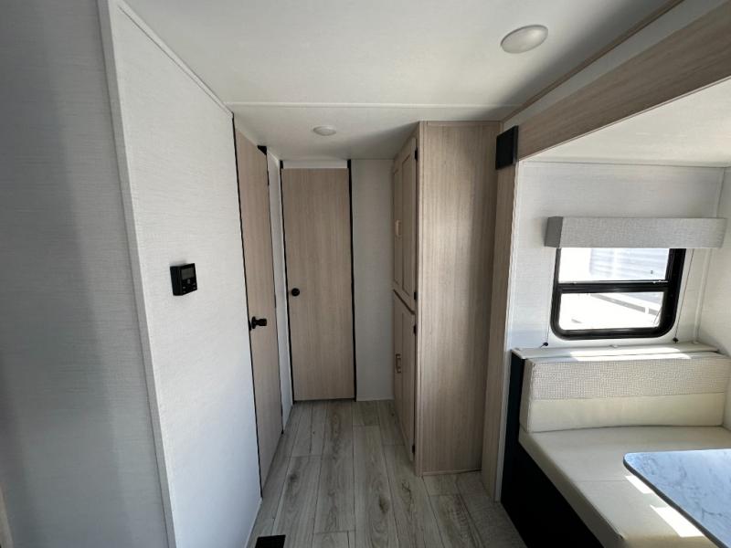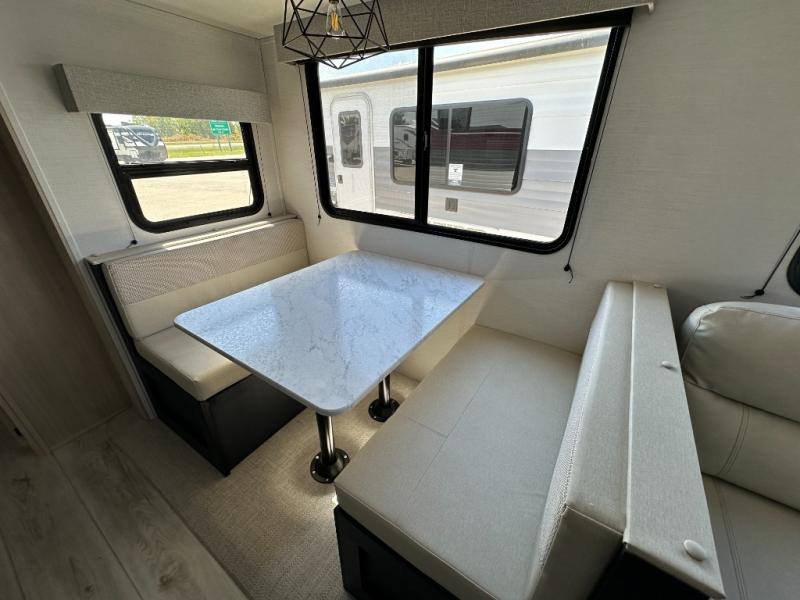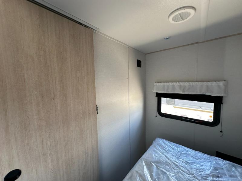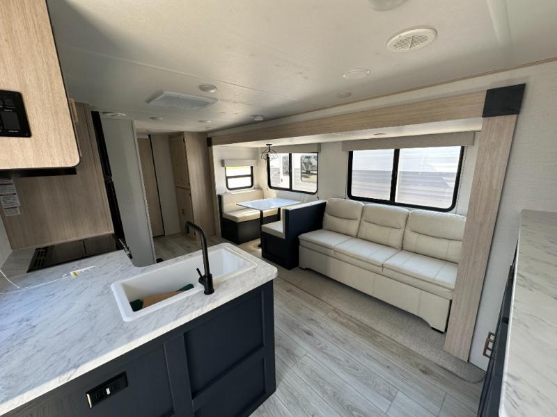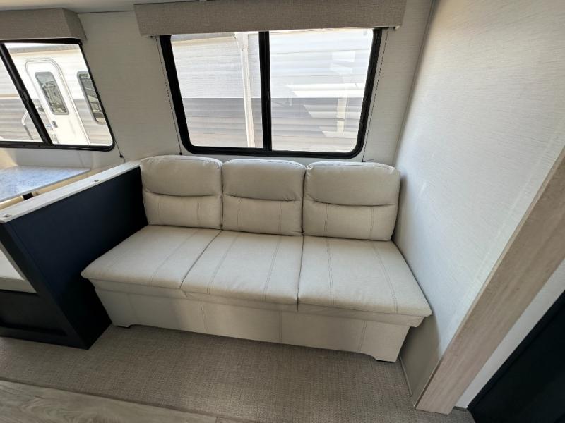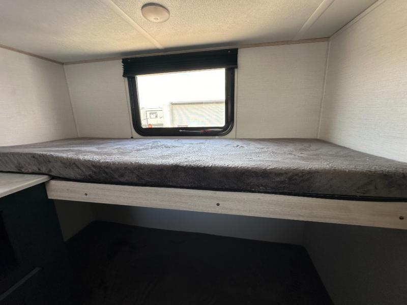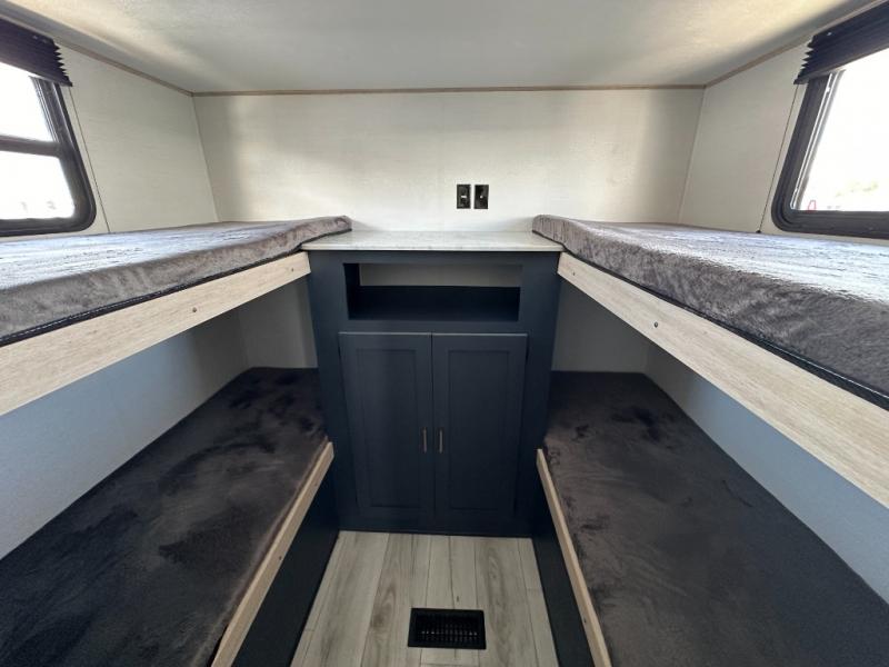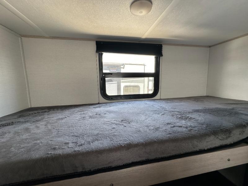 Get ready for outdoor fun and inside comforts and privacy in this trailer! The rear private bunkhouse features four bunk beds with a wardrobe in between which is perfect for keeping the room tidy. The front private bedroom offers a walk-around queen bed along with dual wardrobes and an overhead shelf to place more items. The large slide will provide the space you desire when inside relaxing, and even while preparing meals in the kitchen, there is ample room for movement throughout. A booth dinette and sofa create seating for several which is perfect for meals, game playing, or when entertaining your family and friends. And you can have some sleep on the furniture as well.