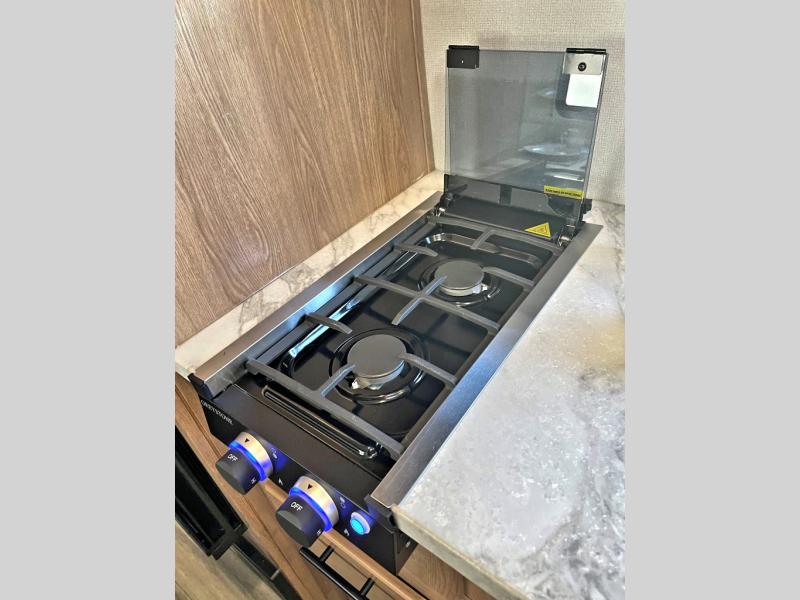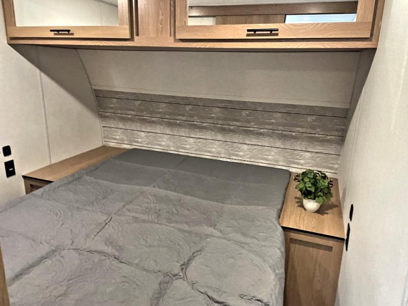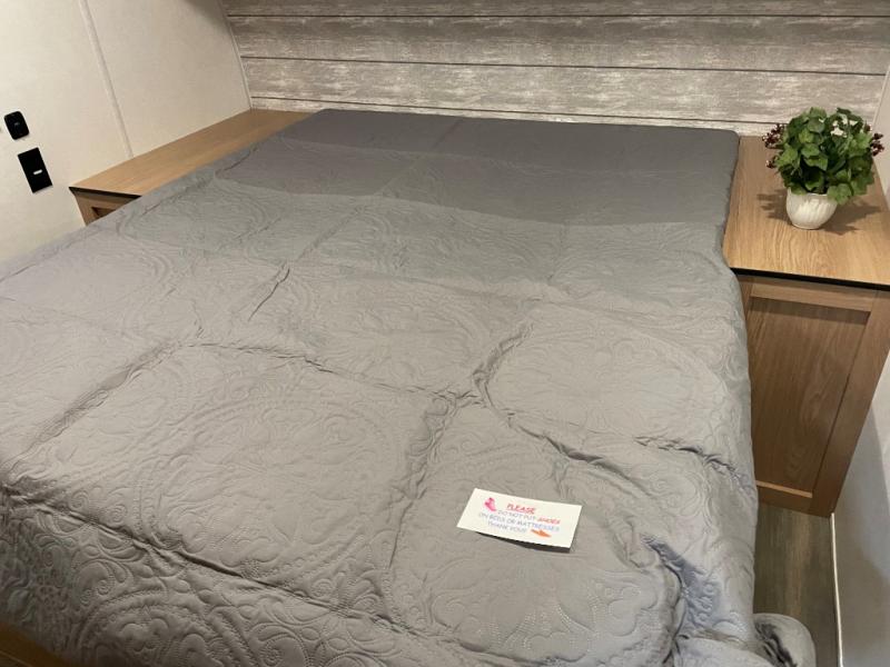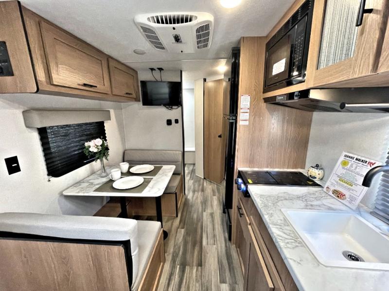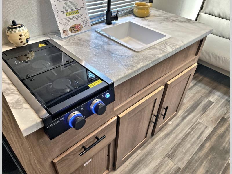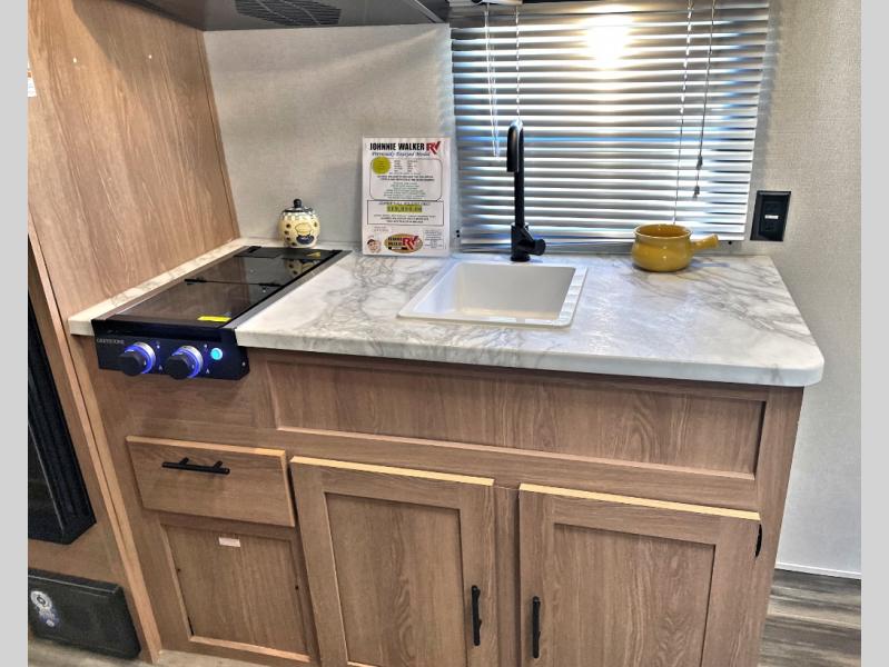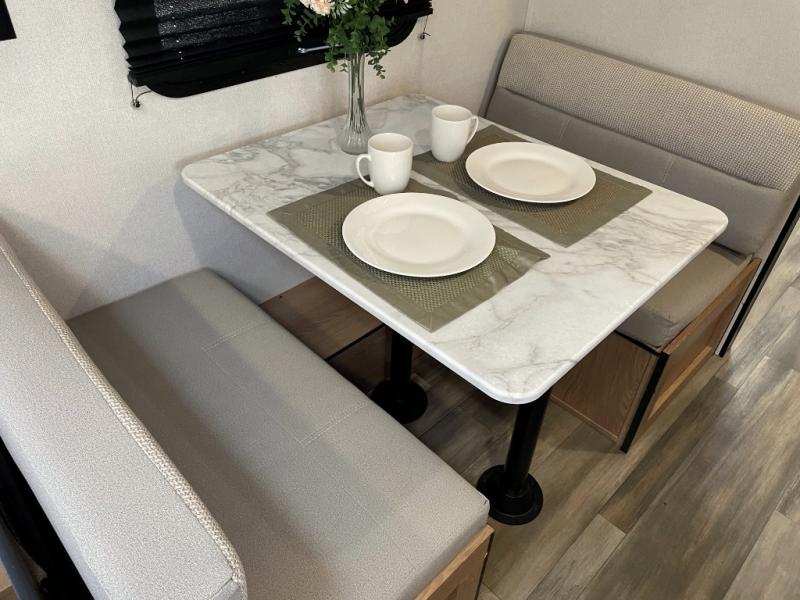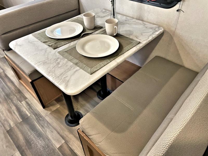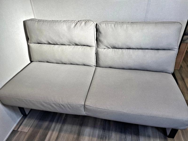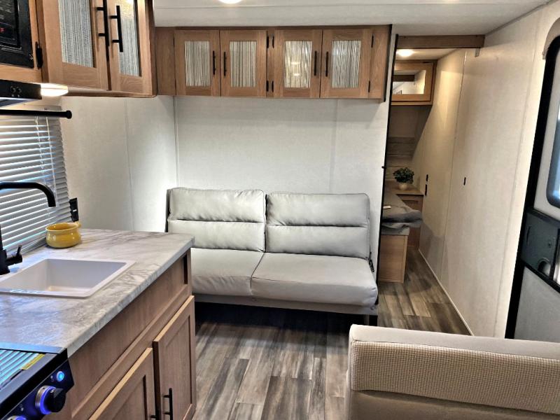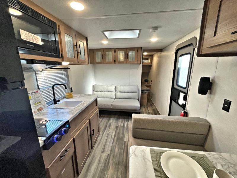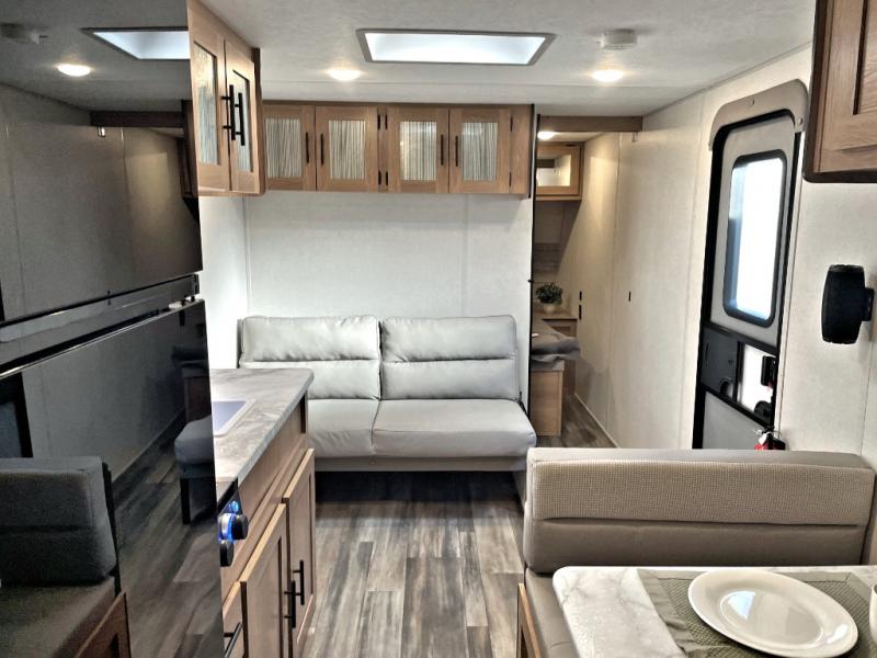The whole family will love camping in this travel trailer! and you can sleep on the queen bed inside the front private bedroom. They can even invite a friend or two to tag along and sleep on the sofa or booth dinette when you aren't using it to enjoy a meal prepared with the three burner cooktop. Everyone can freshen up in the rear corner bathroom with the shower that has a skylight above for added natural lighting as you get ready, plus there is a kitchen skylight too. Store all of your outdoor gear inside the front exterior pass-through storage.