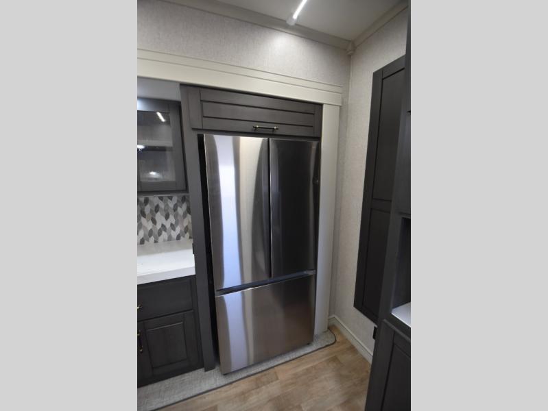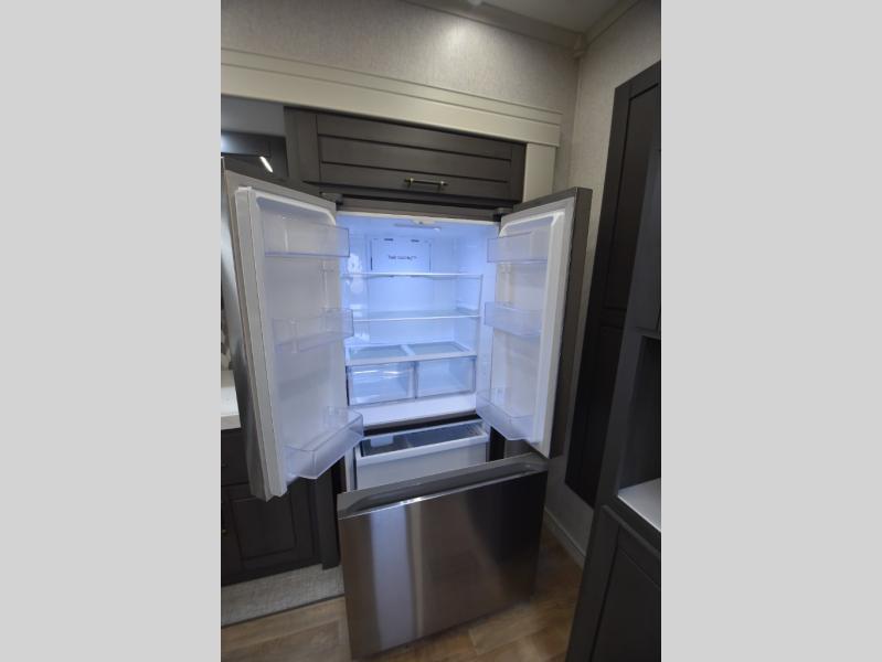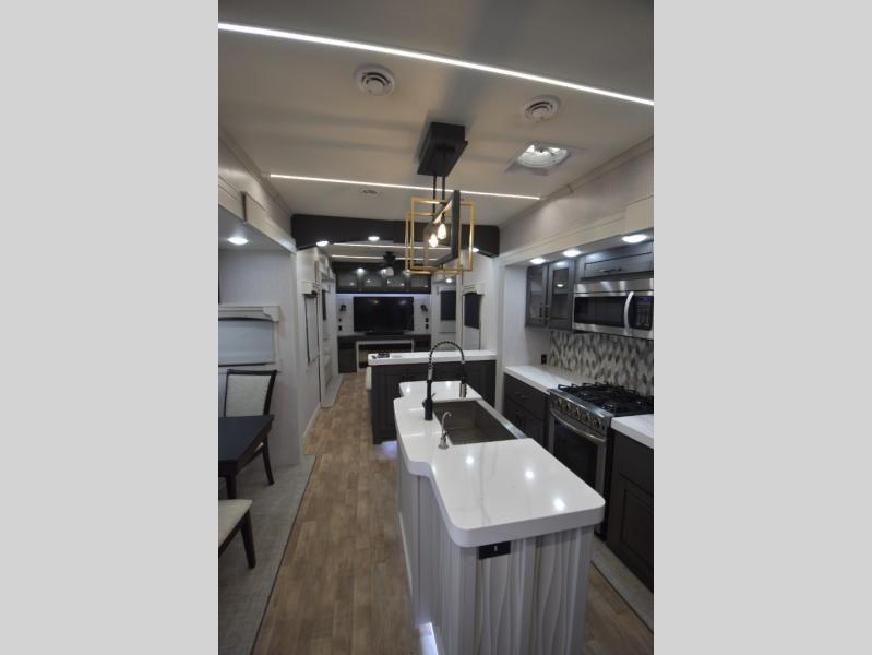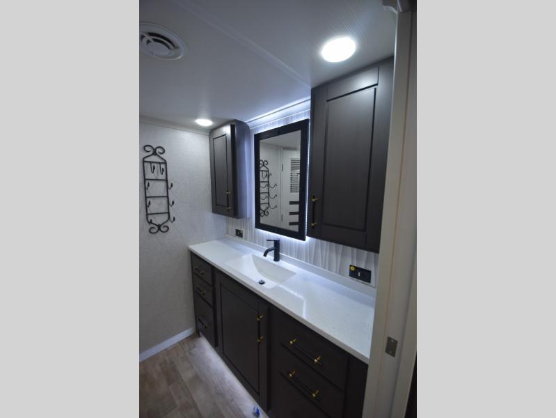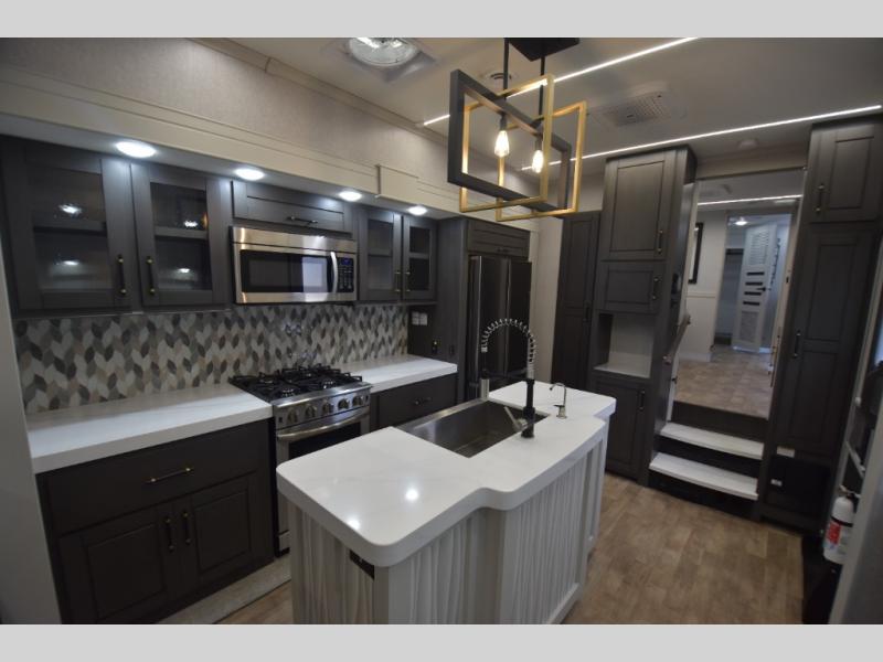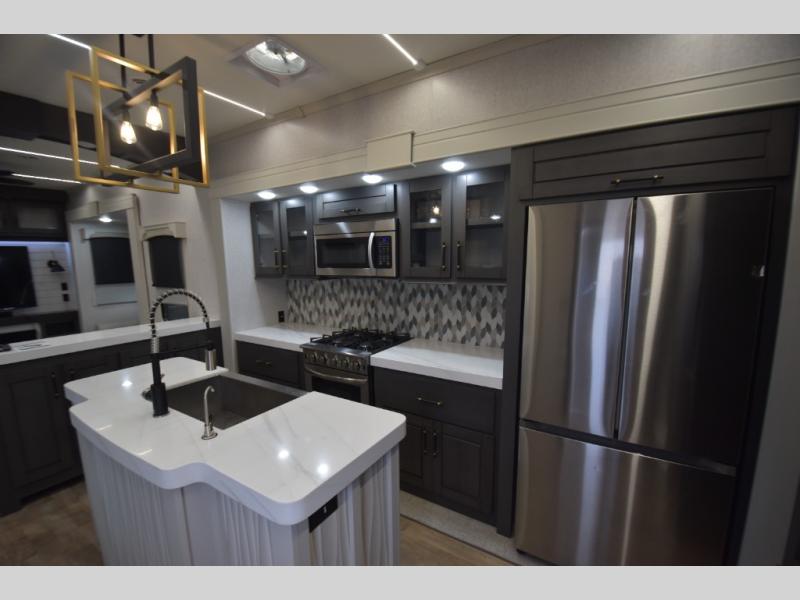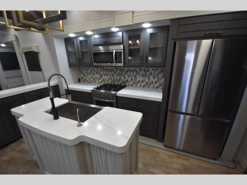 - Gourmet Kitchen: Enjoy cooking on the go with a full-sized refrigerator, a high-end convection microwave, a three-burner cooktop, a large pantry, and a beautiful kitchen island with a farmhouse sink.