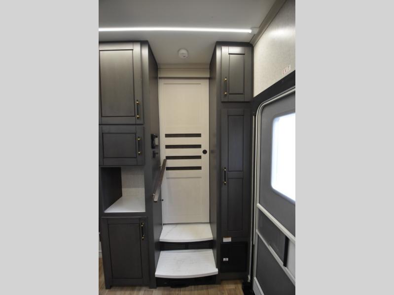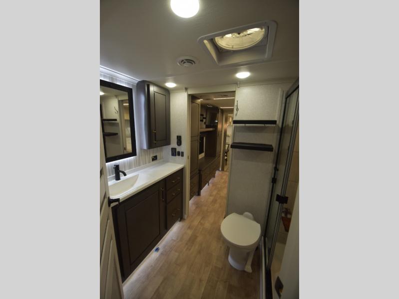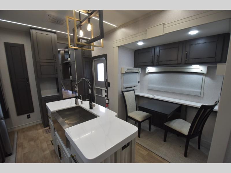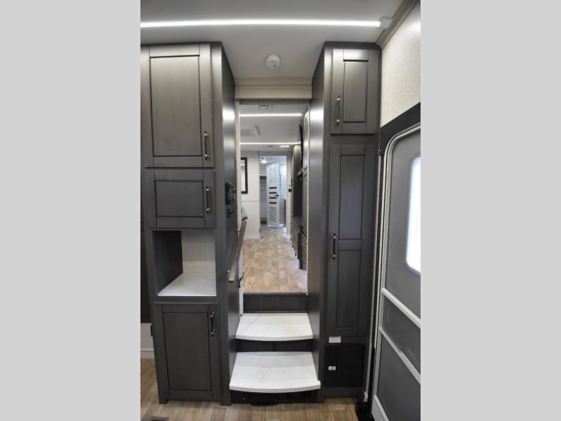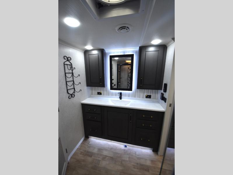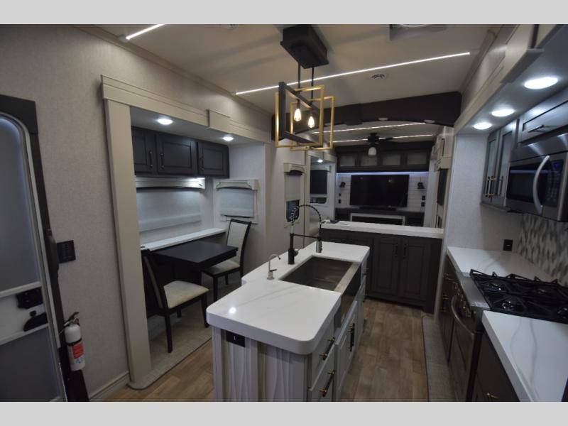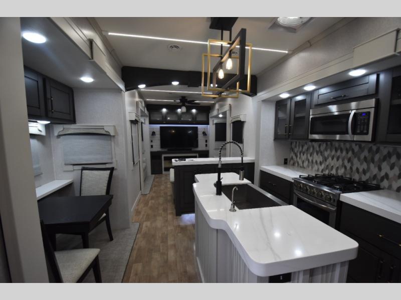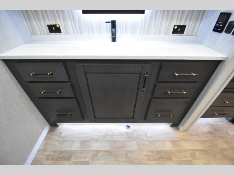 - Gourmet Kitchen: Enjoy cooking on the go with a full-sized refrigerator, a high-end convection microwave, a three-burner cooktop, a large pantry, and a beautiful kitchen island with a farmhouse sink.