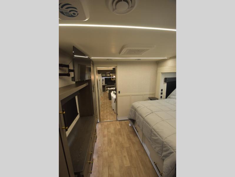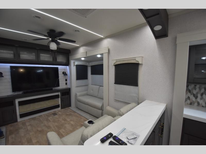 - Elegant Rear Den Layout: The spacious rear living area features theater seating, a tri-fold sofa, and a premium entertainment center with a large LED TV and a cozy fireplace for relaxing evenings.