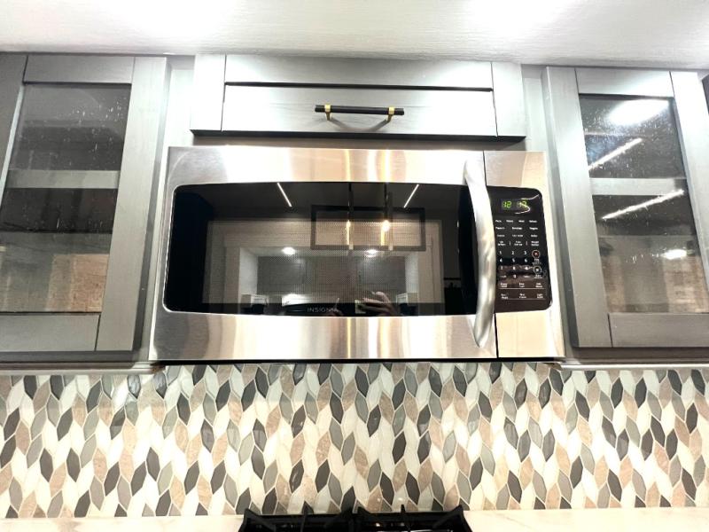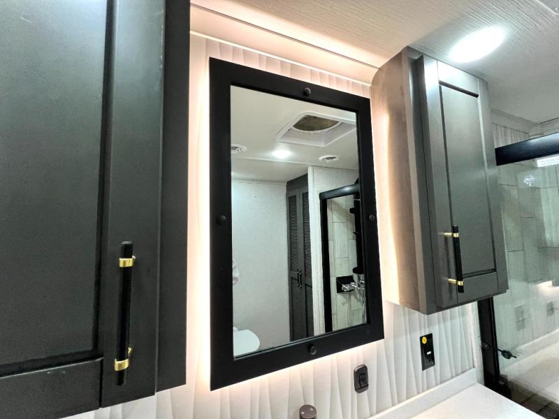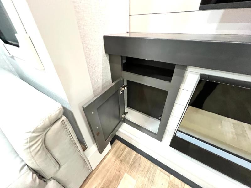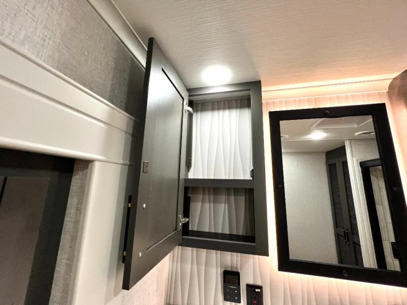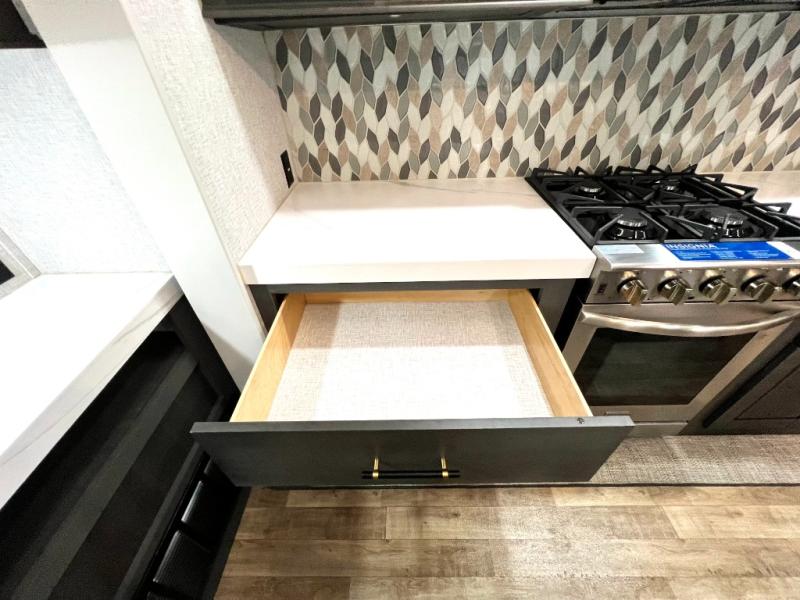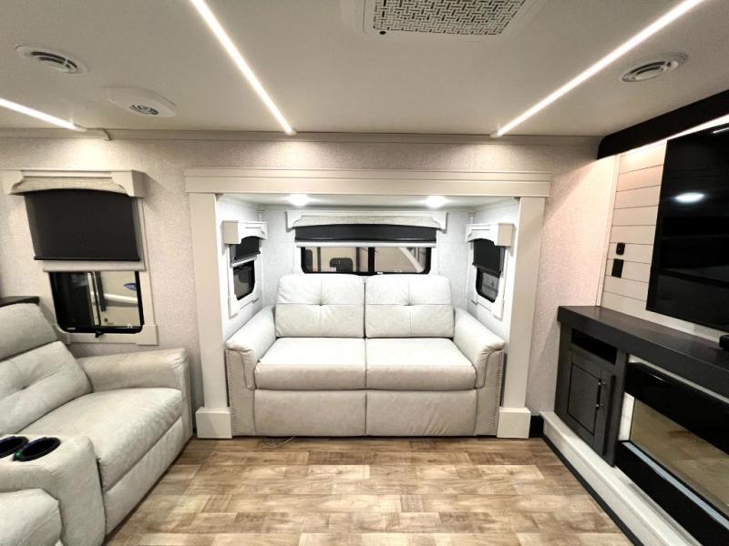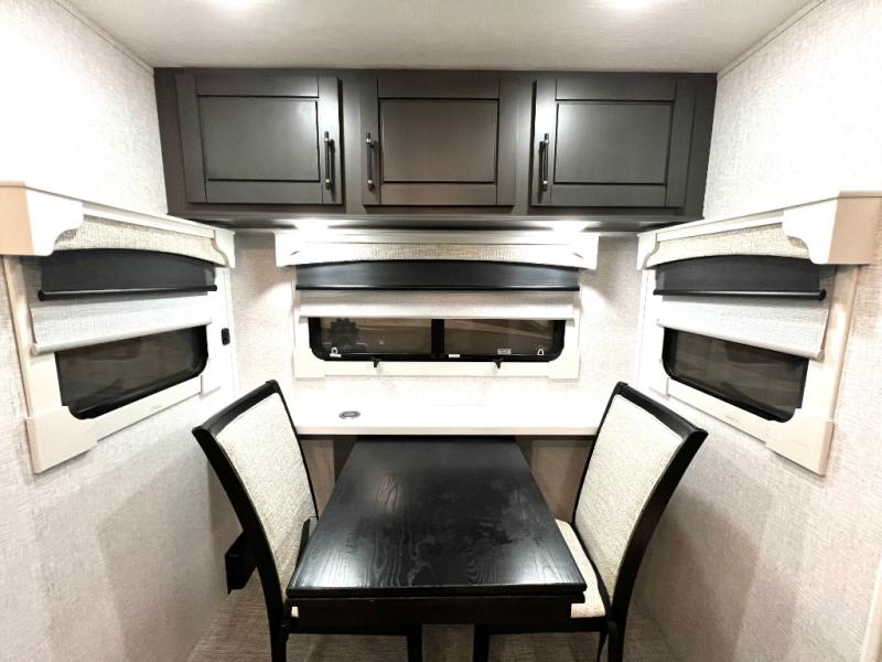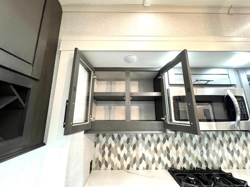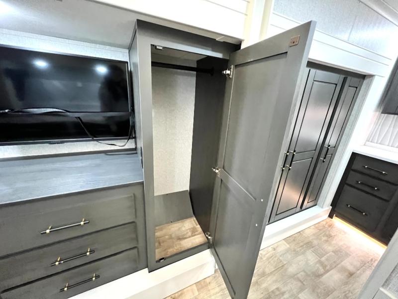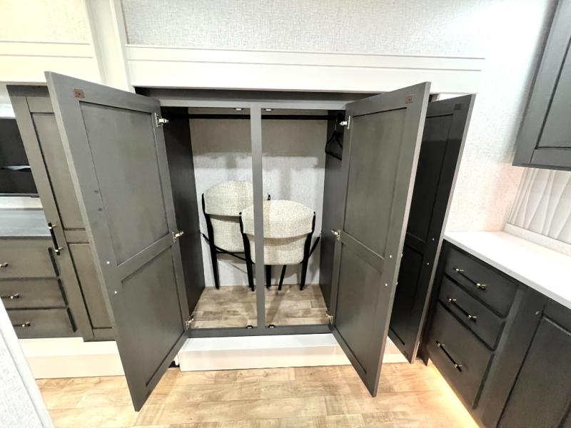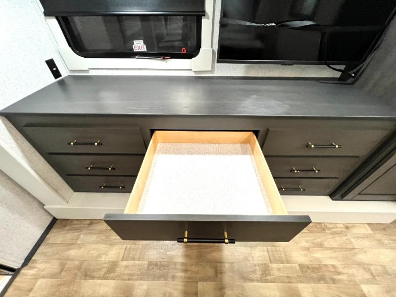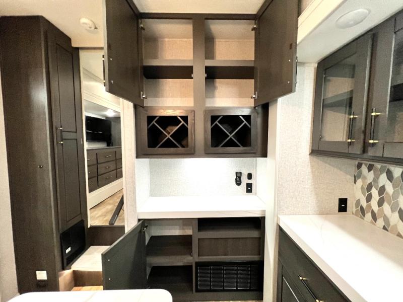 You are going to wish you found the Redwood fifth wheels sooner! With all of the residential comfort and modern luxury, you will be impressed. The Williamsburg Furniture Collection includes two premium dinette chairs, a buffet-style adjustable dinette with leaf extension, a residential-style sofa, and powered theater seating. The luxury further extends to the bedroom where you will find a gel-foam king bed with tilt and C-PAP shelves on both sides of the bed. The straight roof line gives a luxury profile, and there are preparations for a wireless backup camera as well as solar power. The seamless residential insulated heat ducts will efficiently heat your unit, and there is an exterior radio in the fully finished and heated pass-through with slat board storage.