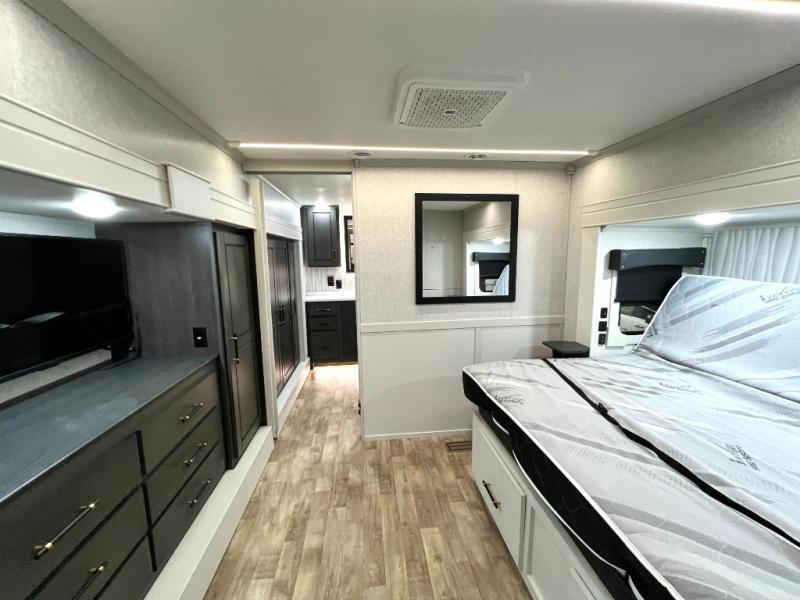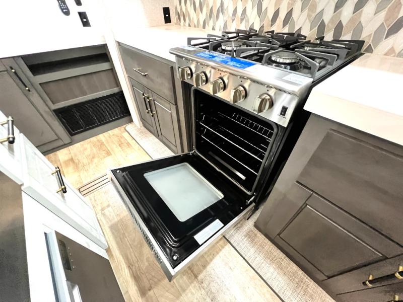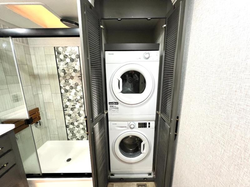If luxury and space is what you are after, this Redwood with a front living area and six slides is calling your name! The main entry leads into a large kitchen with all of the amenities to enjoy; a dinette with a buffet, a large island with a sink, a pantry for your dry and canned goods, plus a 22 cu. ft. refrigerator. You will also enjoy cooking on the provided 4-burner range with 3.7 cu. ft. oven and convection microwave overhead. There is ample counter space for food prep, plus a bar top counter just before you head up to the front living area as well. This living space features two of the six slides with each housing a sleeper sofa. There is also theater seating for two and an entertainment center with 65" TV for your viewing pleasure. Back through the kitchen, head up a step to the master suite with king bed slide, and large dresser/40" TV/wardrobe and linen slide opposite. The rear bath is not only spacious thanks to the help of the curbside slide, but you will find two medicine cabinets, a 48" shower, and a washer/dryer closet all ready if you choose that option!