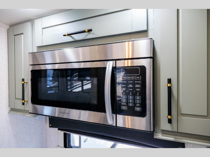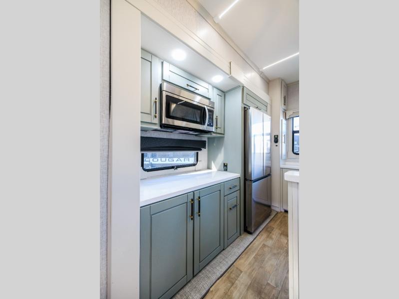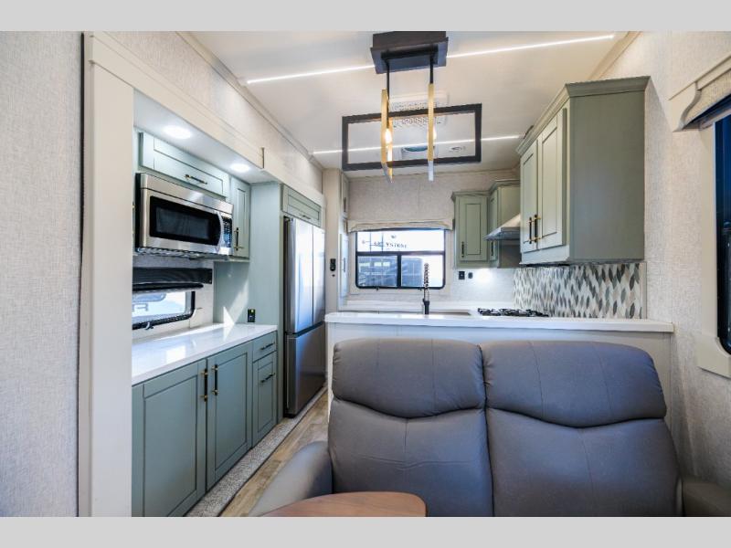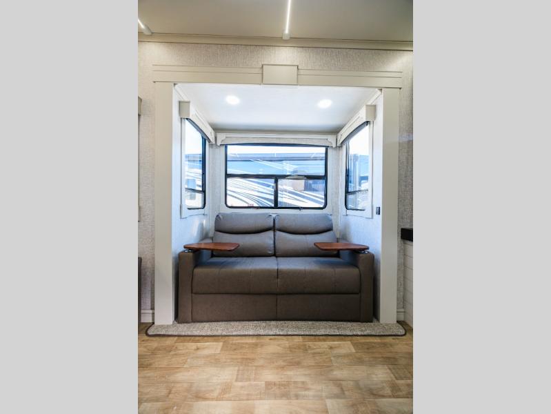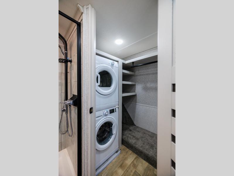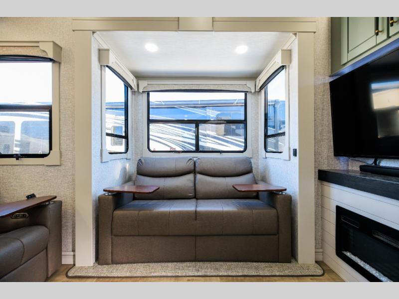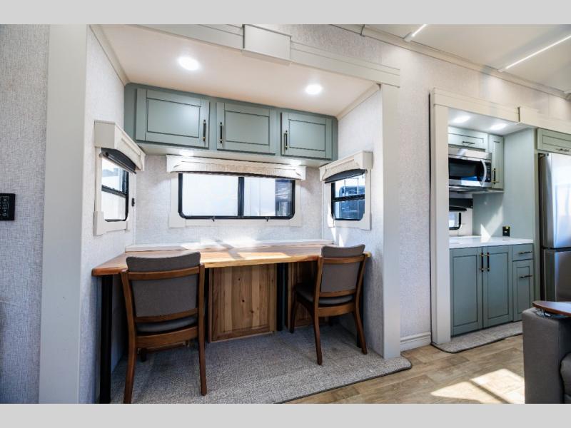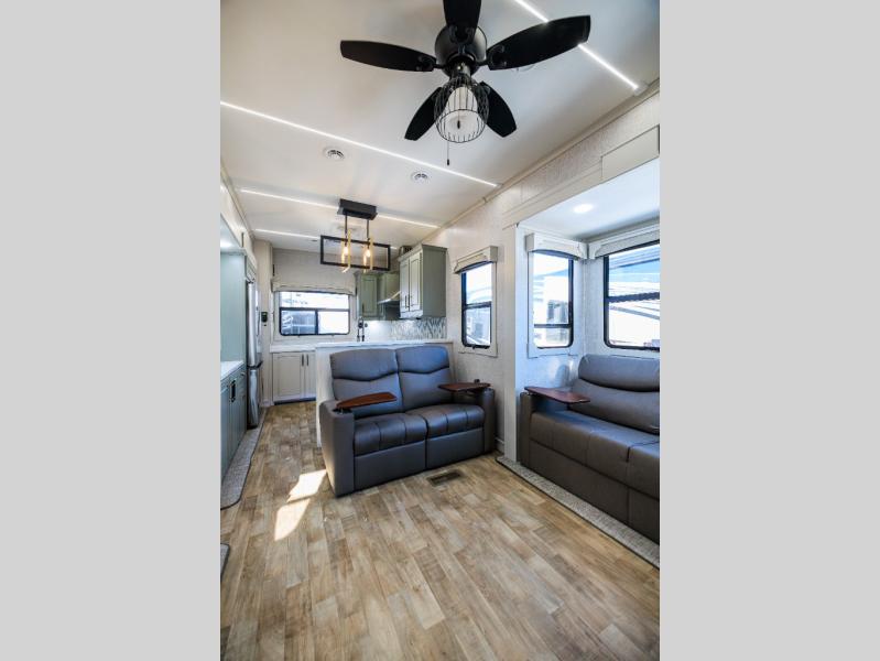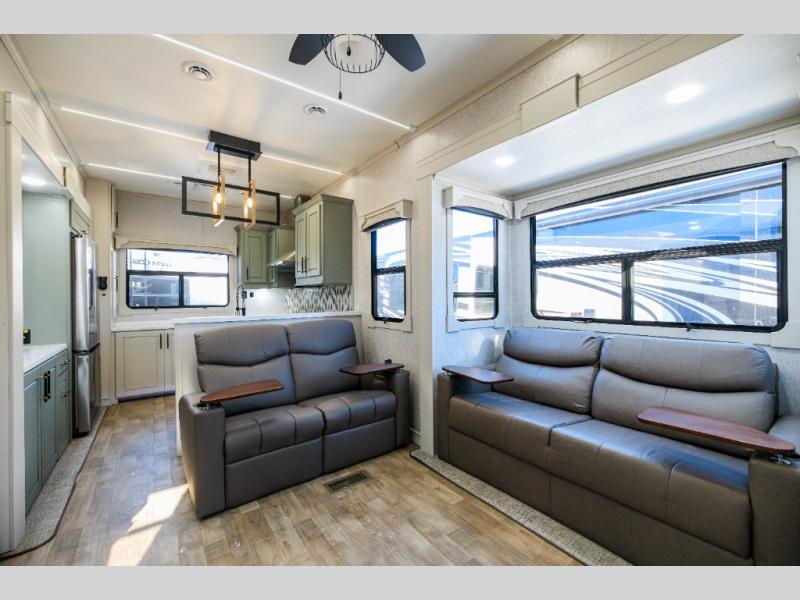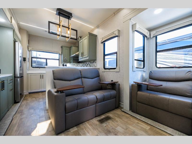 One step inside this fifth wheel and you'll see why it's an award-winning most-popular unit! You'll love the rear kitchen that includes ample countertop for food prep and a slide including the refrigerator, pantry and microwave for added moving around space. Head to the main living area where you can enjoy some family time on the theater seats, and the dinette with chairs will be the perfect place for a game of cards. The half bath is right off of this room for convenience, and your guests or kids can convert the tri-fold sofa into a bed for sleeping space at night. You will love the master bedroom with a king bed slide out, a dresser with a flip-up lid, plus a 39" TV. The front full bath is super spacious, and it includes a large walk-in wardrobe where you can even add an optional washer and dryer if you choose!