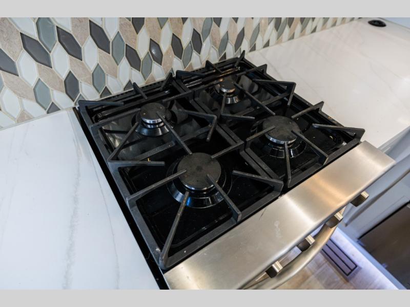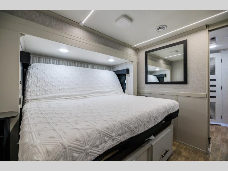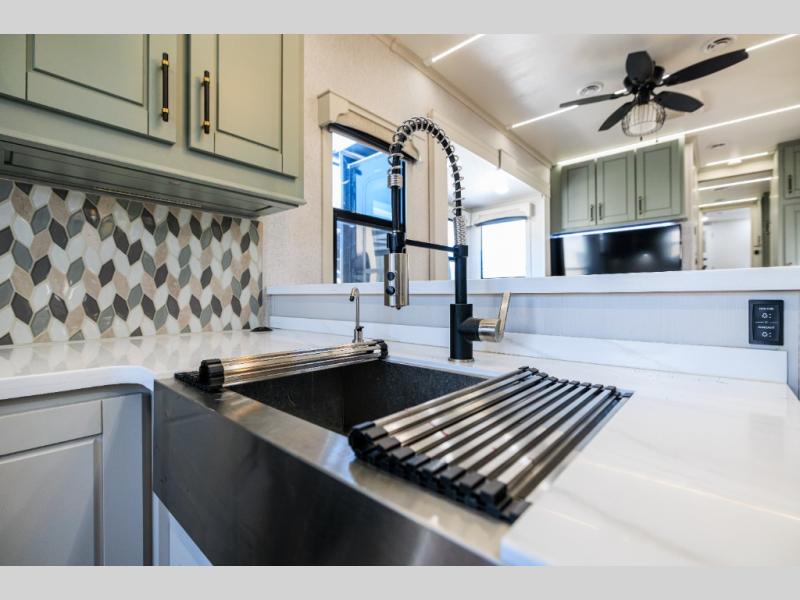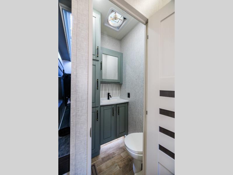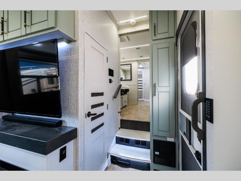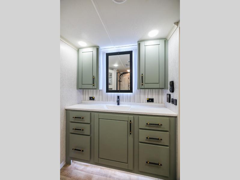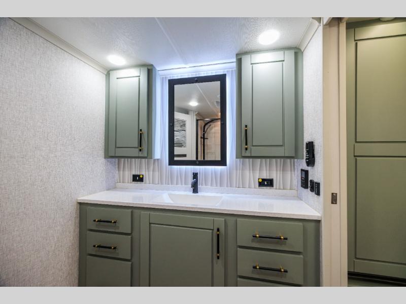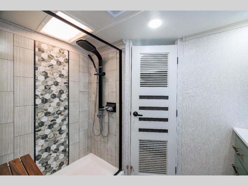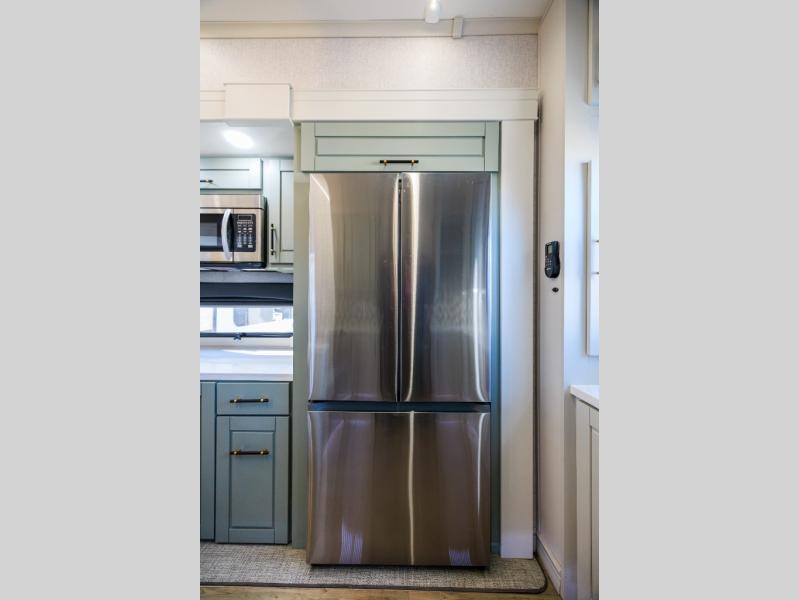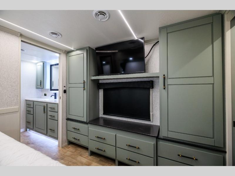 One step inside this fifth wheel and you'll see why it's an award-winning most-popular unit! You'll love the rear kitchen that includes ample countertop for food prep and a slide including the refrigerator, pantry and microwave for added moving around space. Head to the main living area where you can enjoy some family time on the theater seats, and the dinette with chairs will be the perfect place for a game of cards. The half bath is right off of this room for convenience, and your guests or kids can convert the tri-fold sofa into a bed for sleeping space at night. You will love the master bedroom with a king bed slide out, a dresser with a flip-up lid, plus a 39" TV. The front full bath is super spacious, and it includes a large walk-in wardrobe where you can even add an optional washer and dryer if you choose!