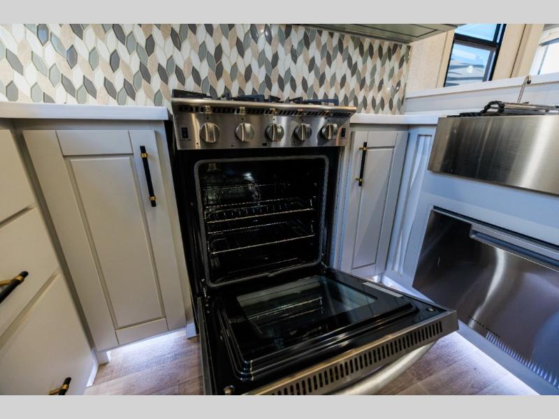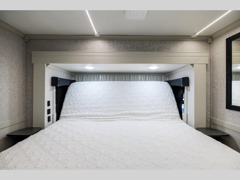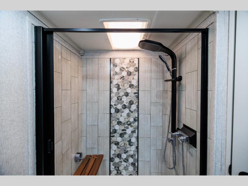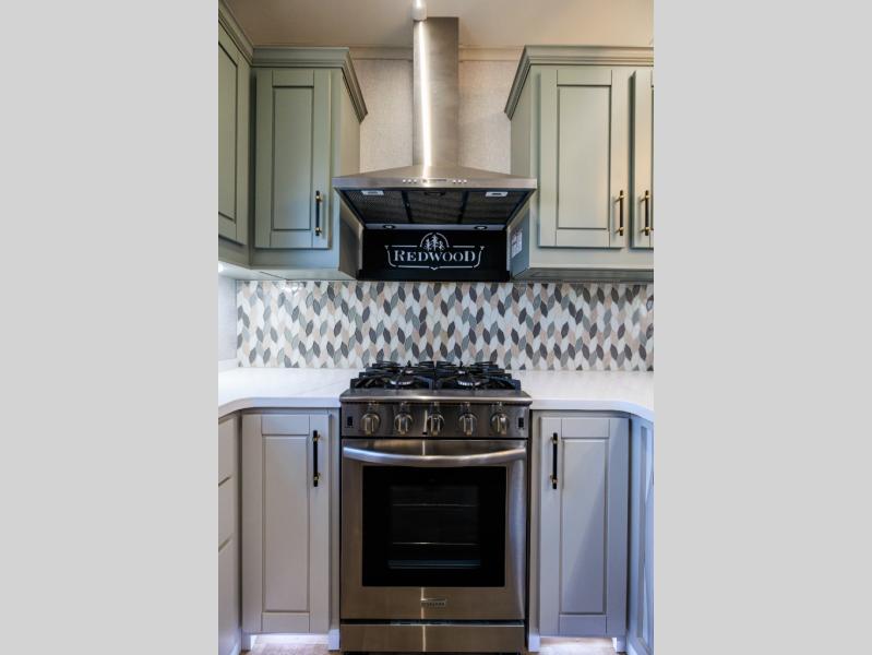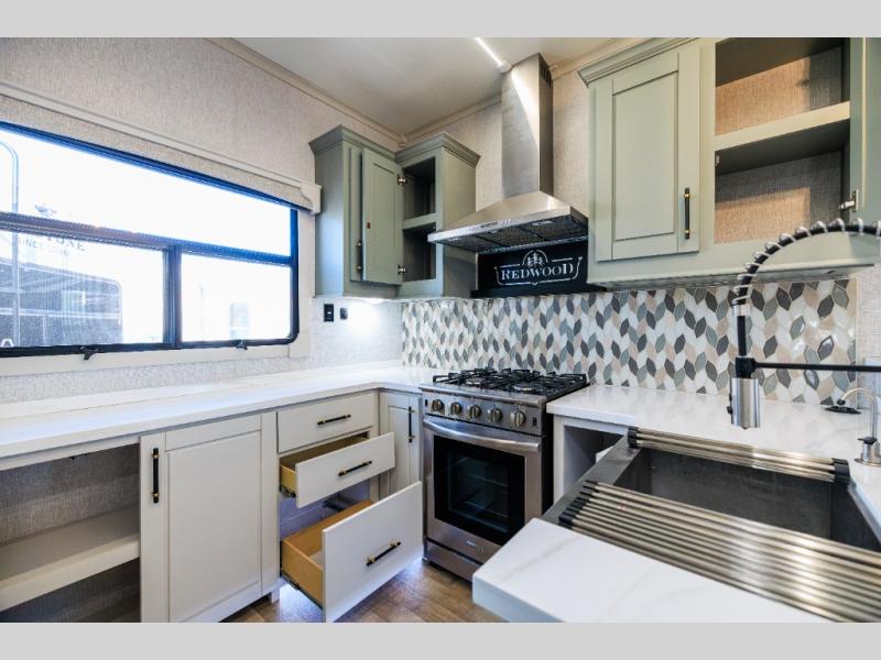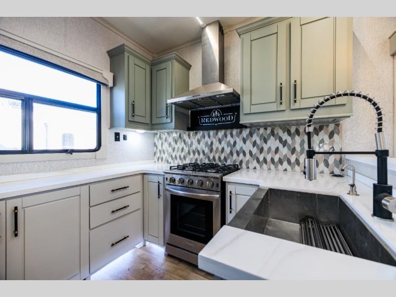 You are going to wish you found the Redwood fifth wheels sooner! With all of the residential comfort and modern luxury, you will be impressed. The Williamsburg Furniture Collection includes two premium dinette chairs, a buffet-style adjustable dinette with leaf extension, a residential-style sofa, and powered theater seating. The luxury further extends to the bedroom where you will find a gel-foam king bed with tilt and C-PAP shelves on both sides of the bed. The straight roof line gives a luxury profile, and there are preparations for a wireless backup camera as well as solar power. The seamless residential insulated heat ducts will efficiently heat your unit, and there is an exterior radio in the fully finished and heated pass-through with slat board storage.